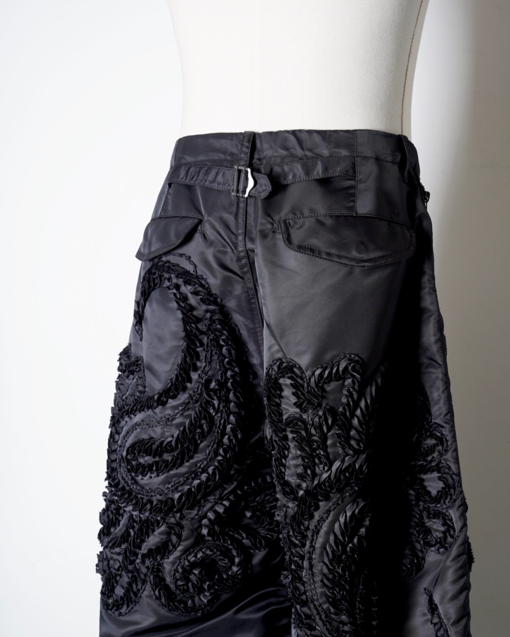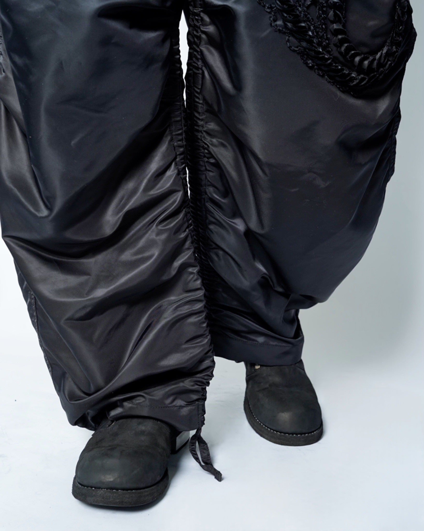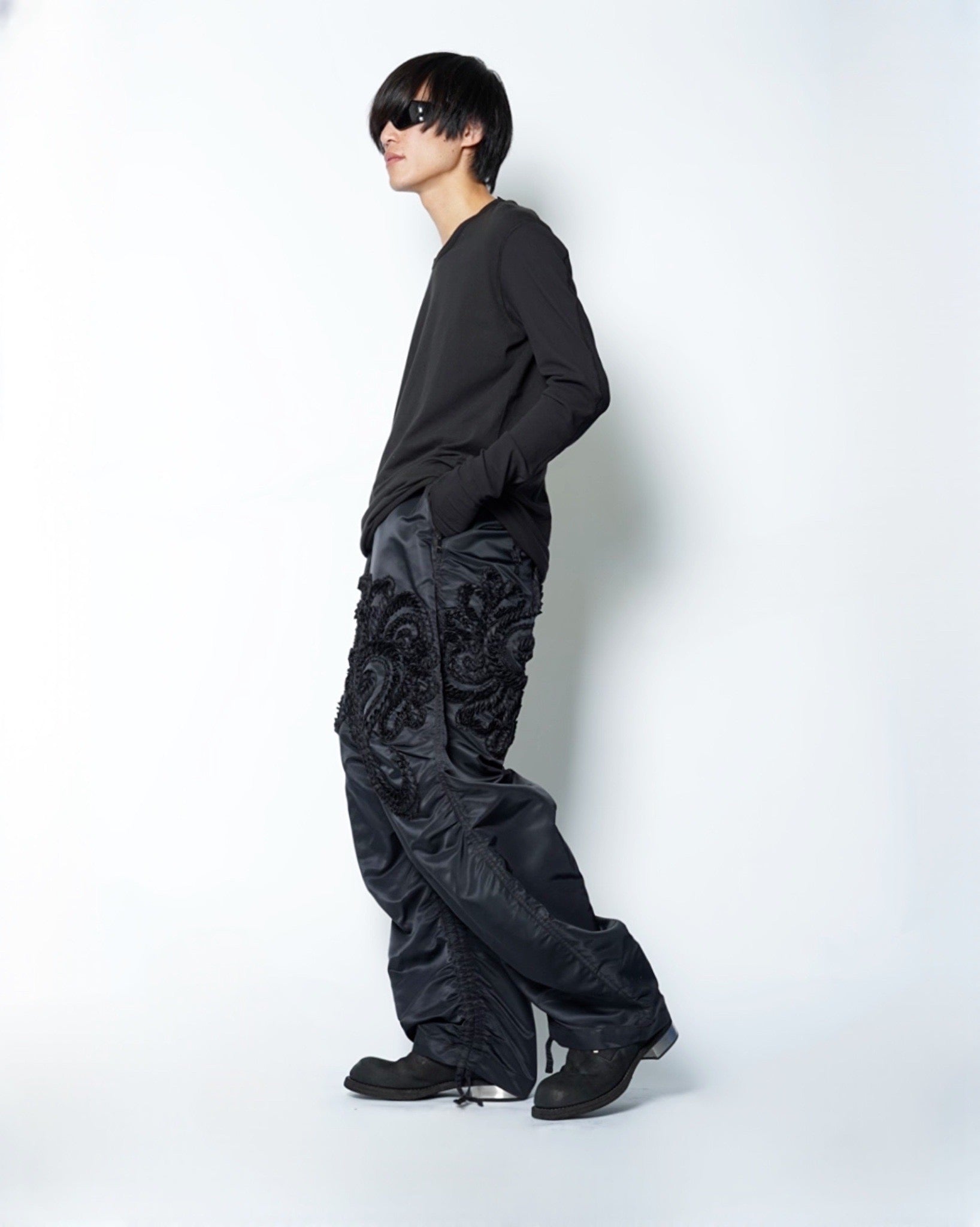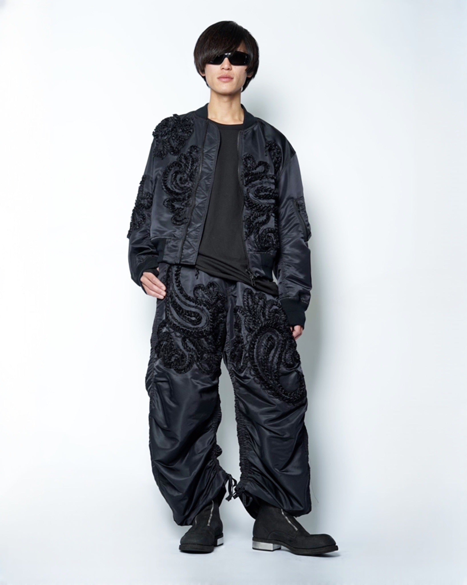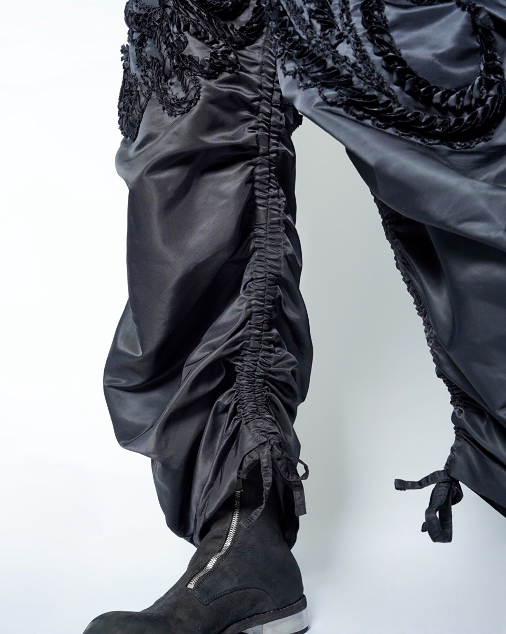 ・ ベースはミリタリー由来のリアルなパラシュートパンツながら、装飾性と構築的な美しさを加え、ウェアを“削る”ようにして柄を浮かび上がらせるような、彫刻的表現に仕上げています。