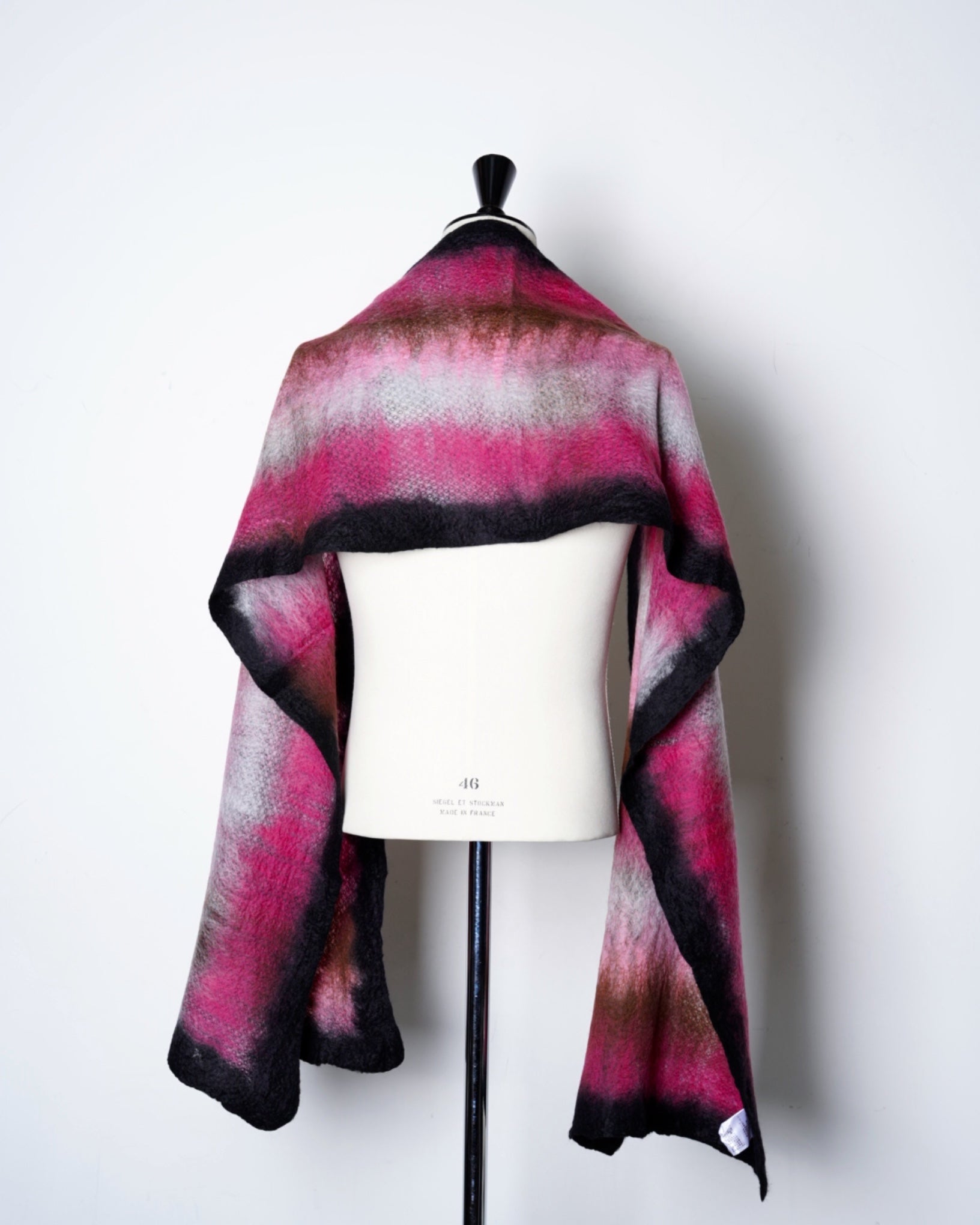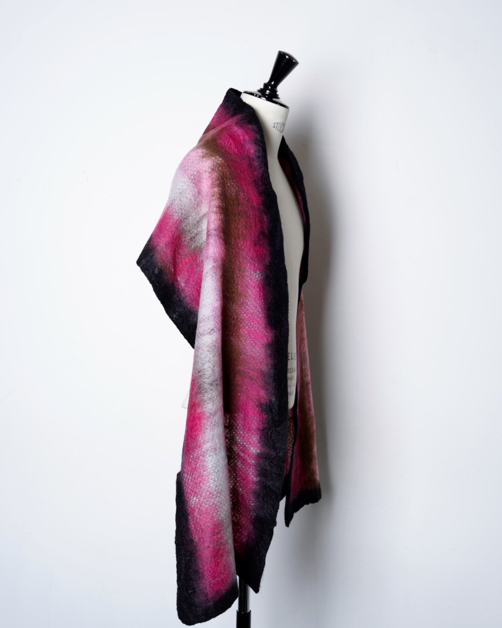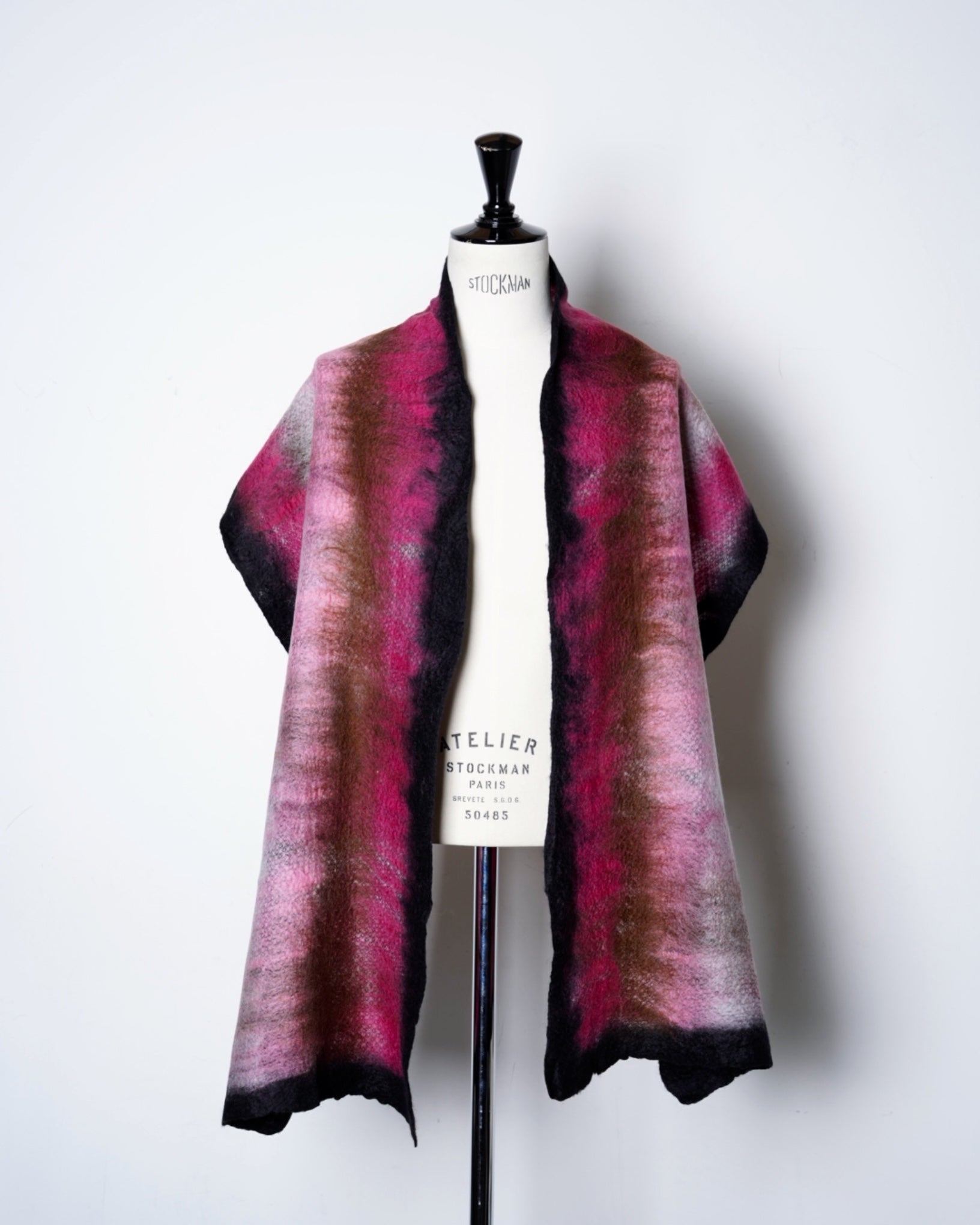 贅を尽くした素材により、ストールの域を超え、そしてフェルトとは思えない驚きの質感と絵画のような色柄をお楽しみくださいませ。