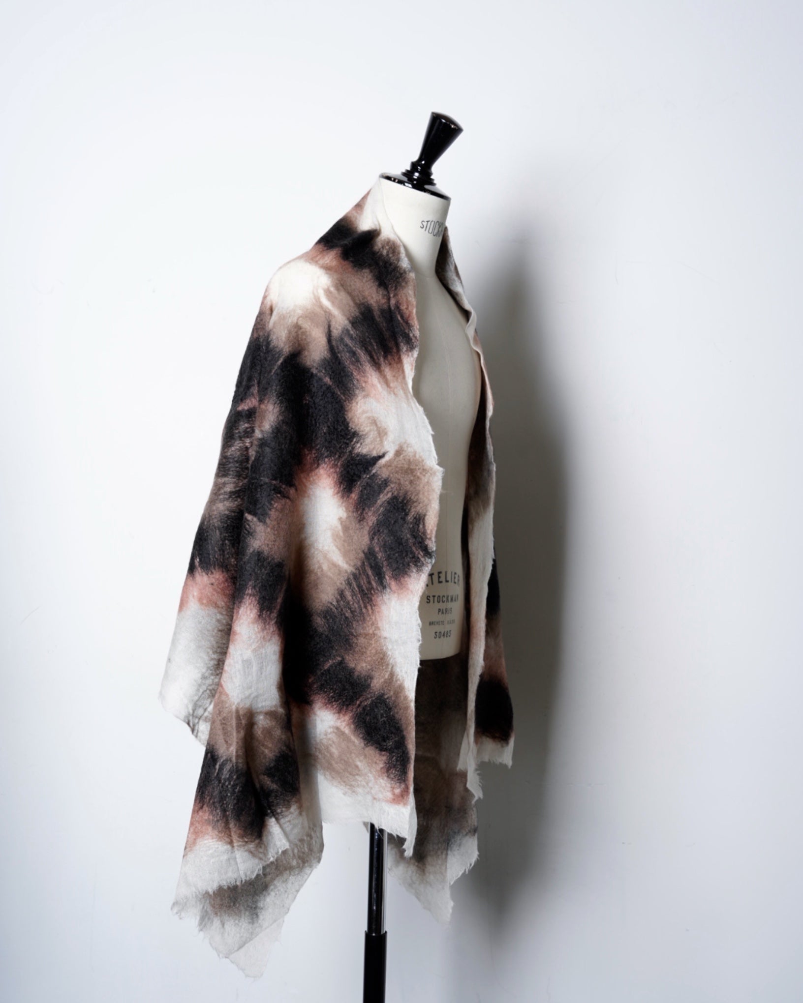 贅を尽くした素材により、ストールの域を超え、そしてフェルトとは思えない驚きの質感と絵画のような色柄をお楽しみくださいませ。