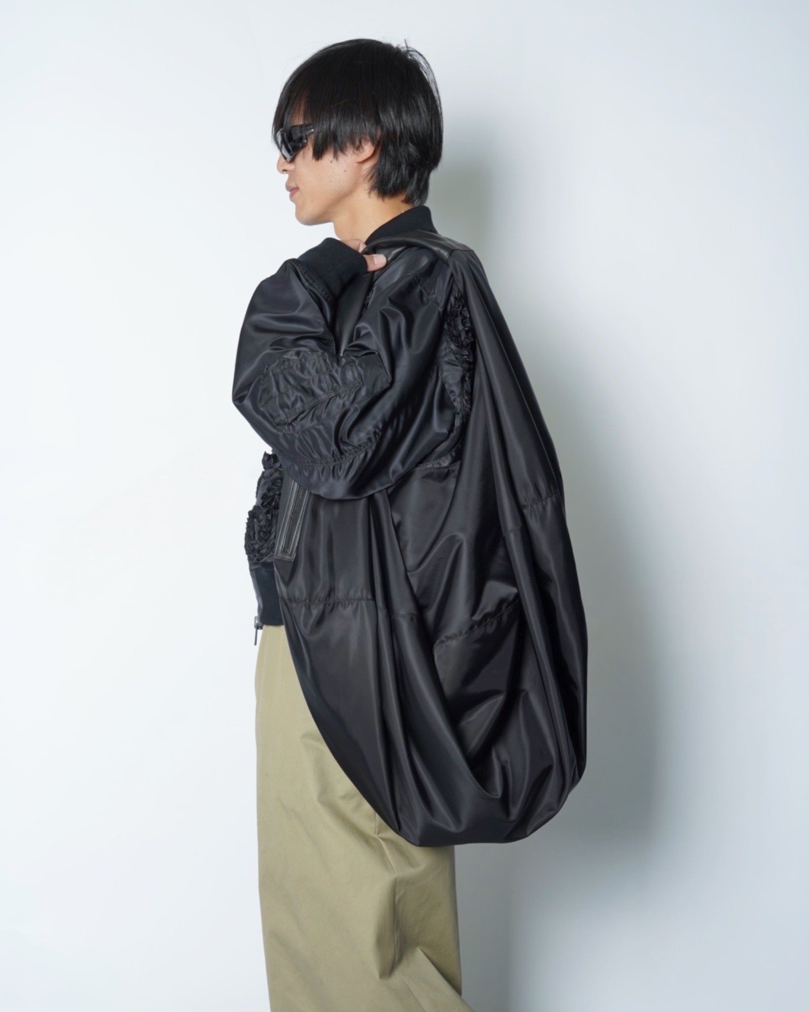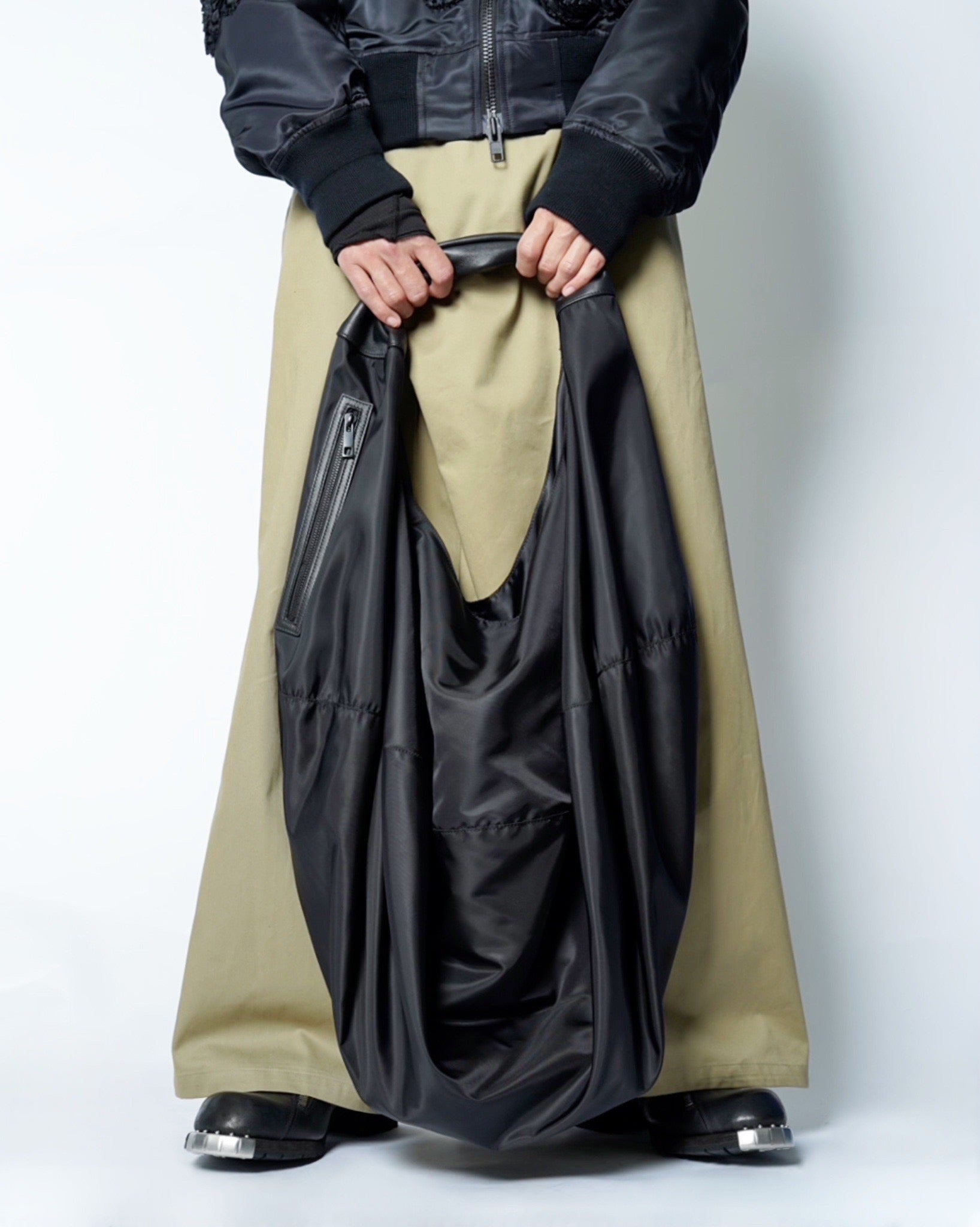・置いた状態のサークルから肩に担ぐことでバッグに変化するデザインとなっており、平面から立体に変化するという、森川氏が過去にデザインを手掛けていたイッセイミヤケの片鱗を感じさせるアイテムに。
