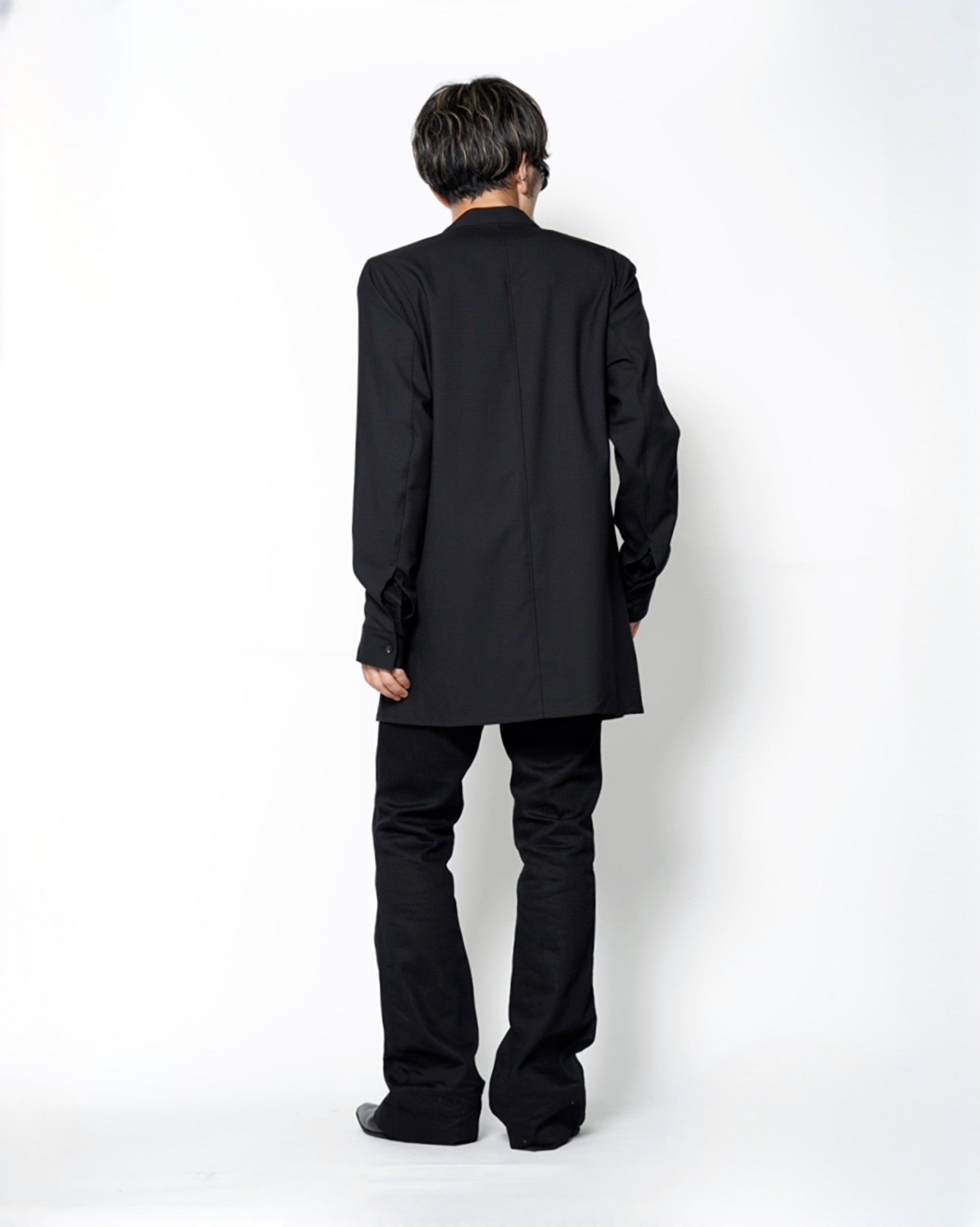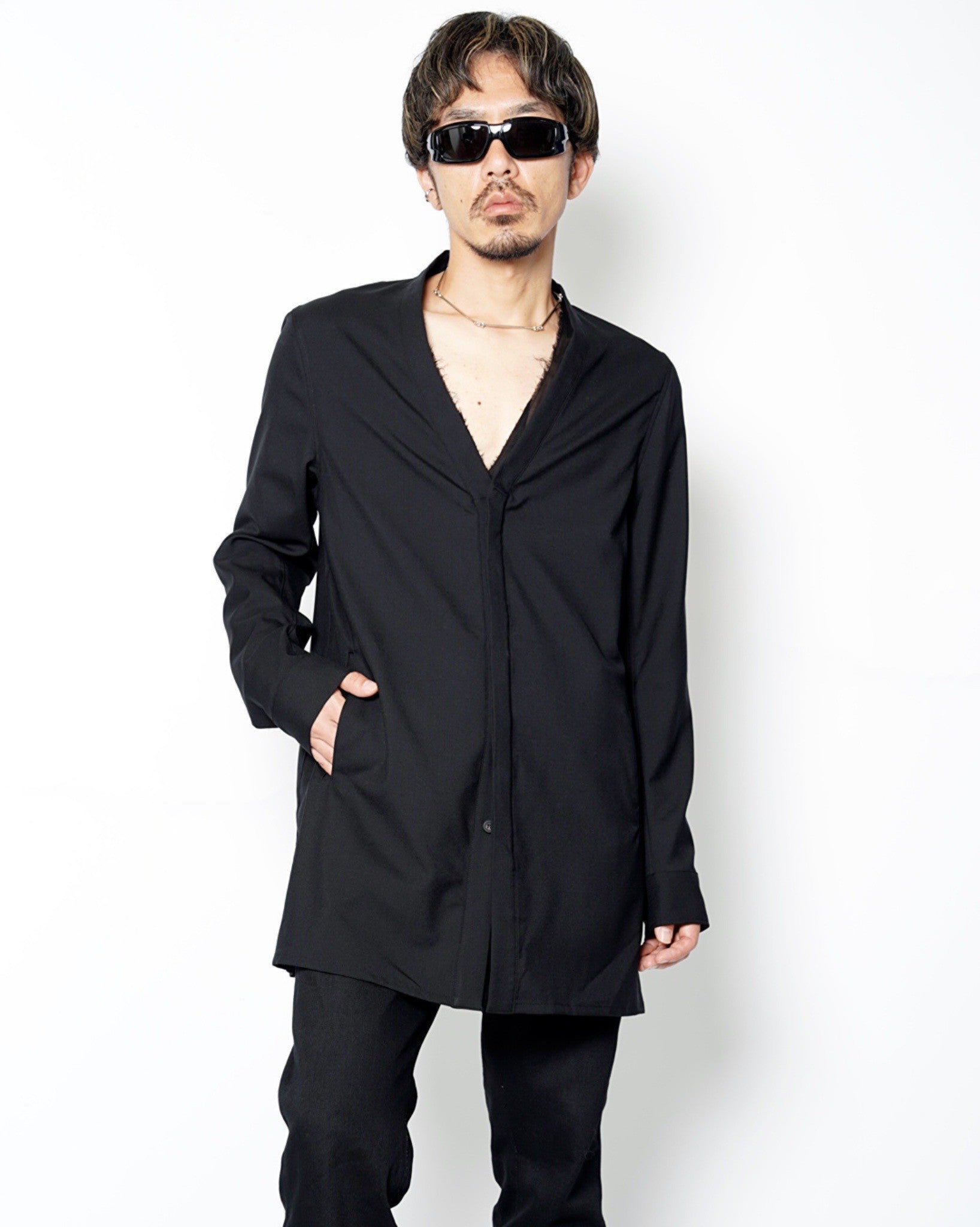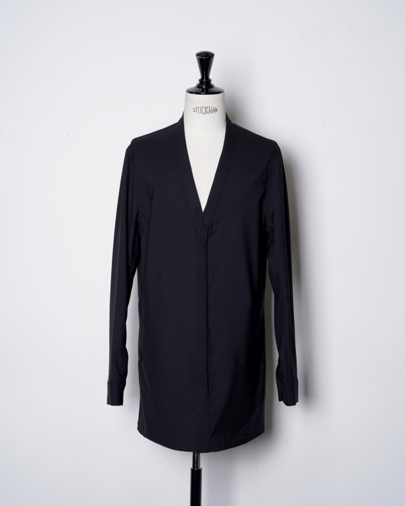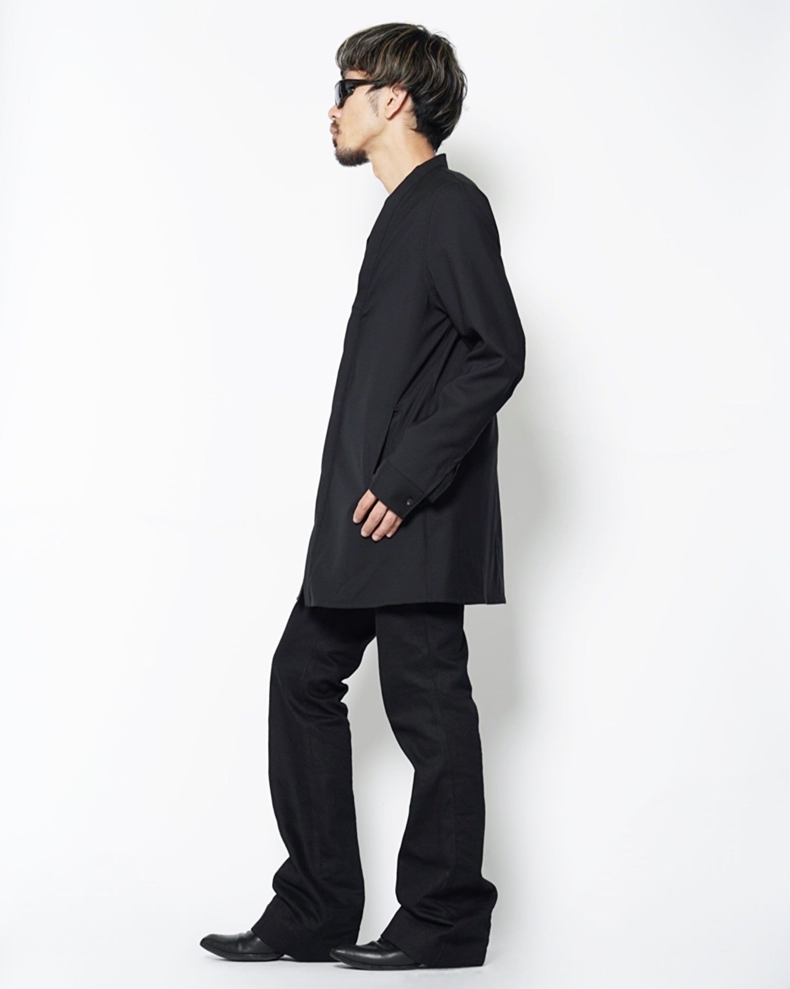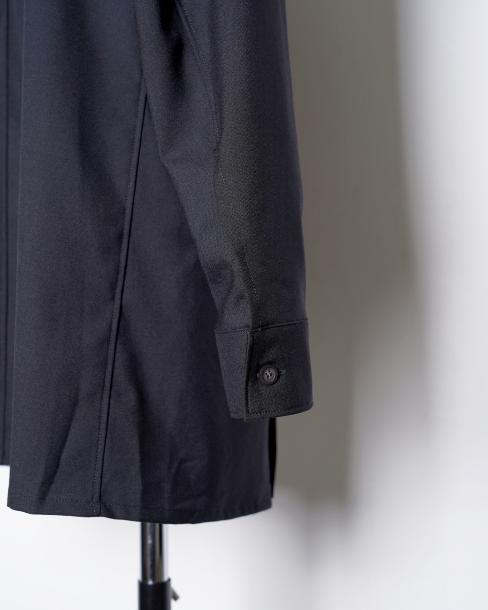 ・シャツとしては長めの丈感となっており、生地の落ち感が活きることで美しい縦のラインを描きます。