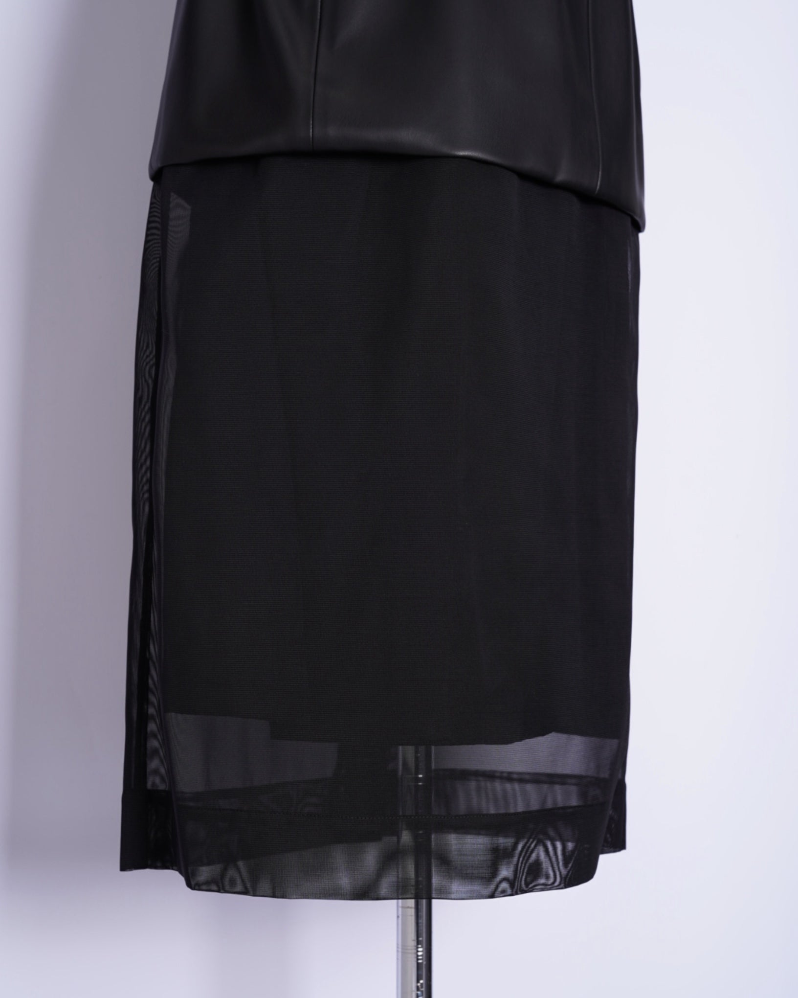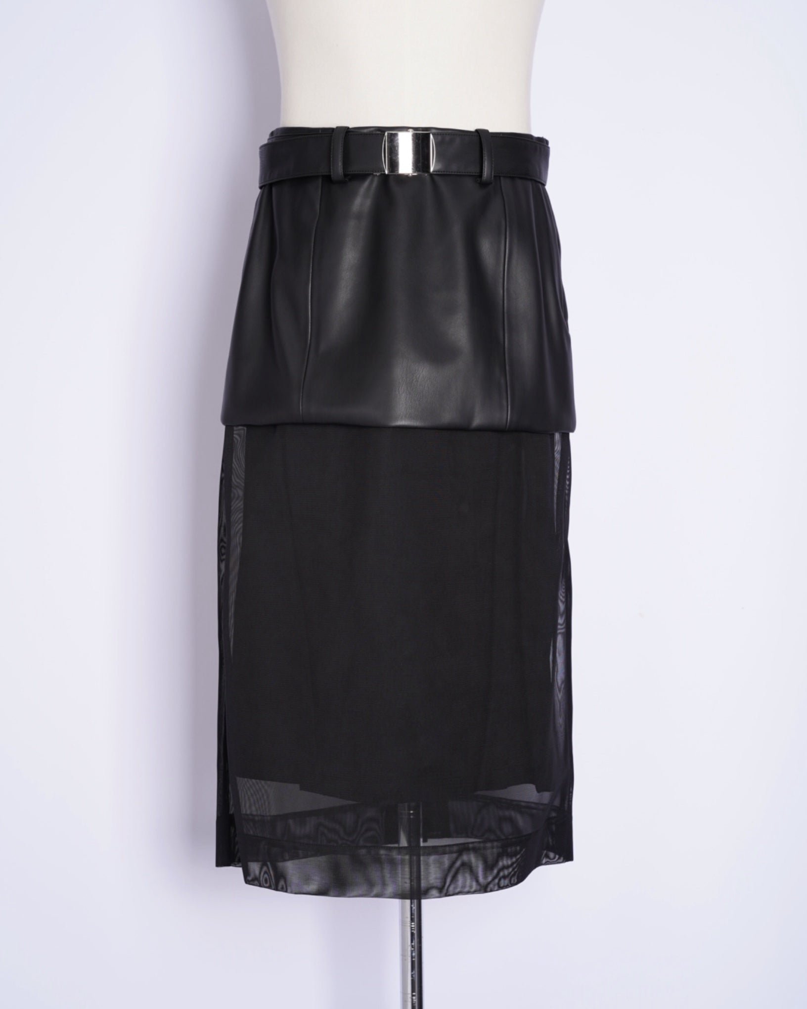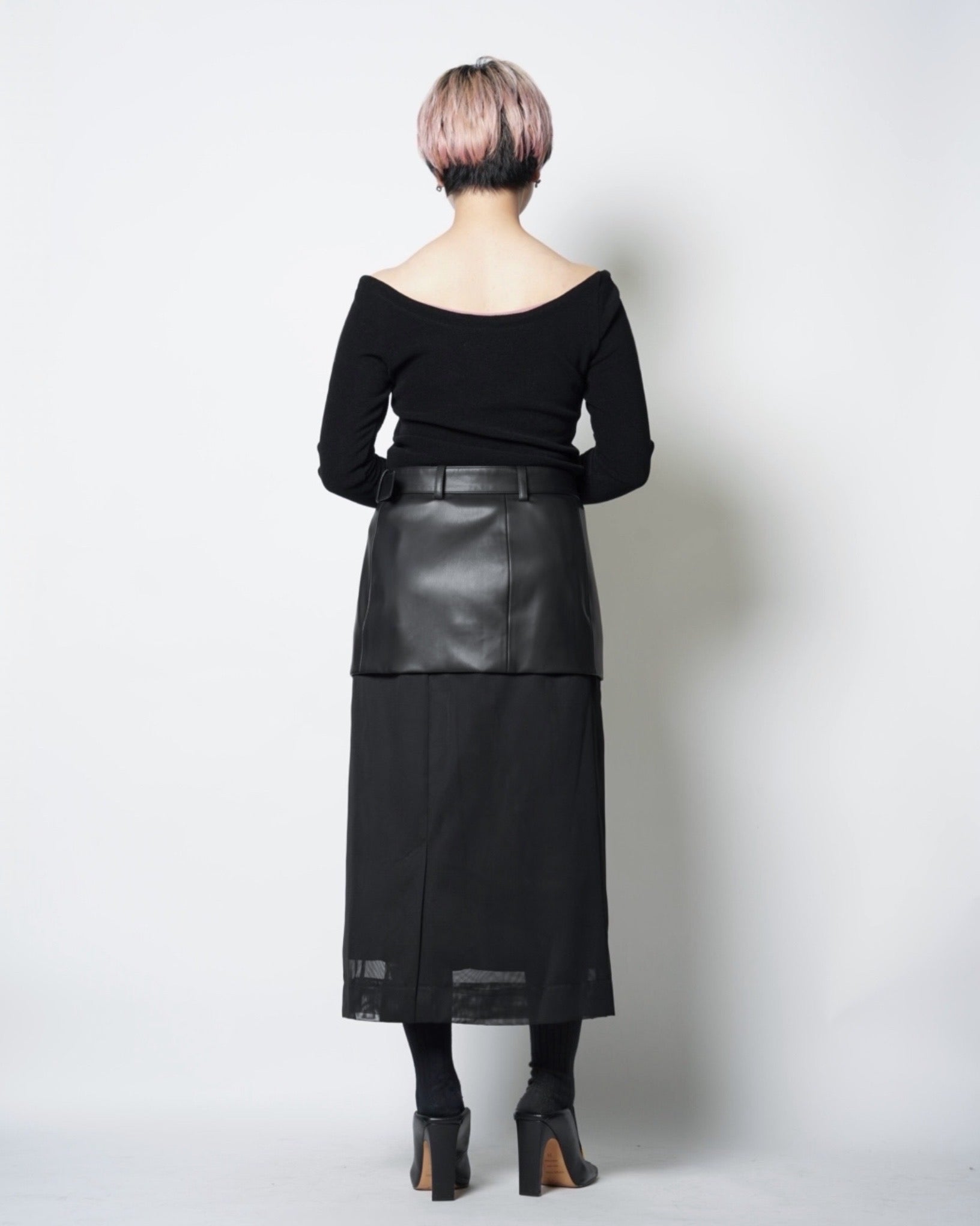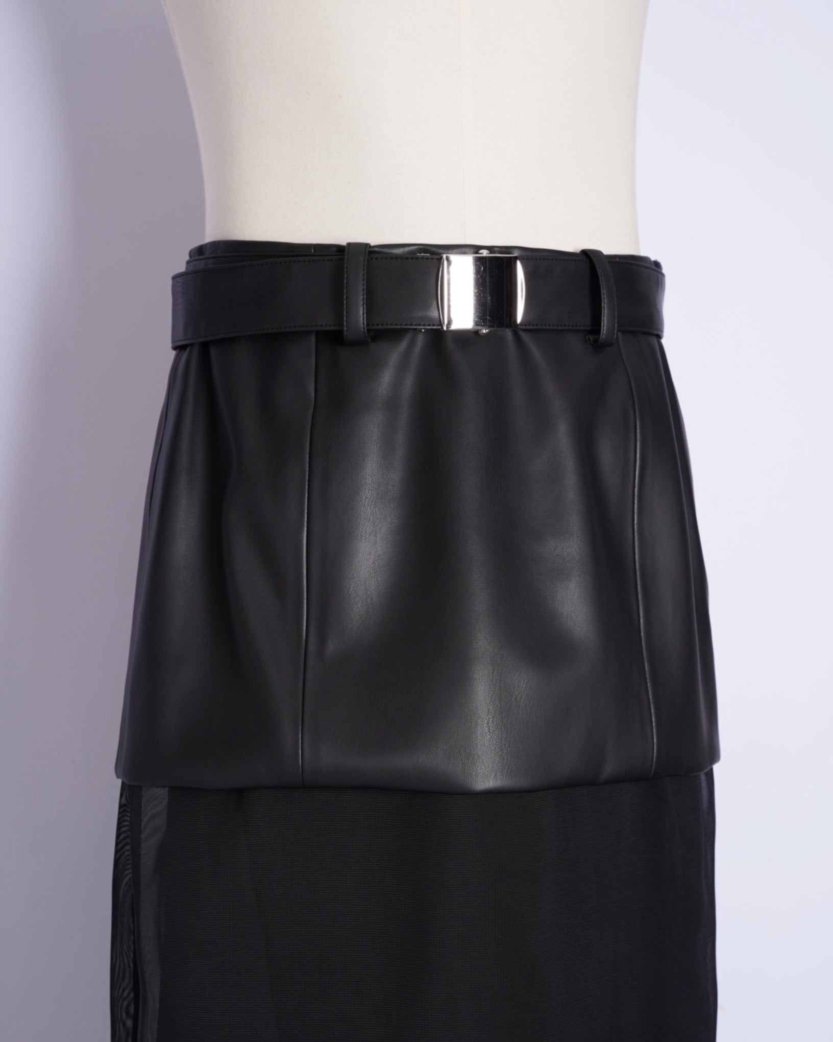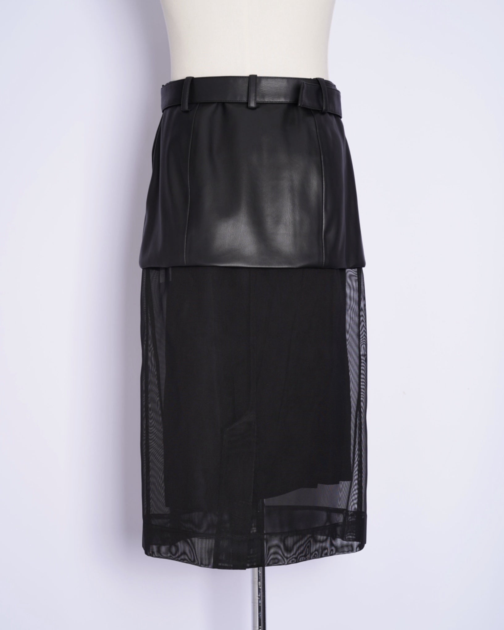 ・シンセティックレザーとメッシュ素材による、モードな仕上がりのスカート。