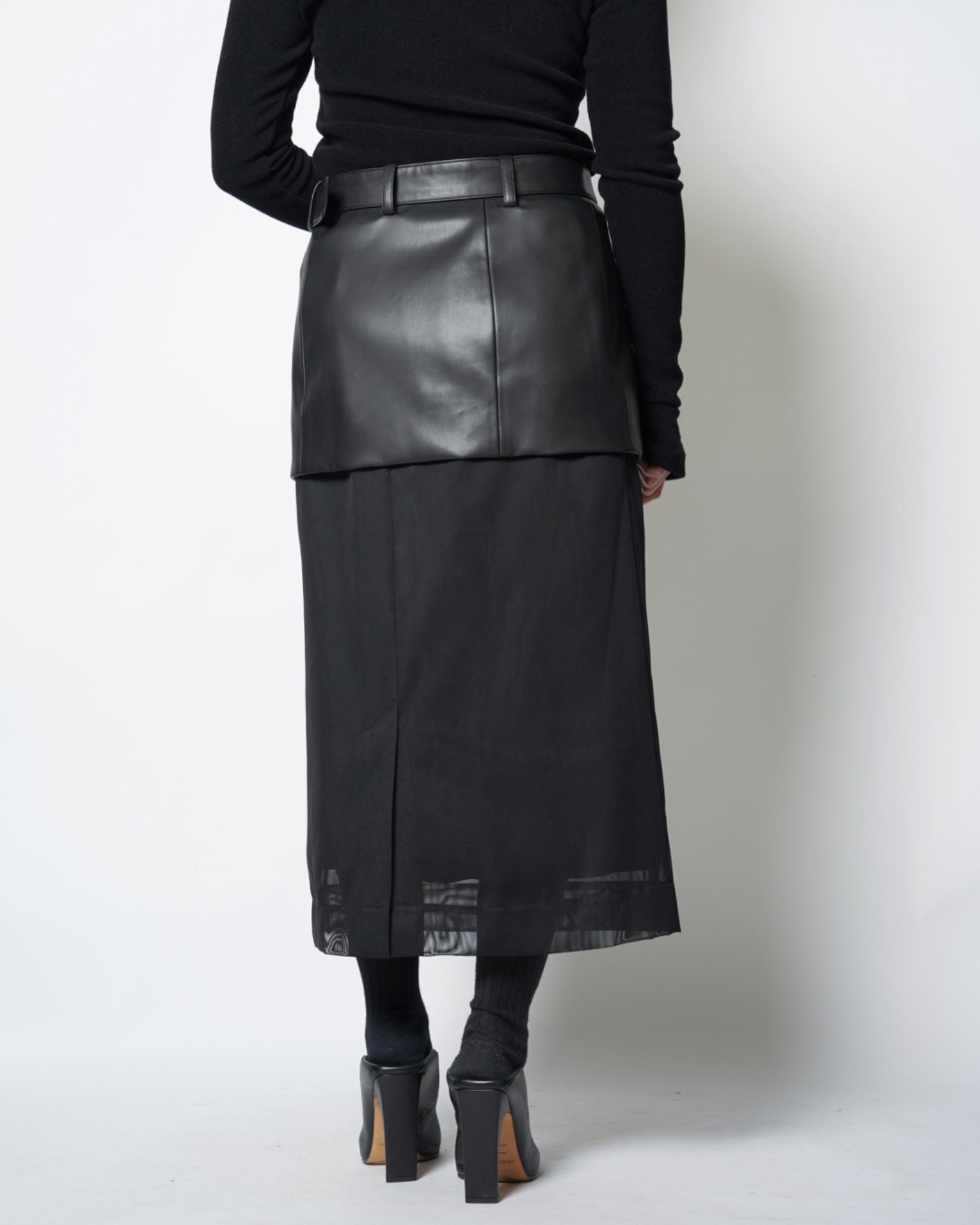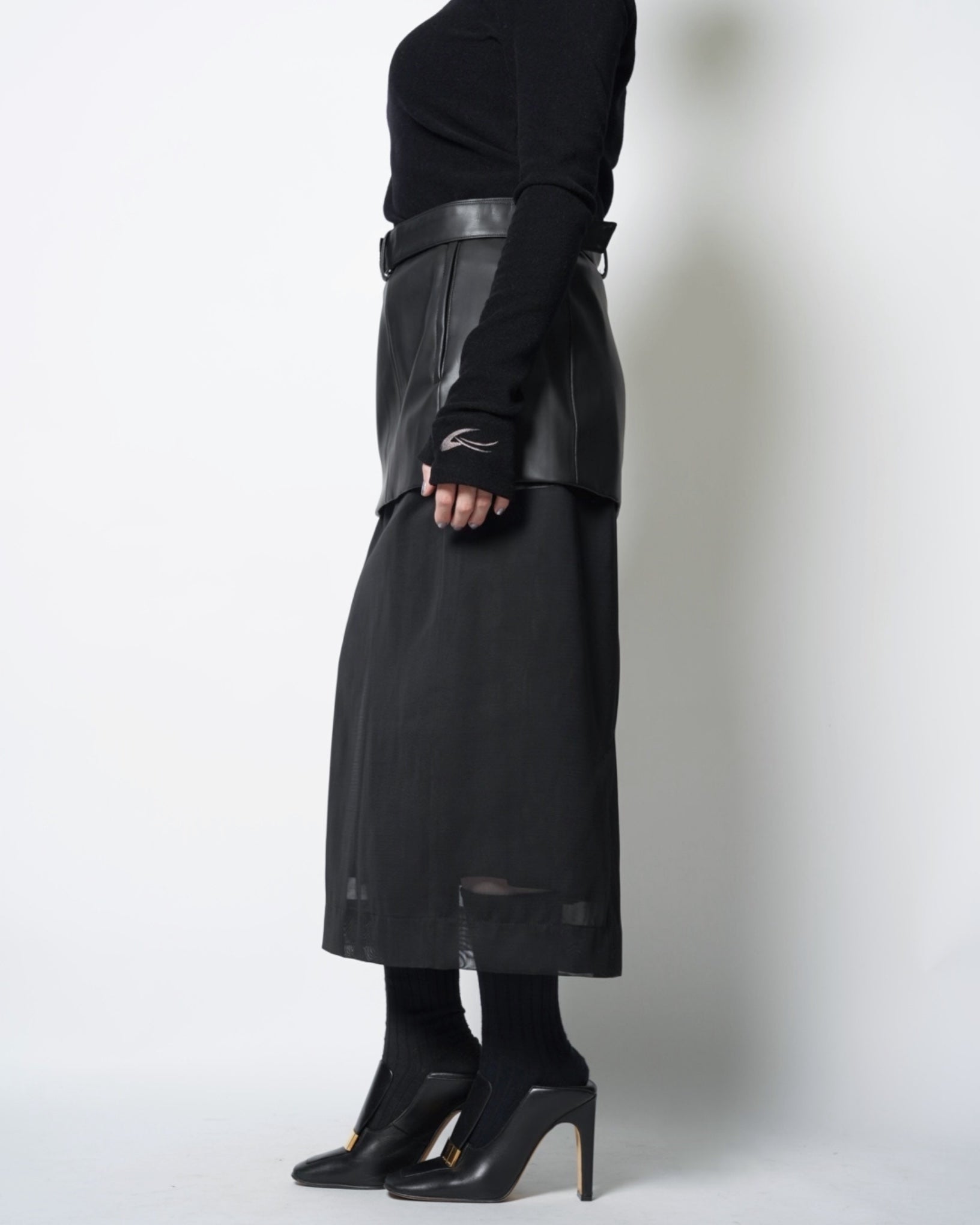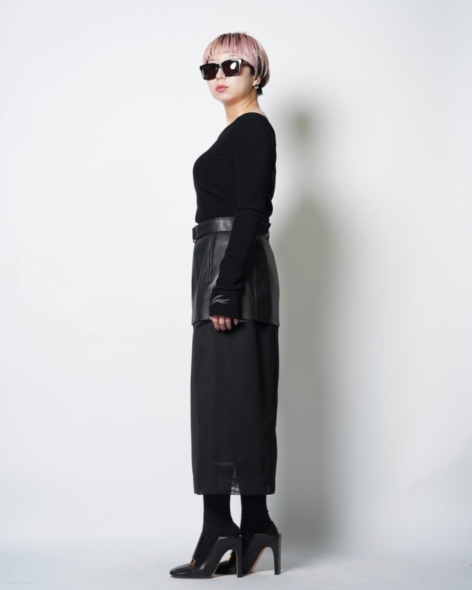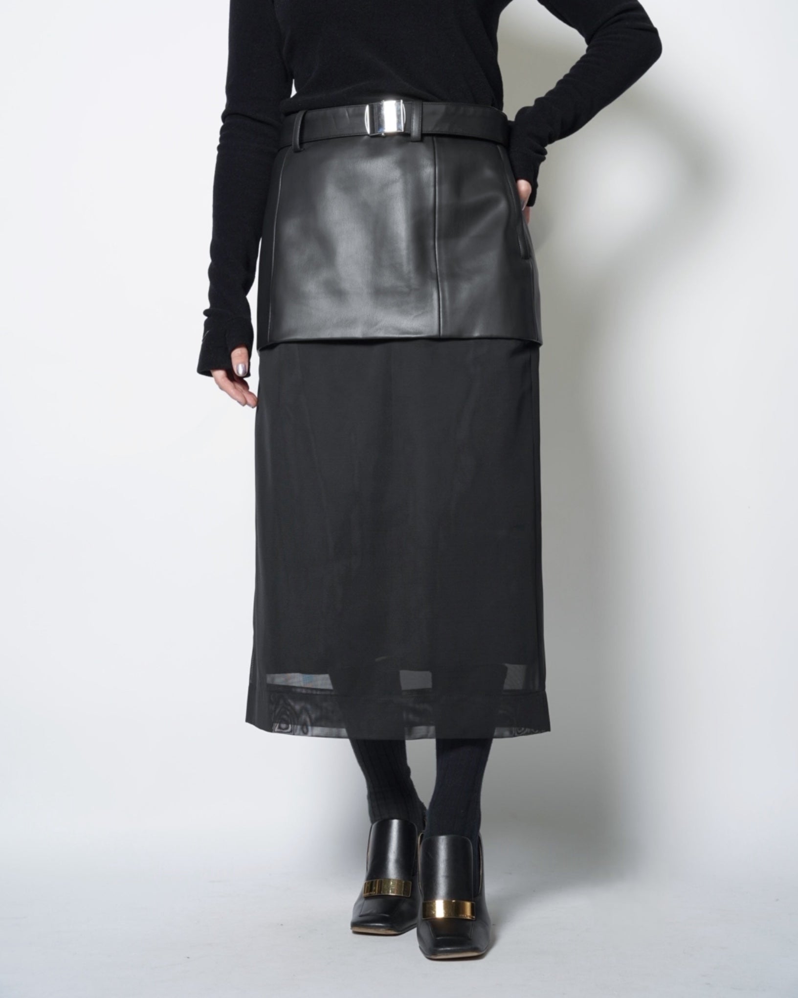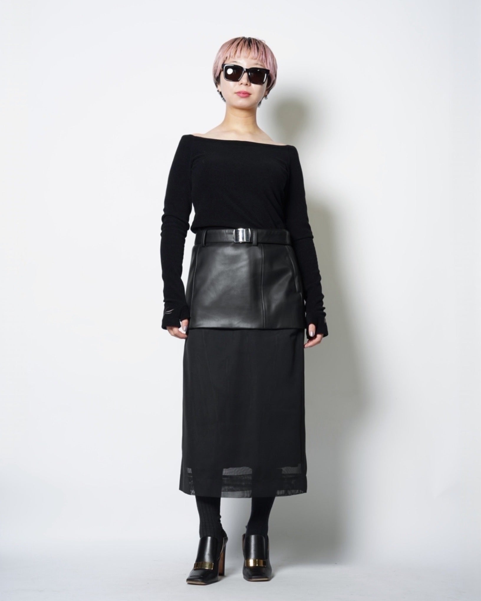 ・シンセティックレザーとメッシュ素材による、モードな仕上がりのスカート。
