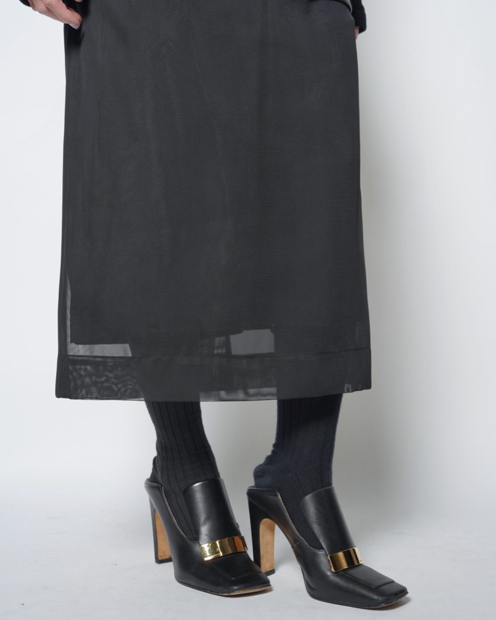 ・ペチコートを穿くことでメッシュの透け感を和らげられます。逆にペチコート無しだとメッシュのシアー感が際立ち、よりモード感のある印象になります。