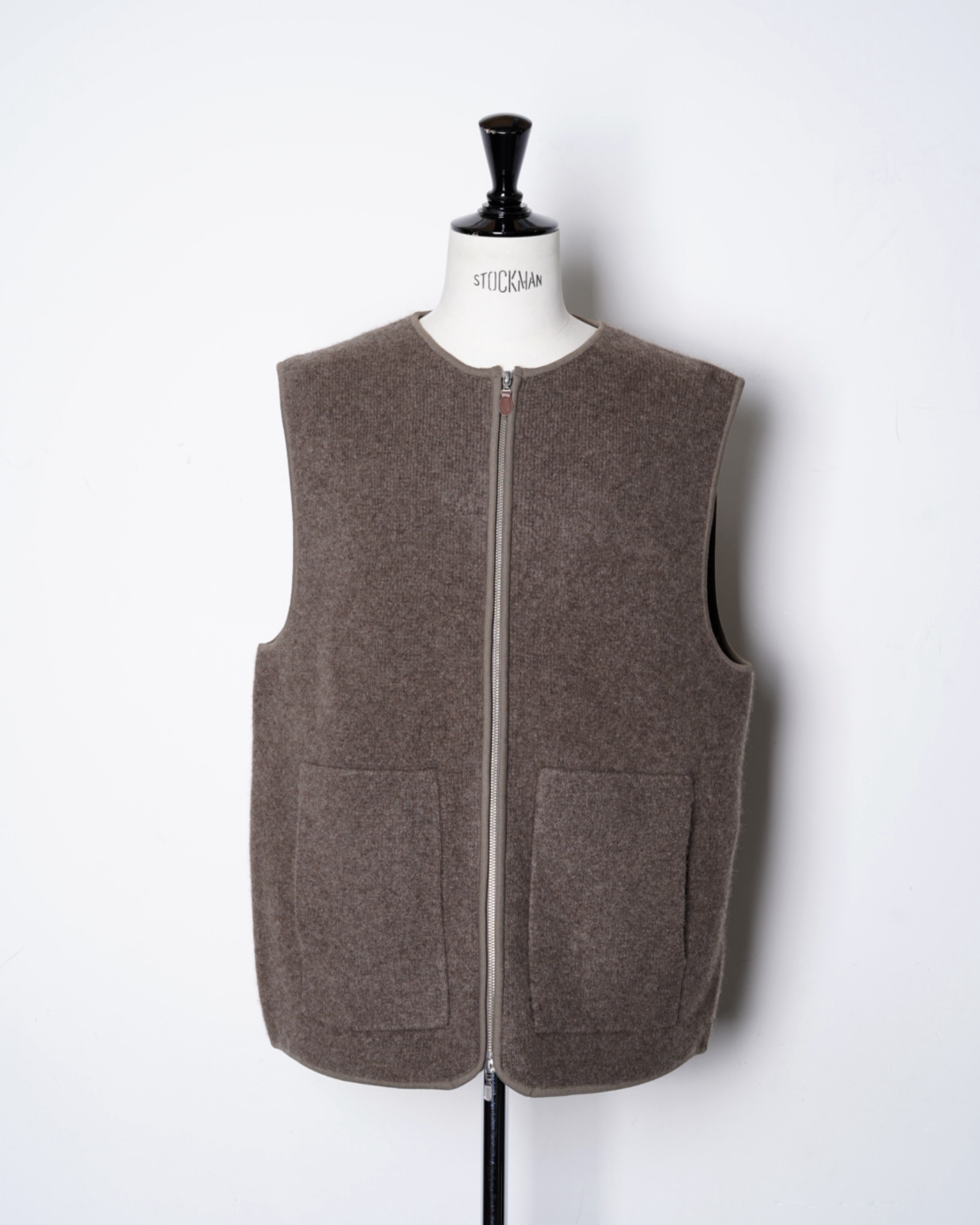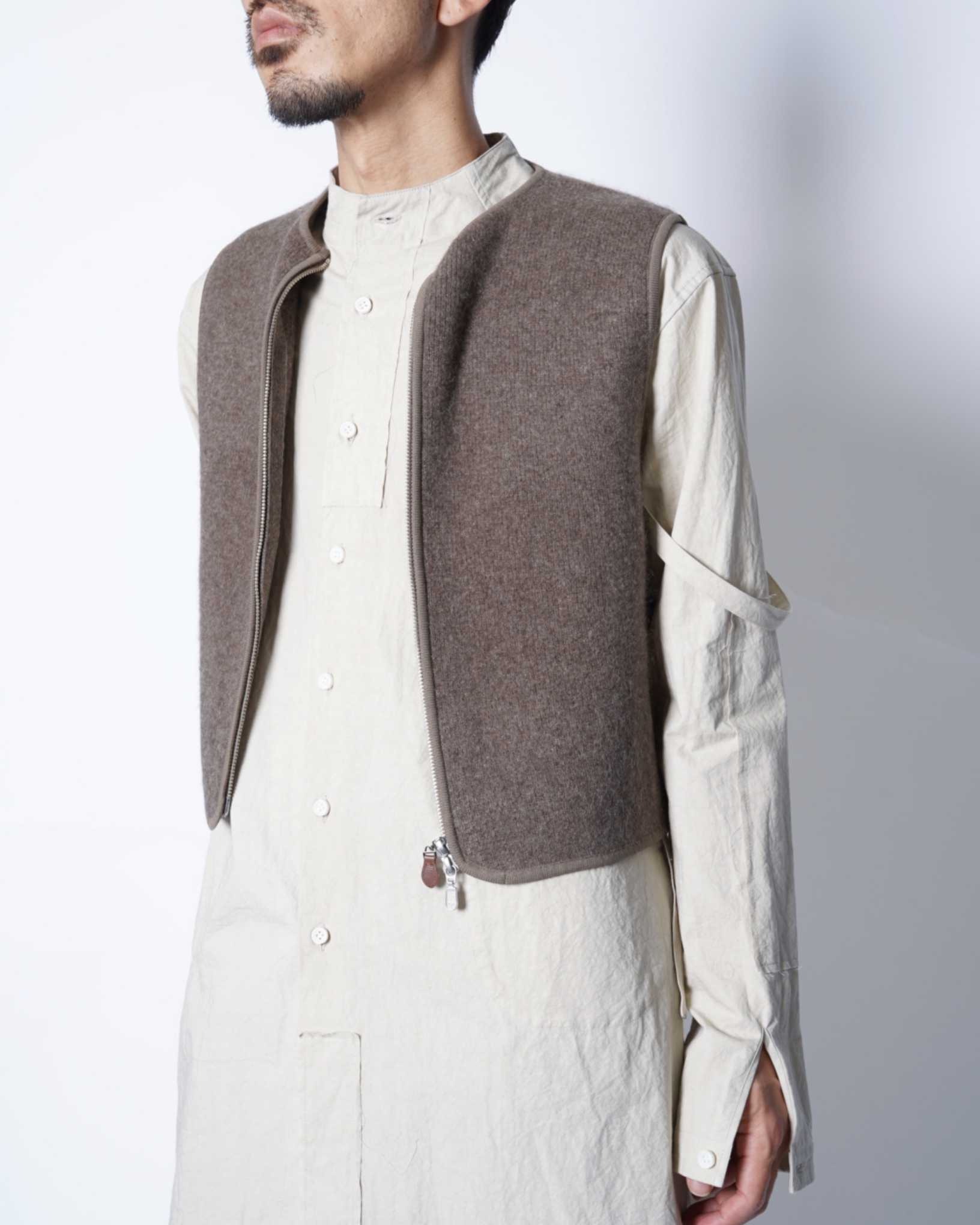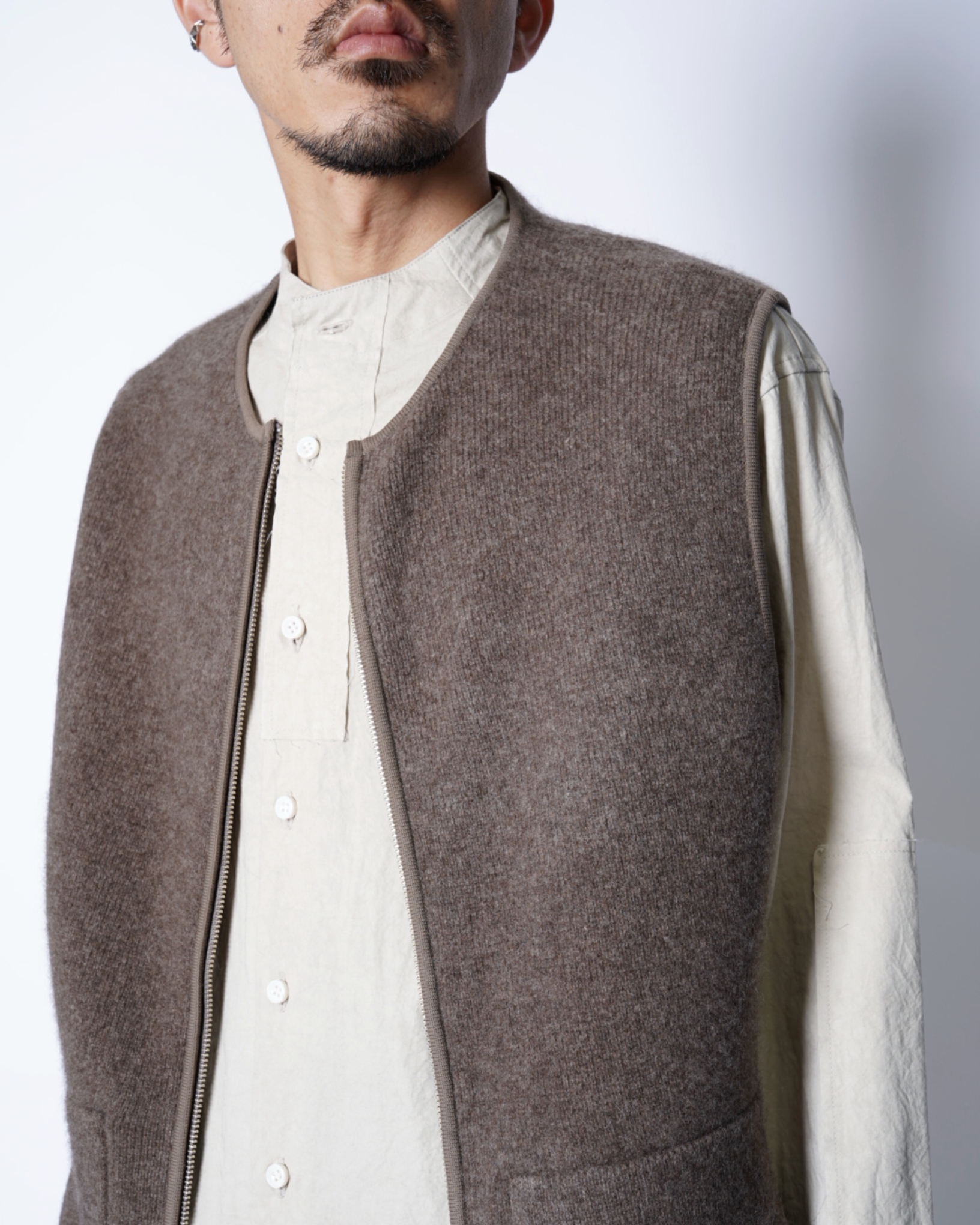 ・スッキリとしたノーカラーのネックのベストで、スッキリとした印象且つ様々なアイテムとのレイヤード性を高めています。