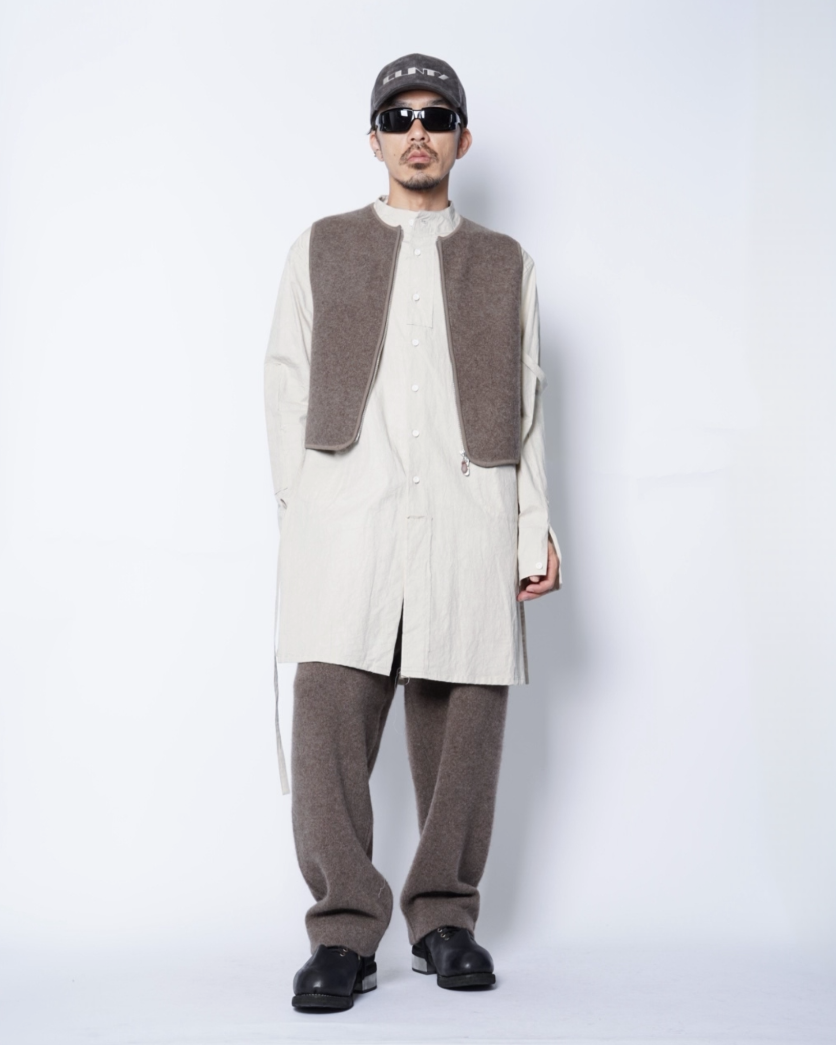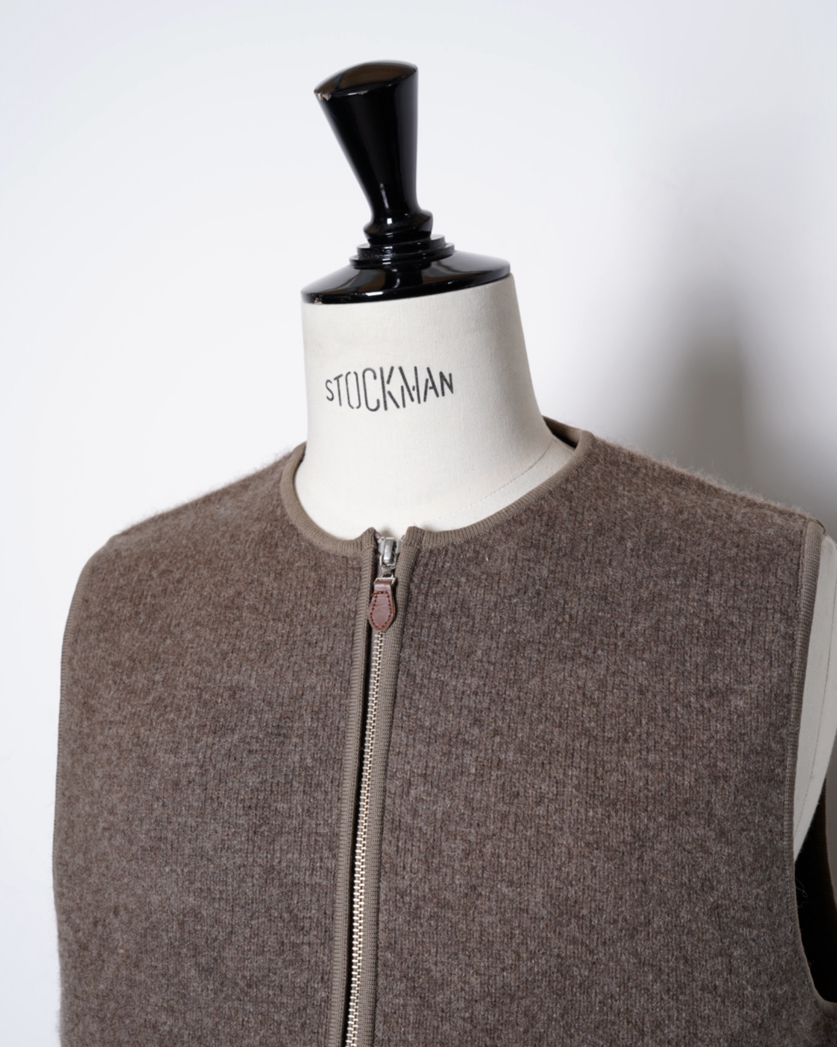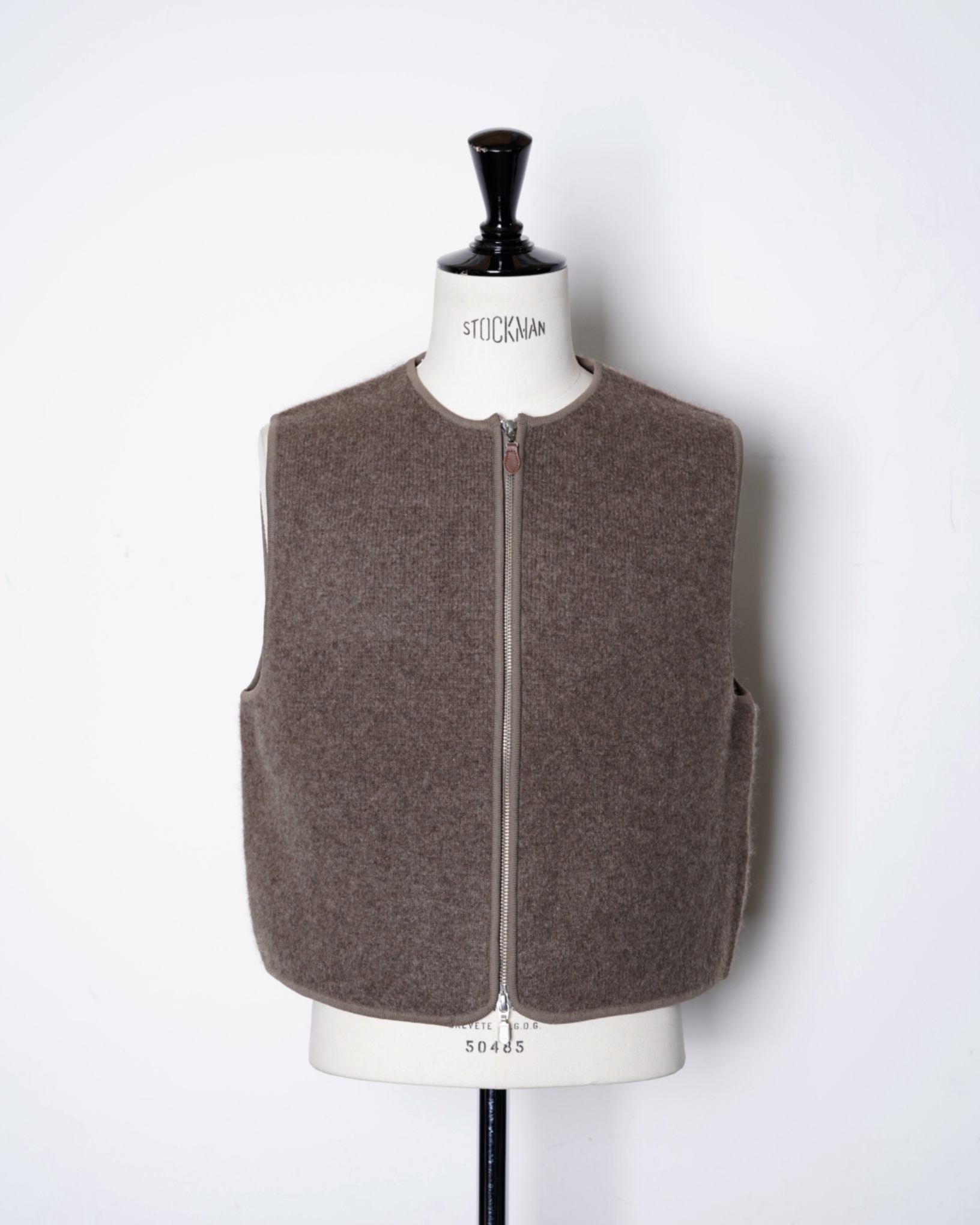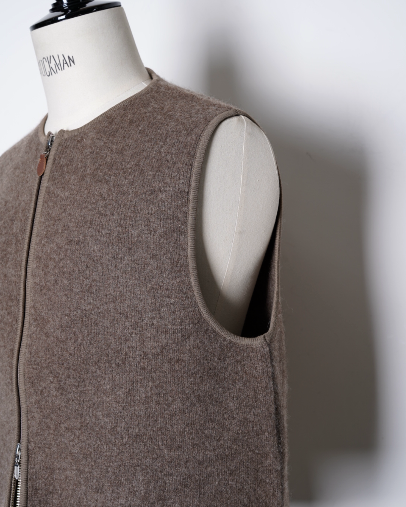 ・スッキリとしたノーカラーのネックのベストで、スッキリとした印象且つ様々なアイテムとのレイヤード性を高めています。