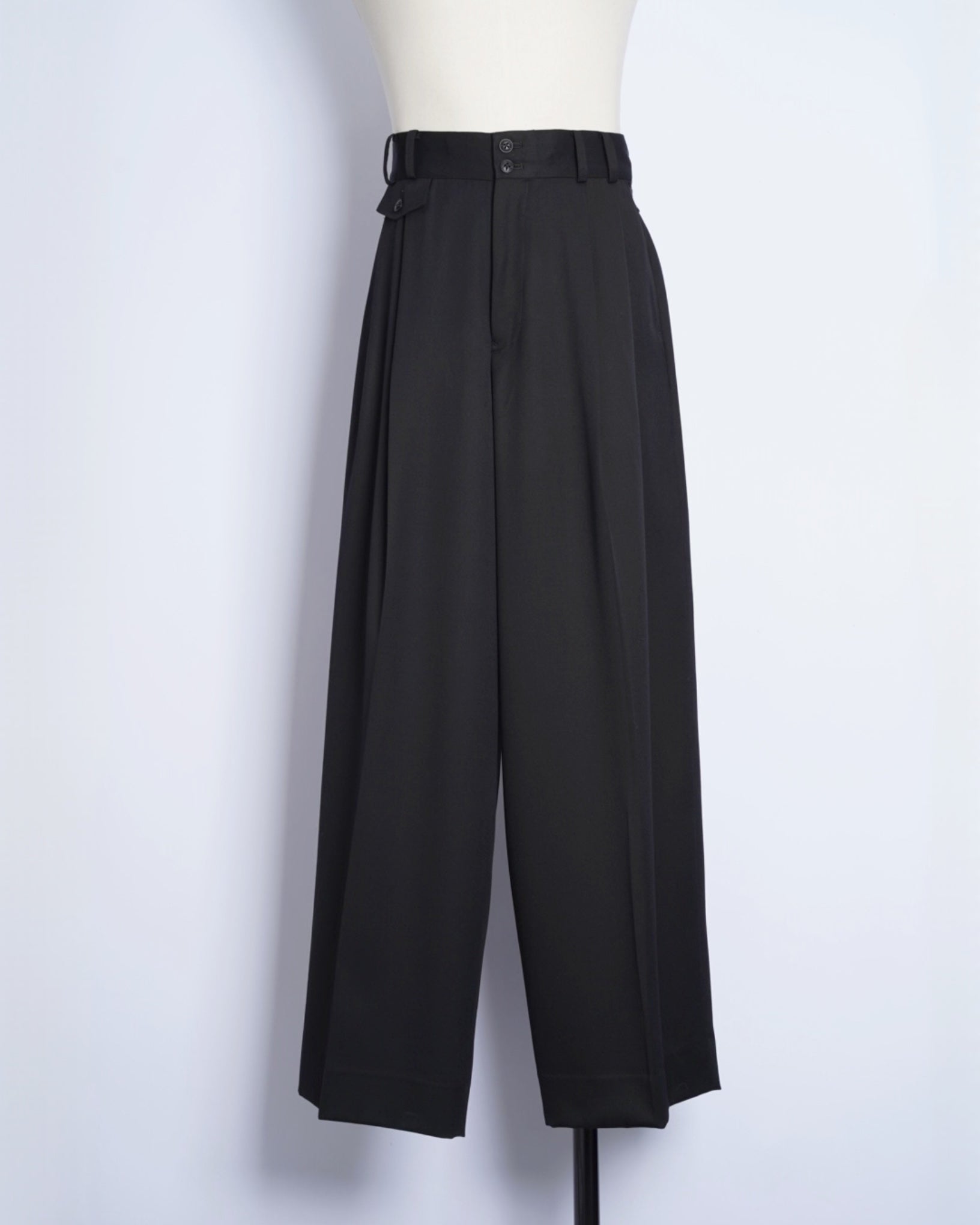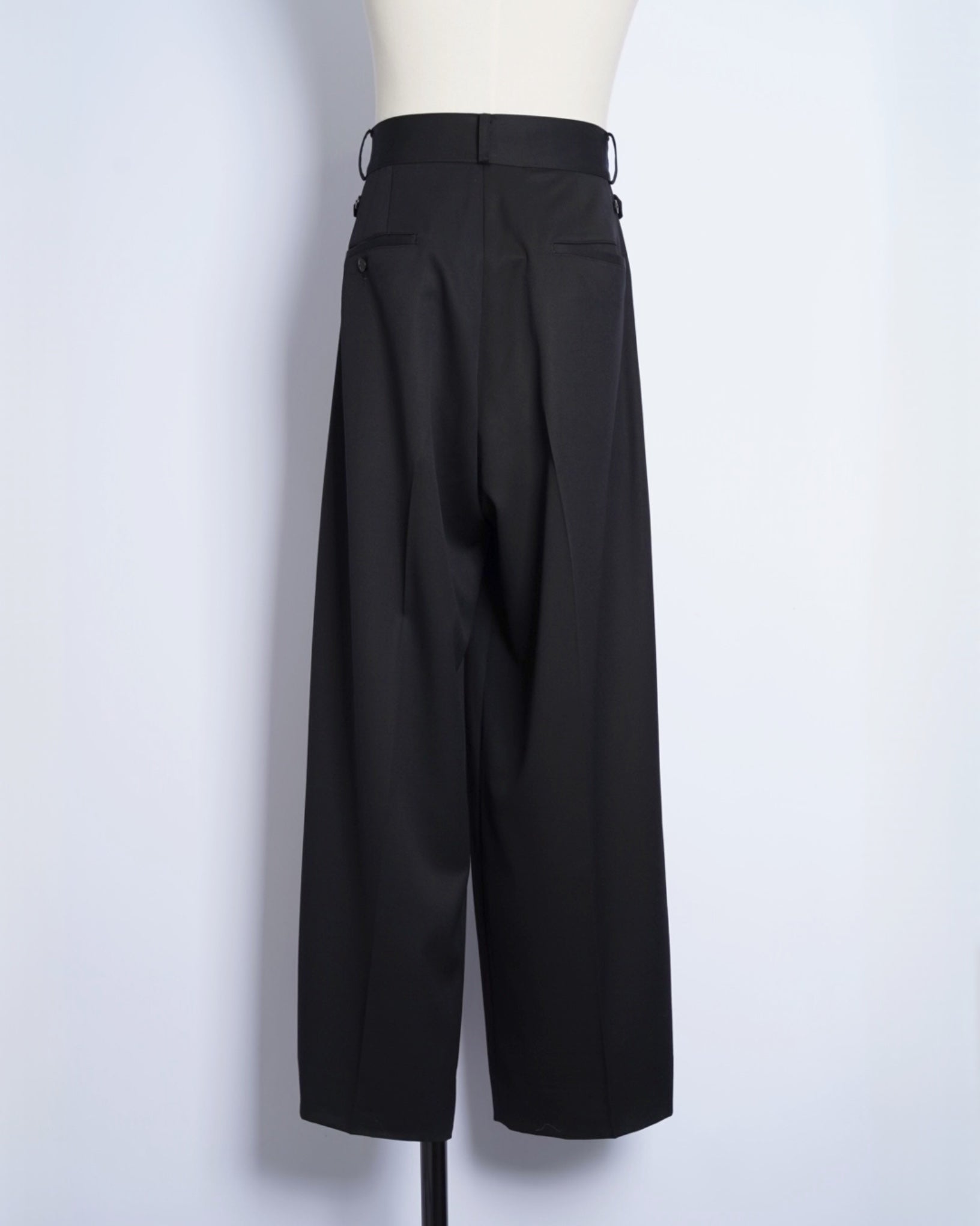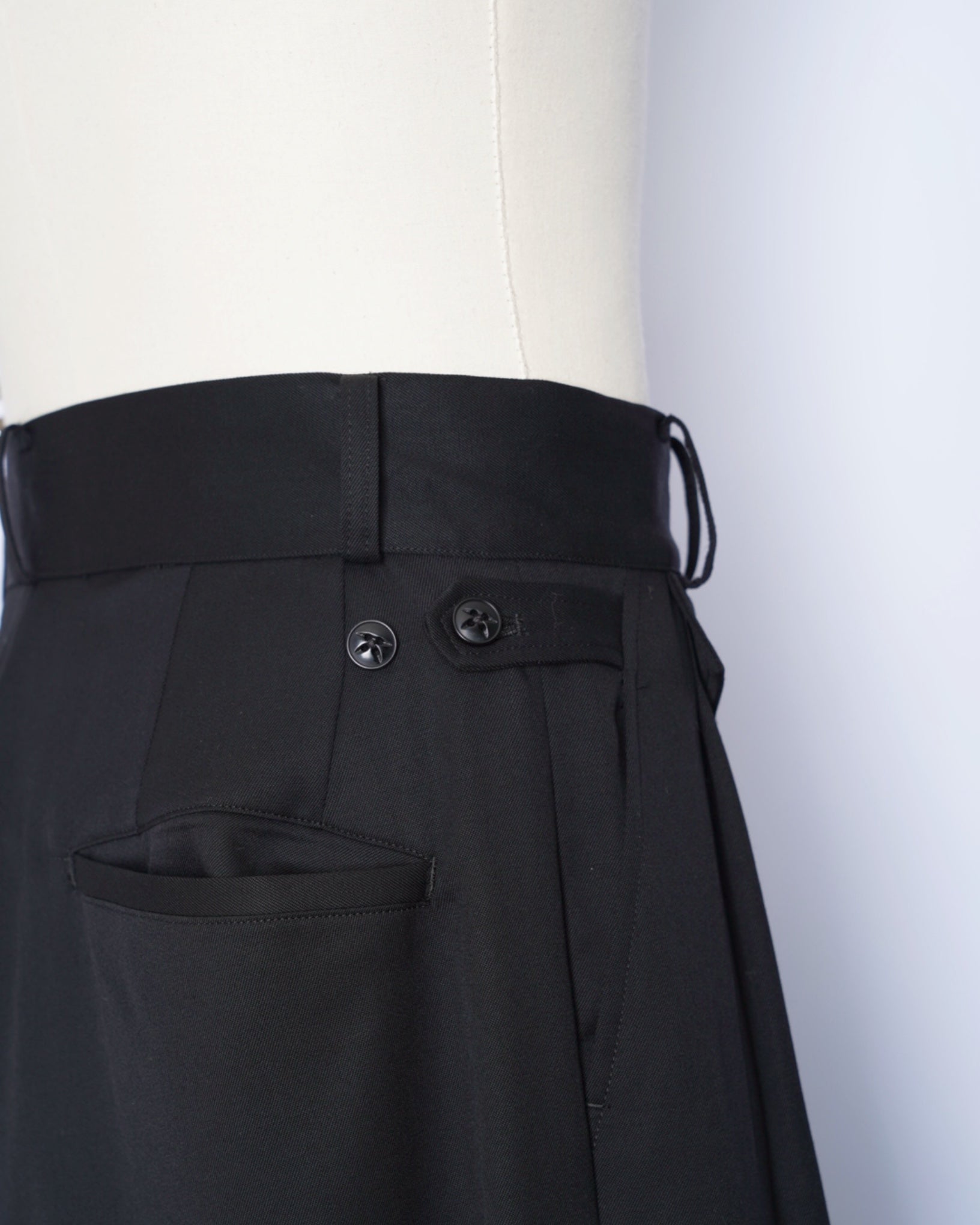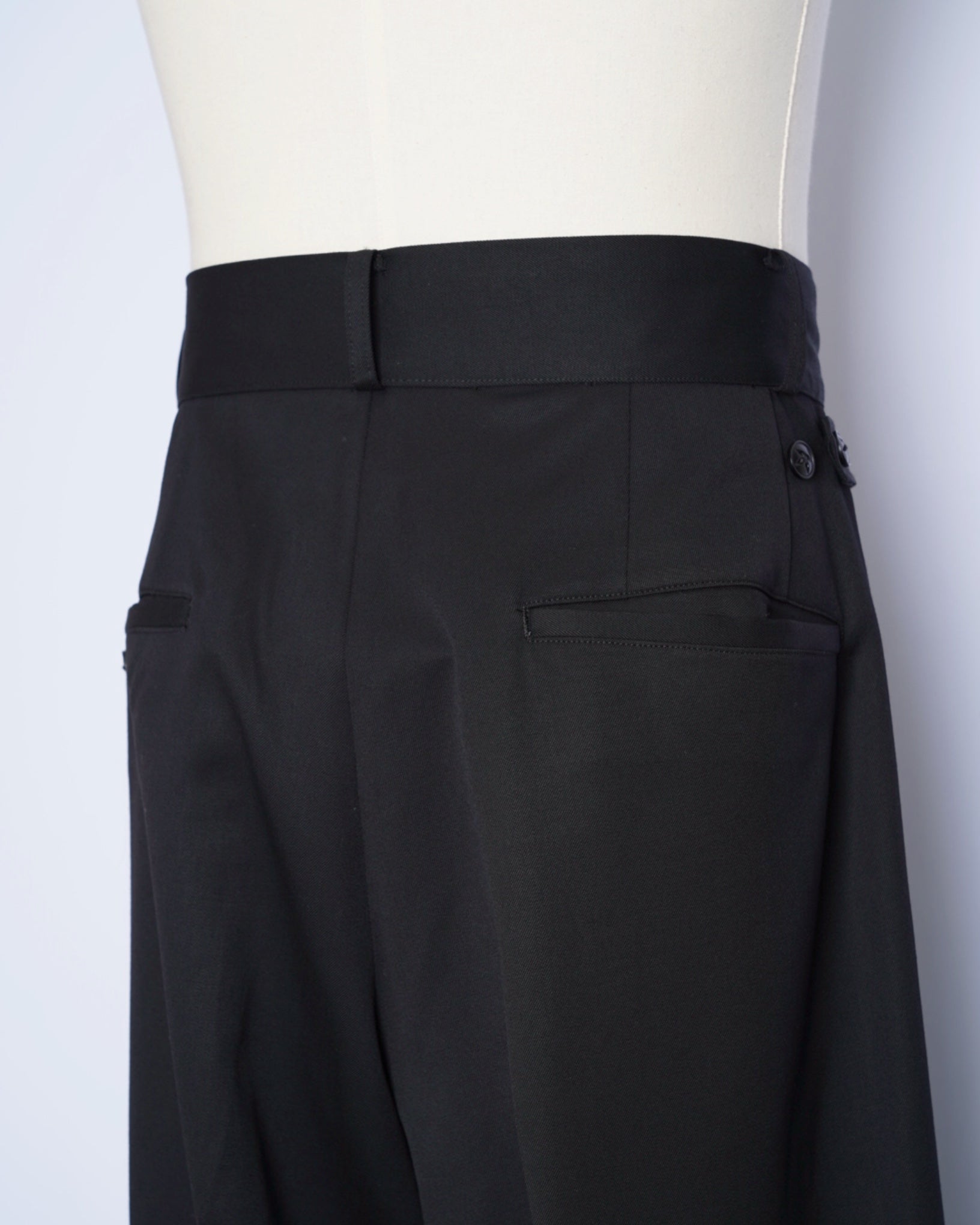 ・程よくゆとりのある股上と深い2タックにより上質なウールギャバジンのドレープが非常に際立っており、端正でエレガントな一本に。