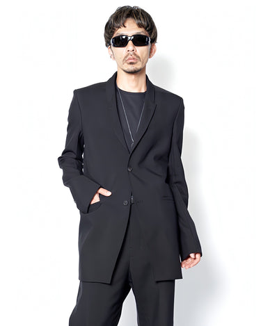 ・直線的なフォルムとカッティングが特徴のジャケットで、構築的なフォルムも相まってソリッドでエッジの効いたデザインに。