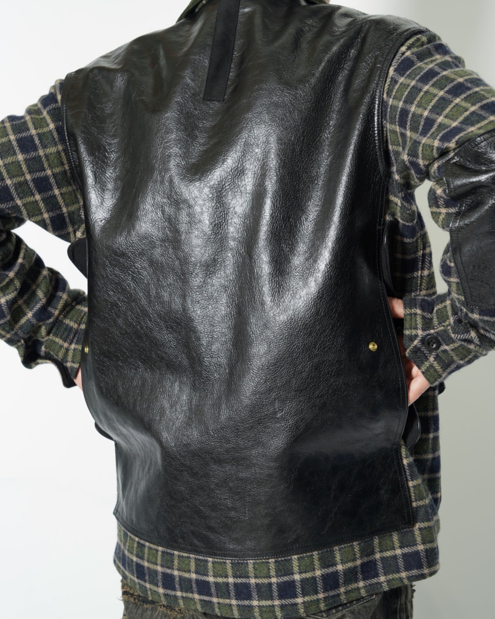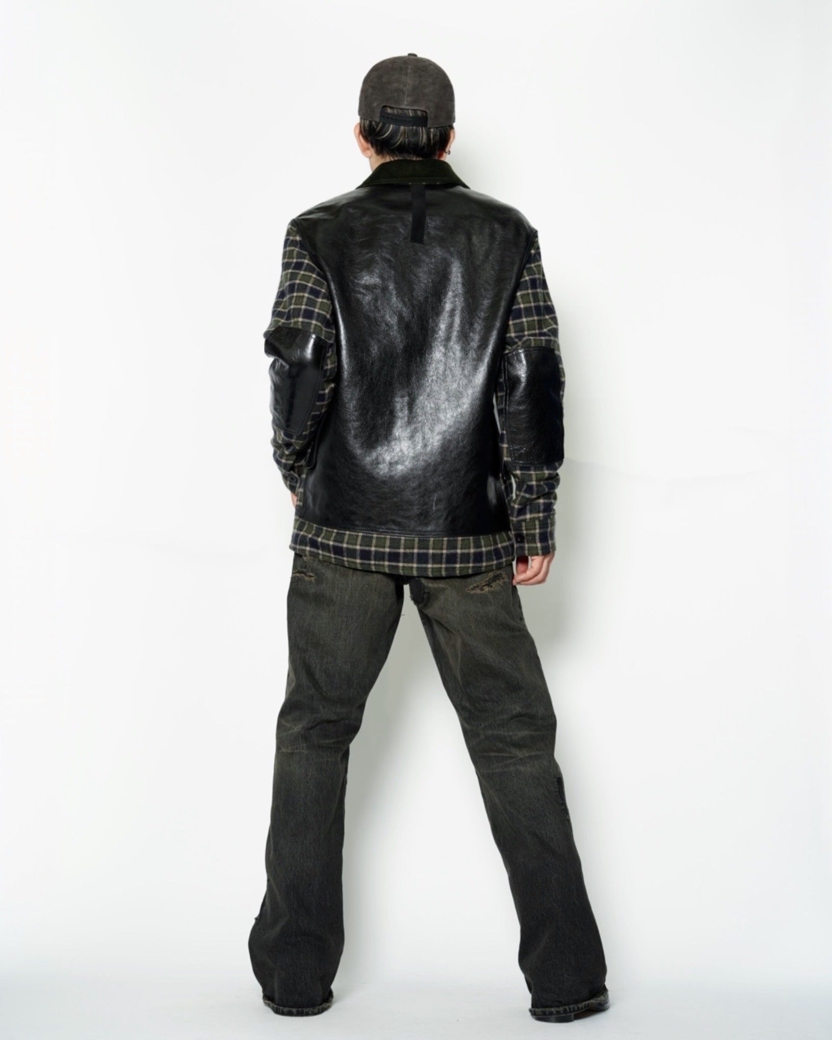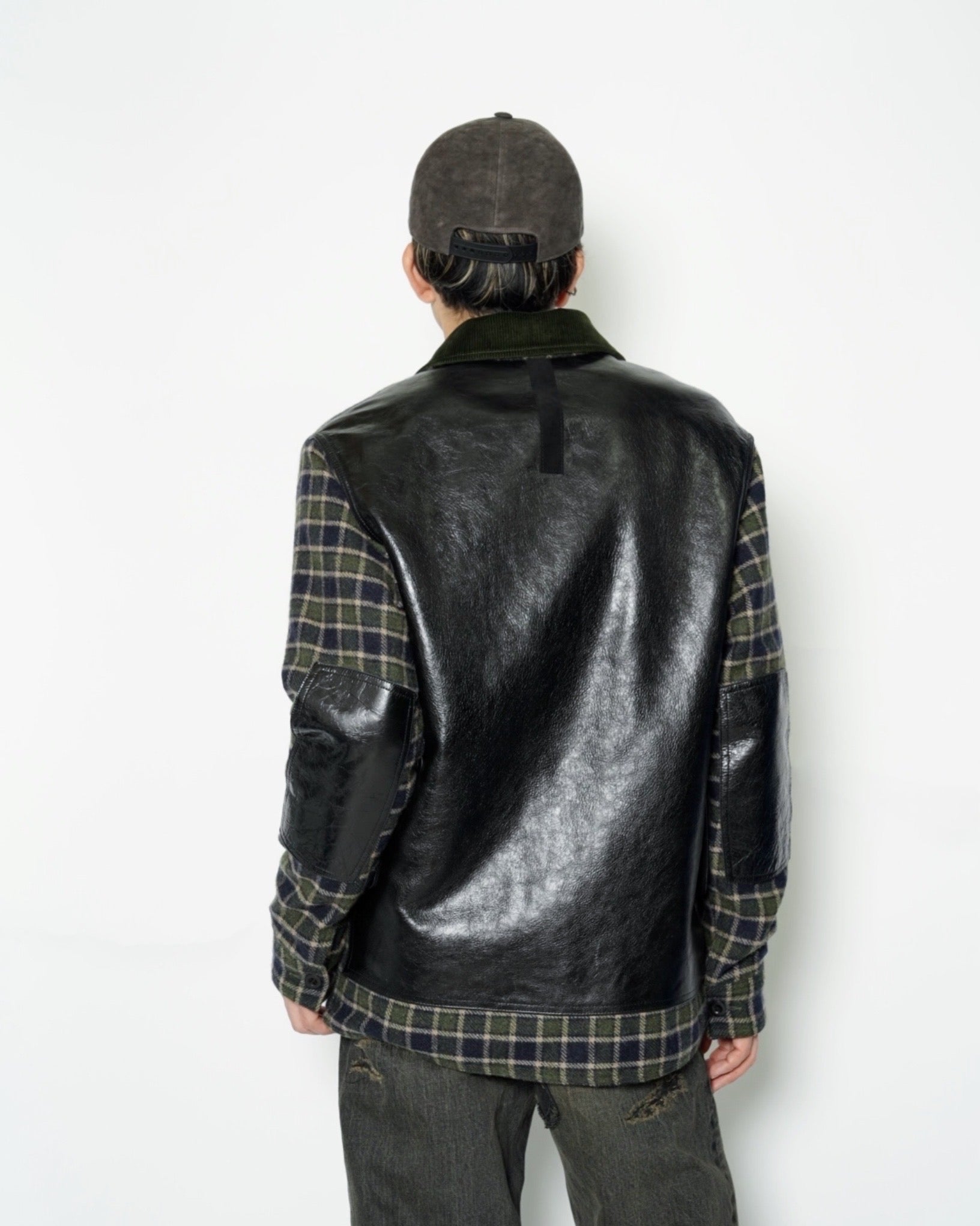 ・ポケット、エルボーパッチ、背面をそれぞれ質感の異なるレザーに切り替えたりパッチにして張り付けており、異素材のコントラストが際立つデザインとなっています。