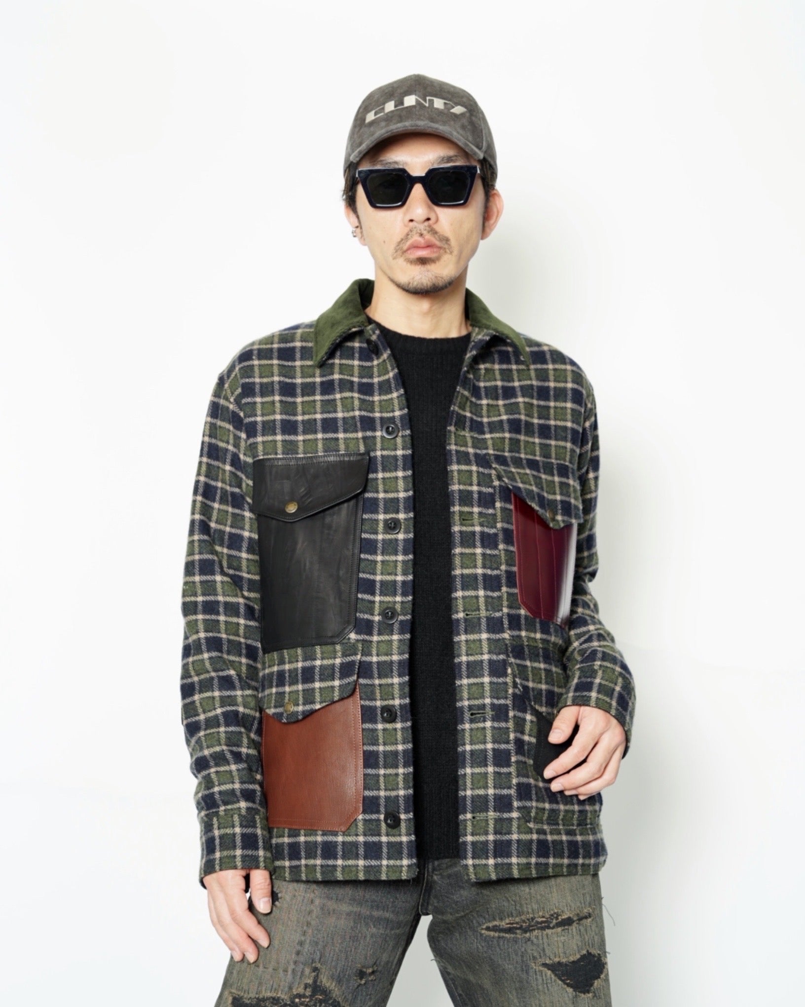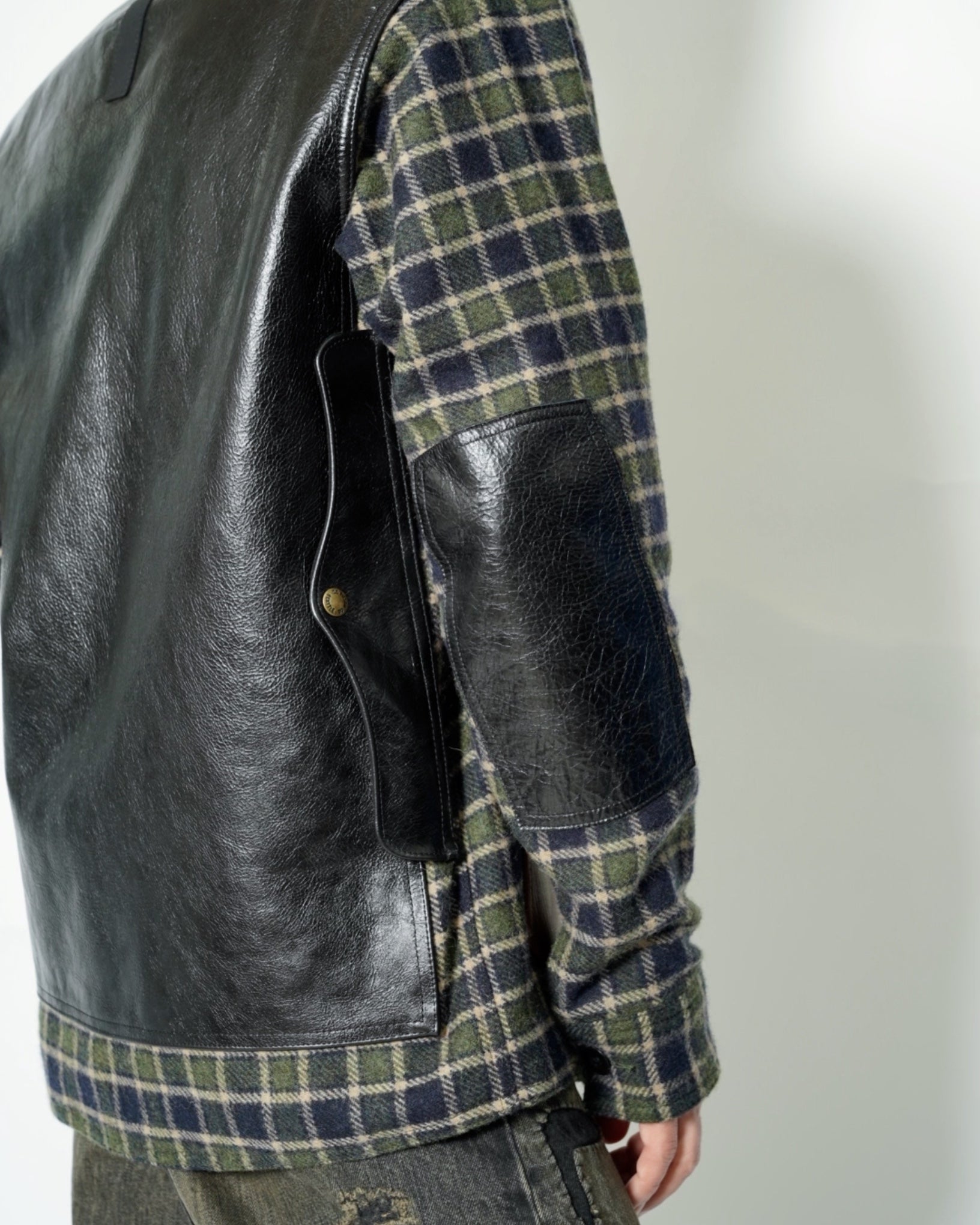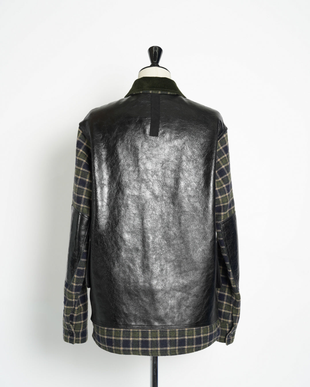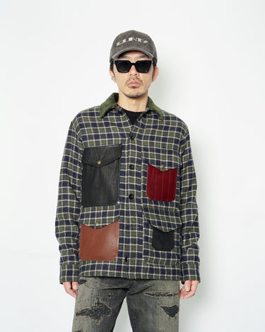 ・ポケット、エルボーパッチ、背面をそれぞれ質感の異なるレザーに切り替えたりパッチにして張り付けており、異素材のコントラストが際立つデザインとなっています。