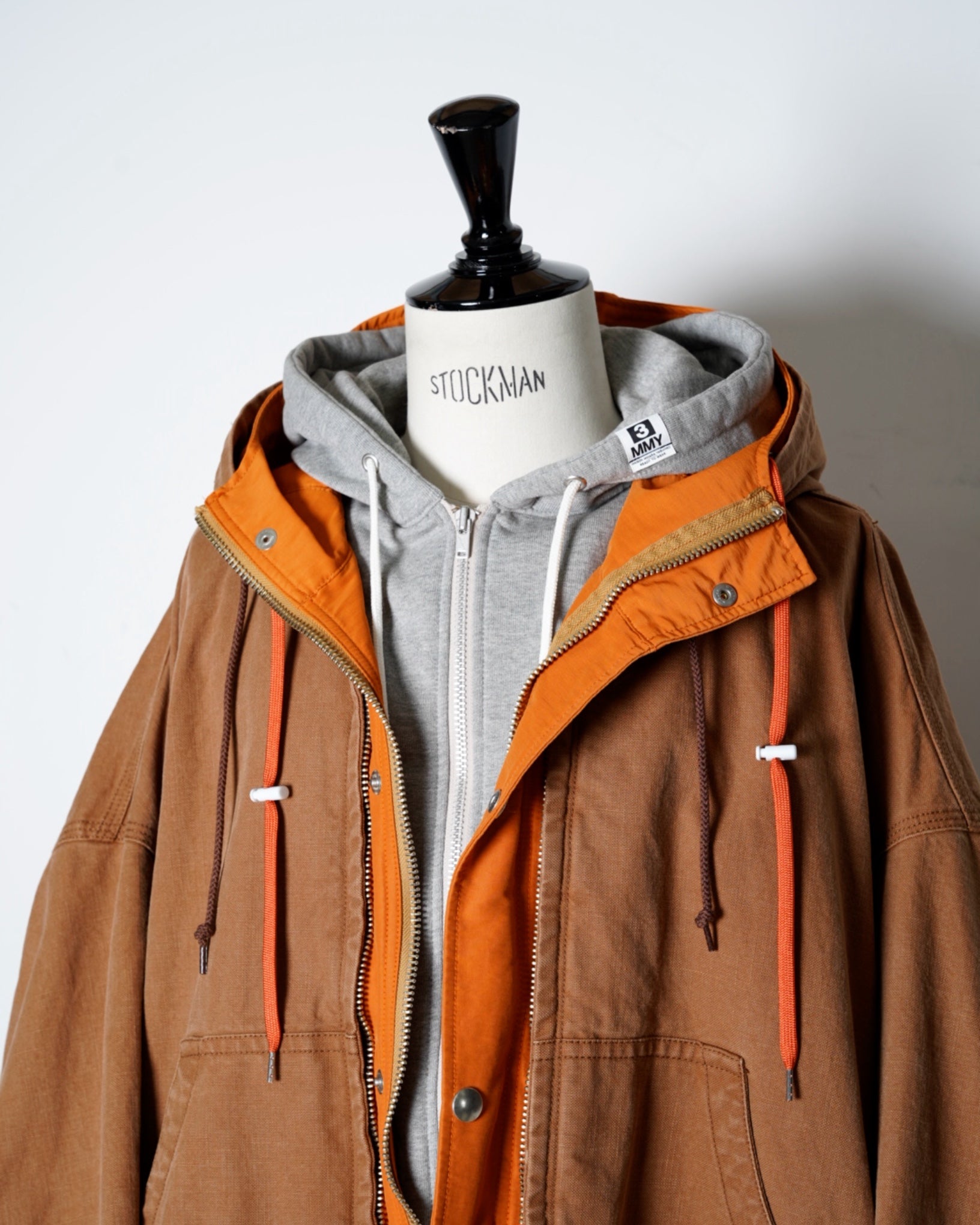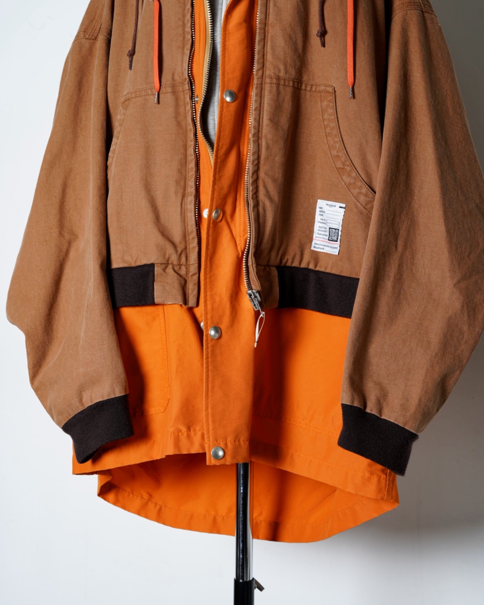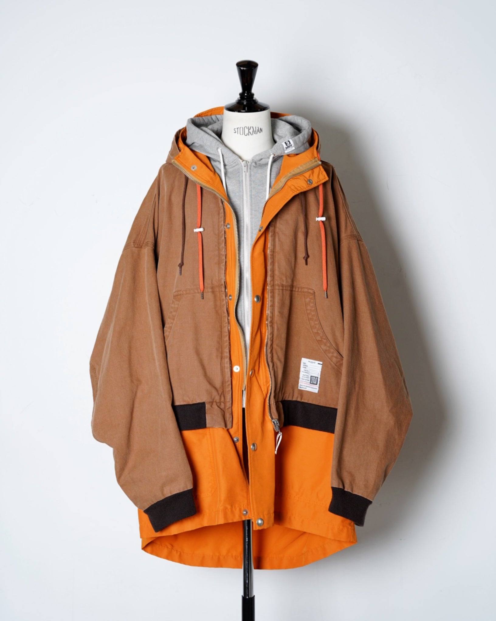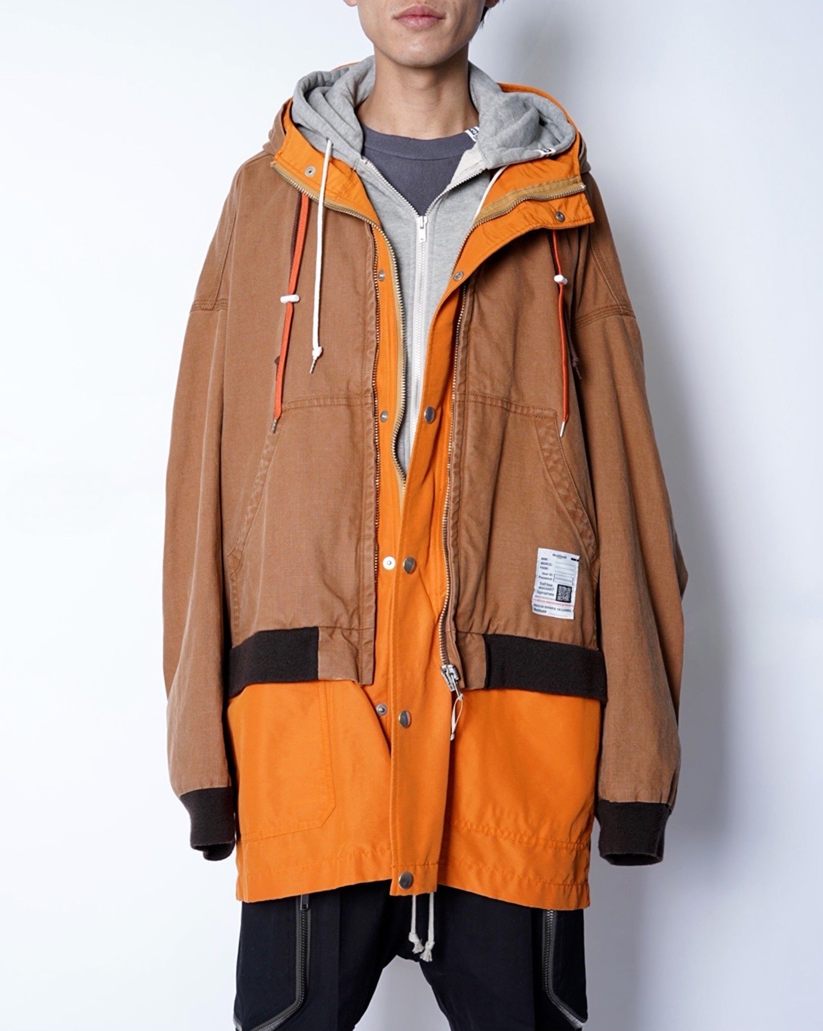 ・ワークジャケット、フーデッドコート、スウェットフーディーの3層ドッキングのミハラヤスヒロらしい大胆でユニークなデザイン。