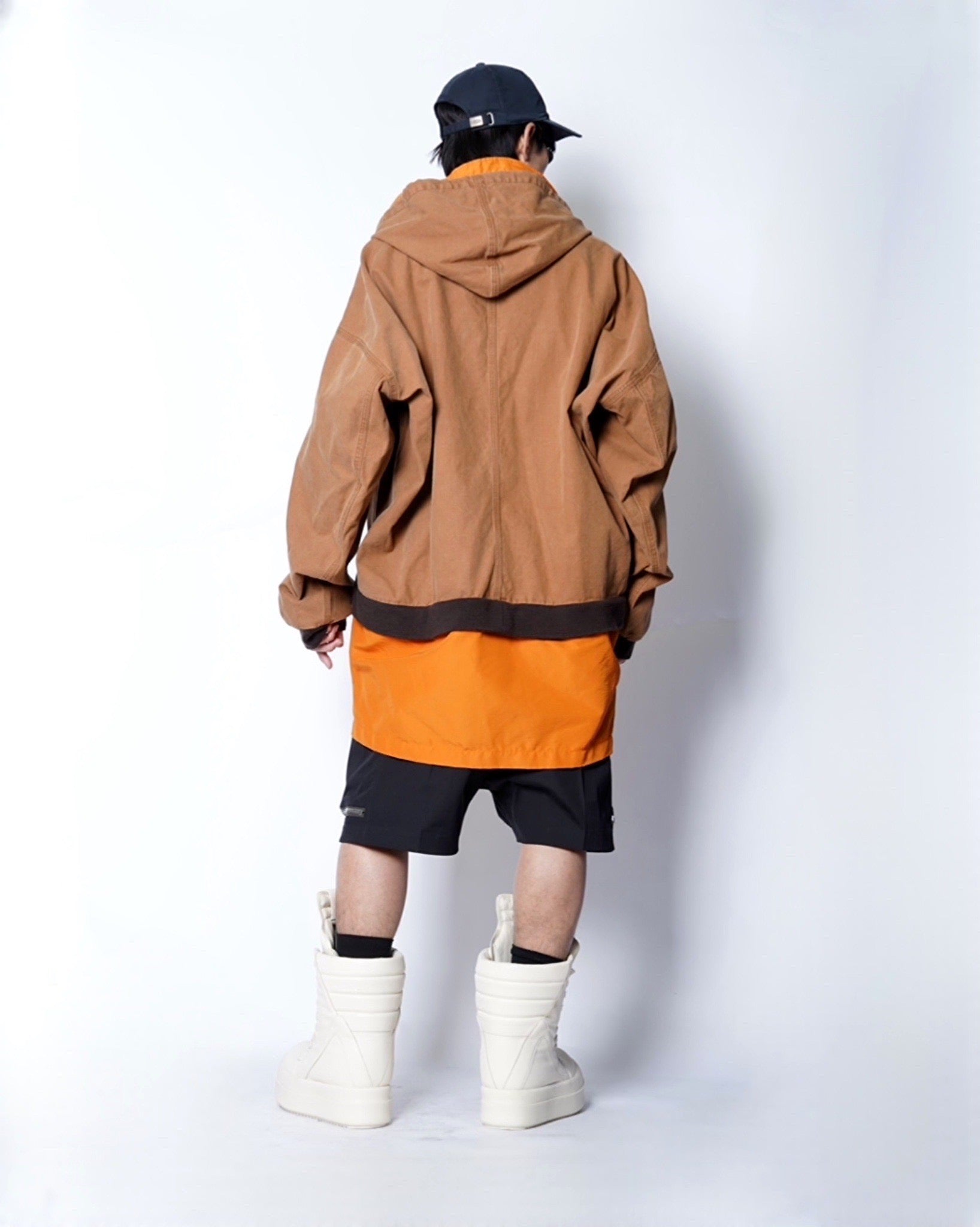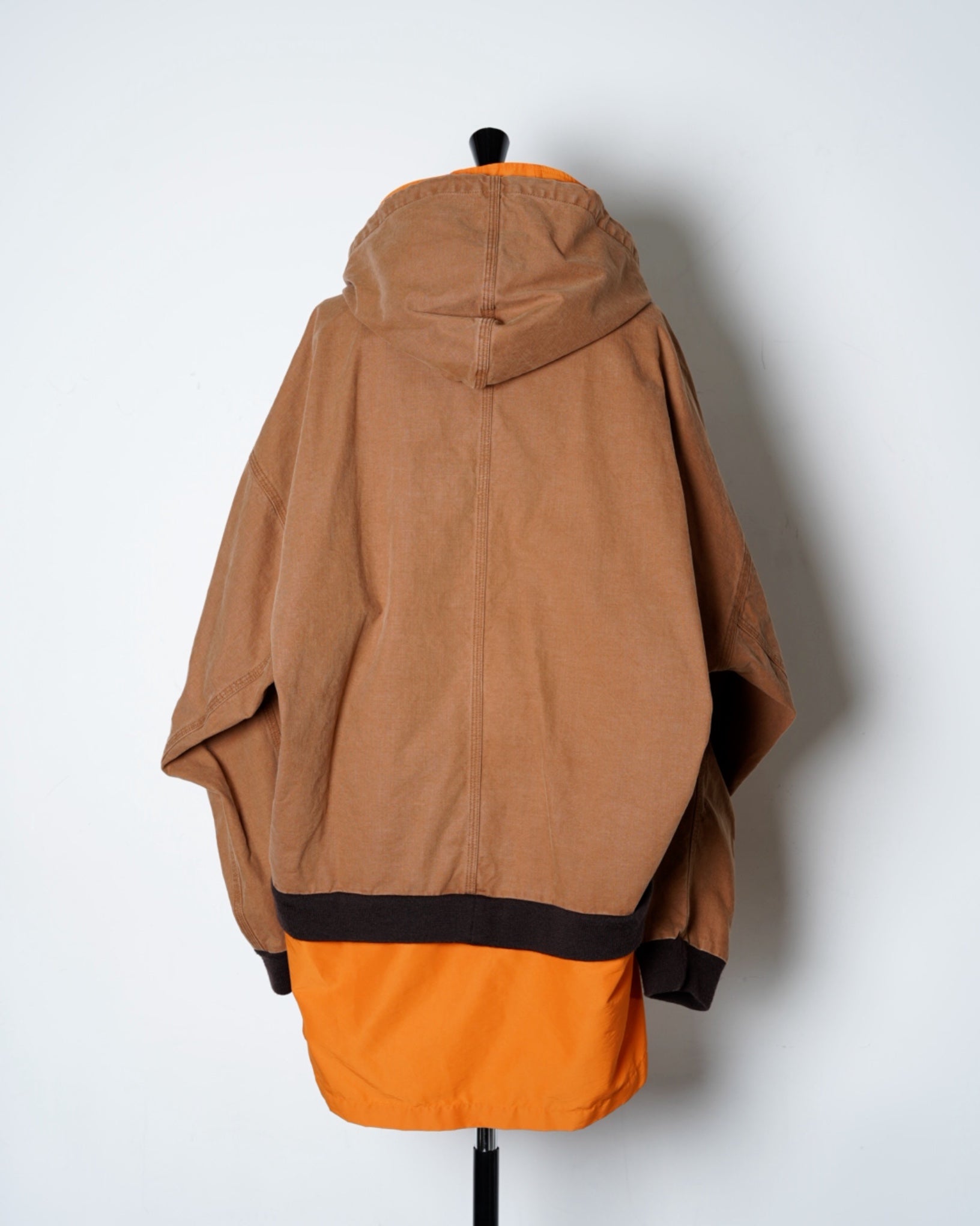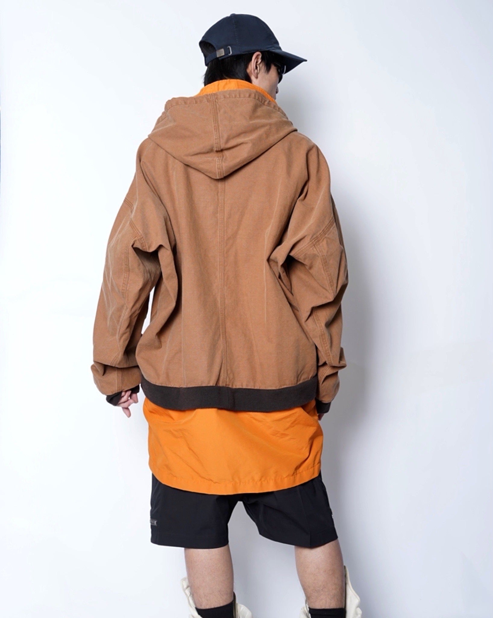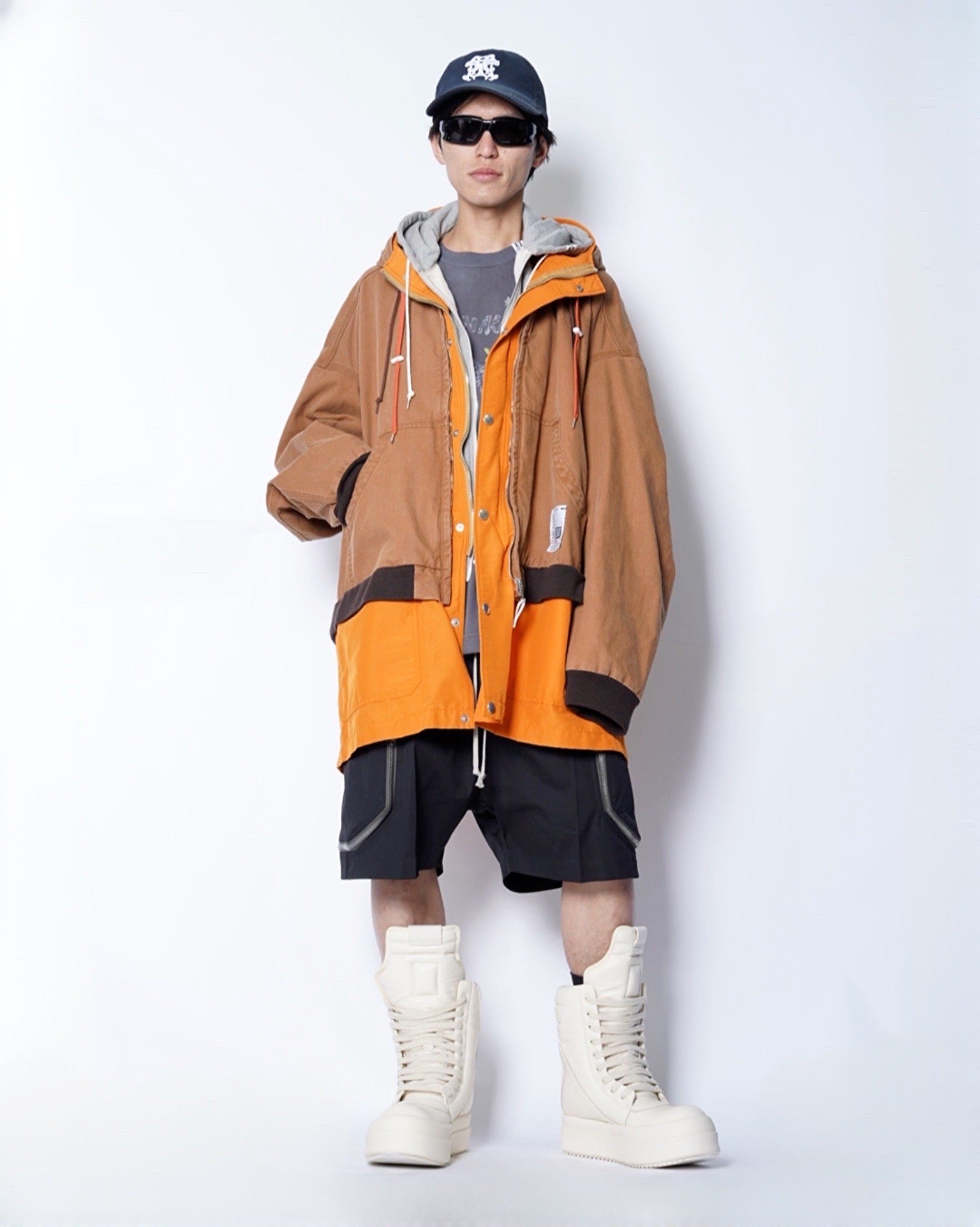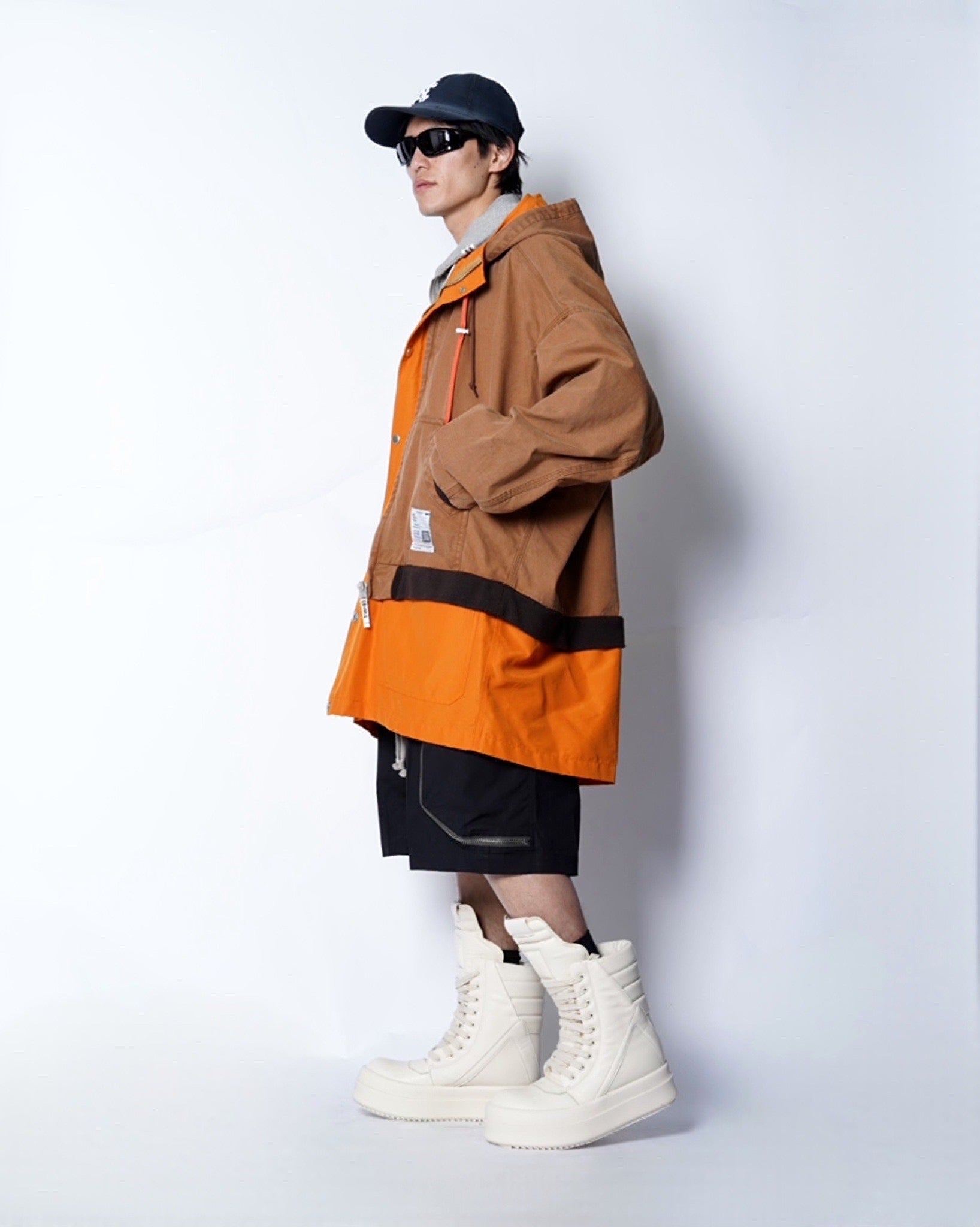 ・ワークジャケット、フーデッドコート、スウェットフーディーの3層ドッキングのミハラヤスヒロらしい大胆でユニークなデザイン。