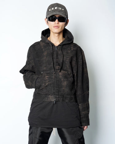 ・ショート丈のブルゾン型にフードを合わせ、実用性と構築的なシルエットを両立。