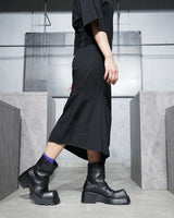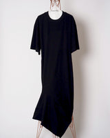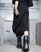 ・裾のパネル状の生地の継ぎ接ぎとステッチワークで右に湾曲するようなフォルムを作り出した、アクセントの効いたシルエットデザイン。
