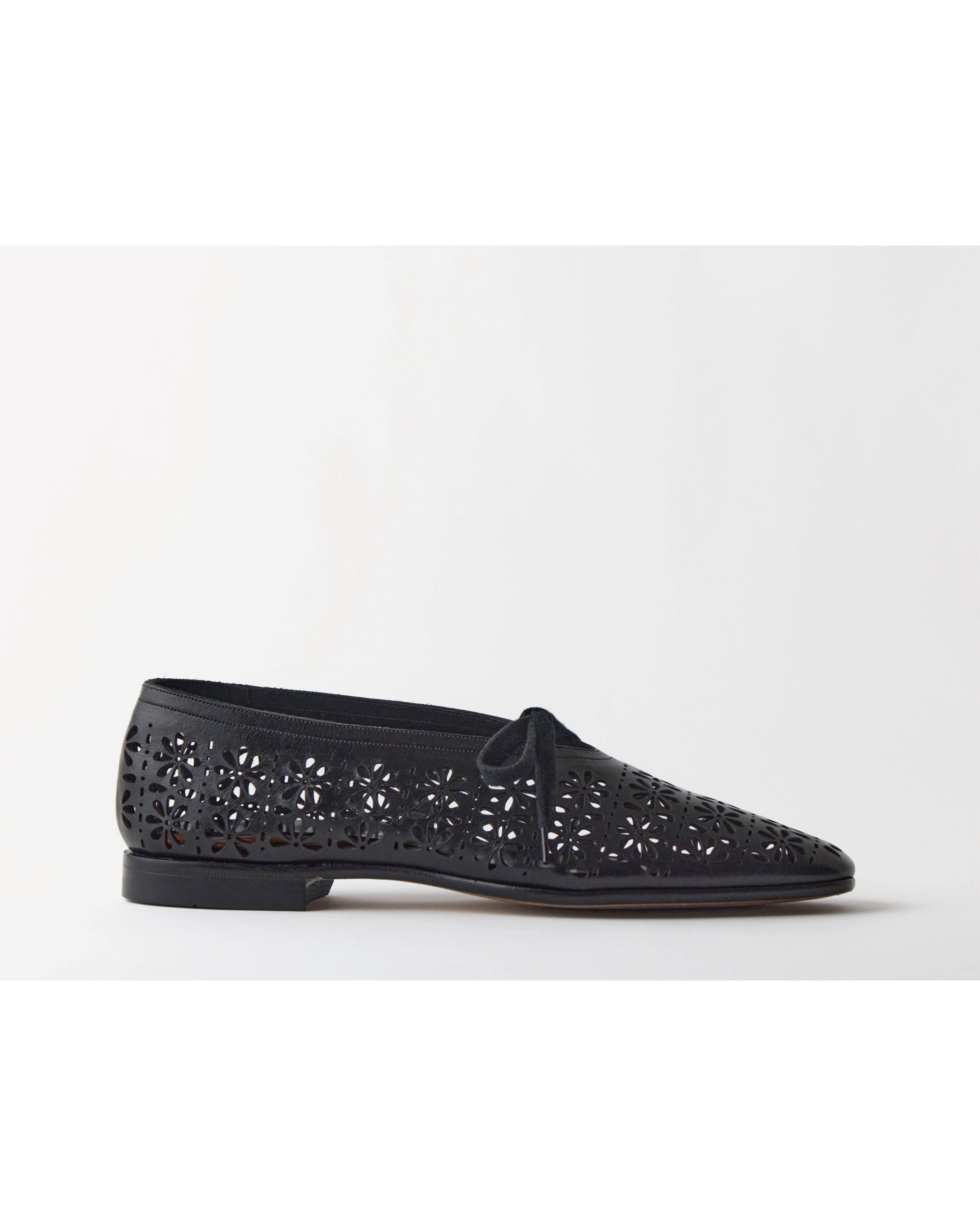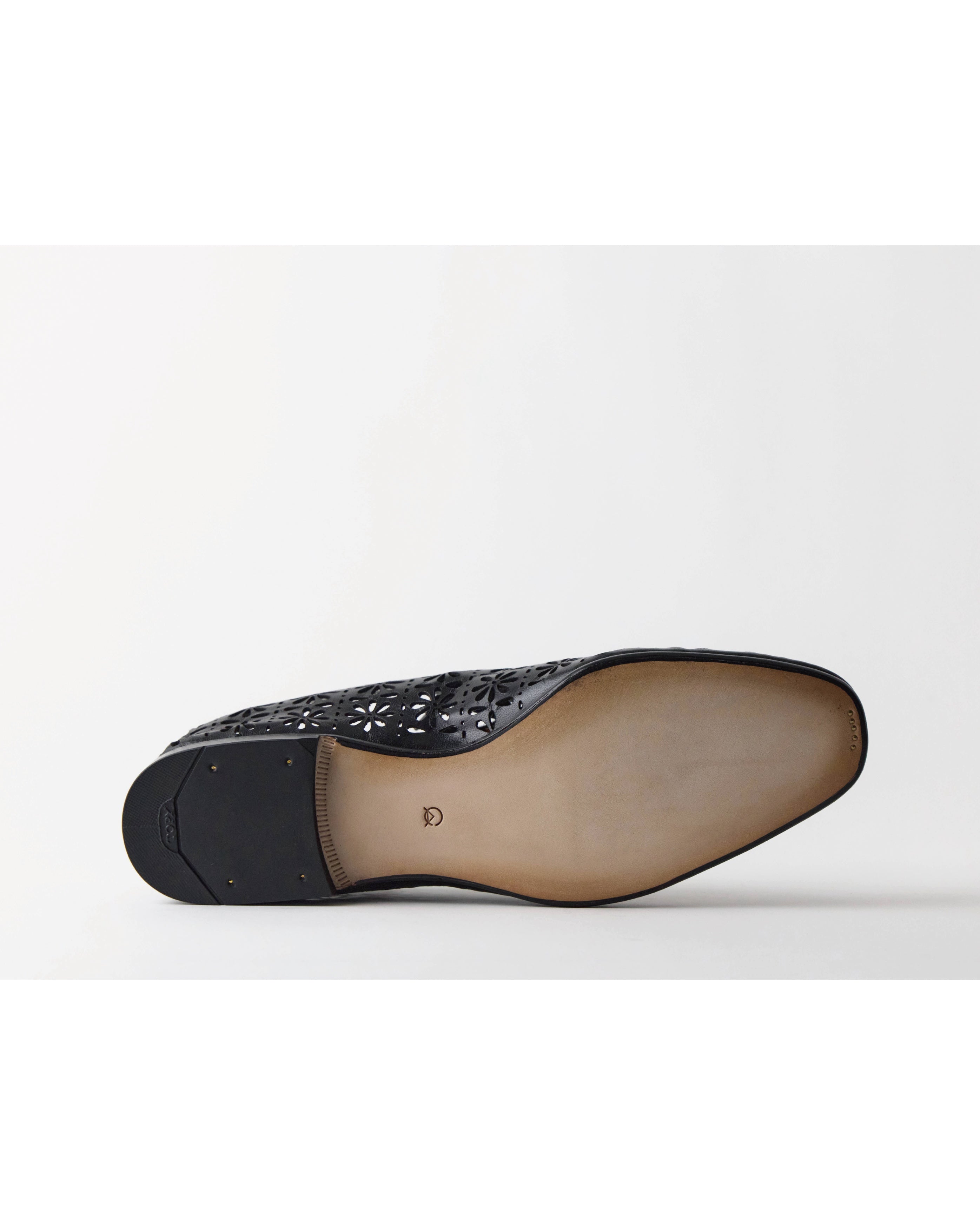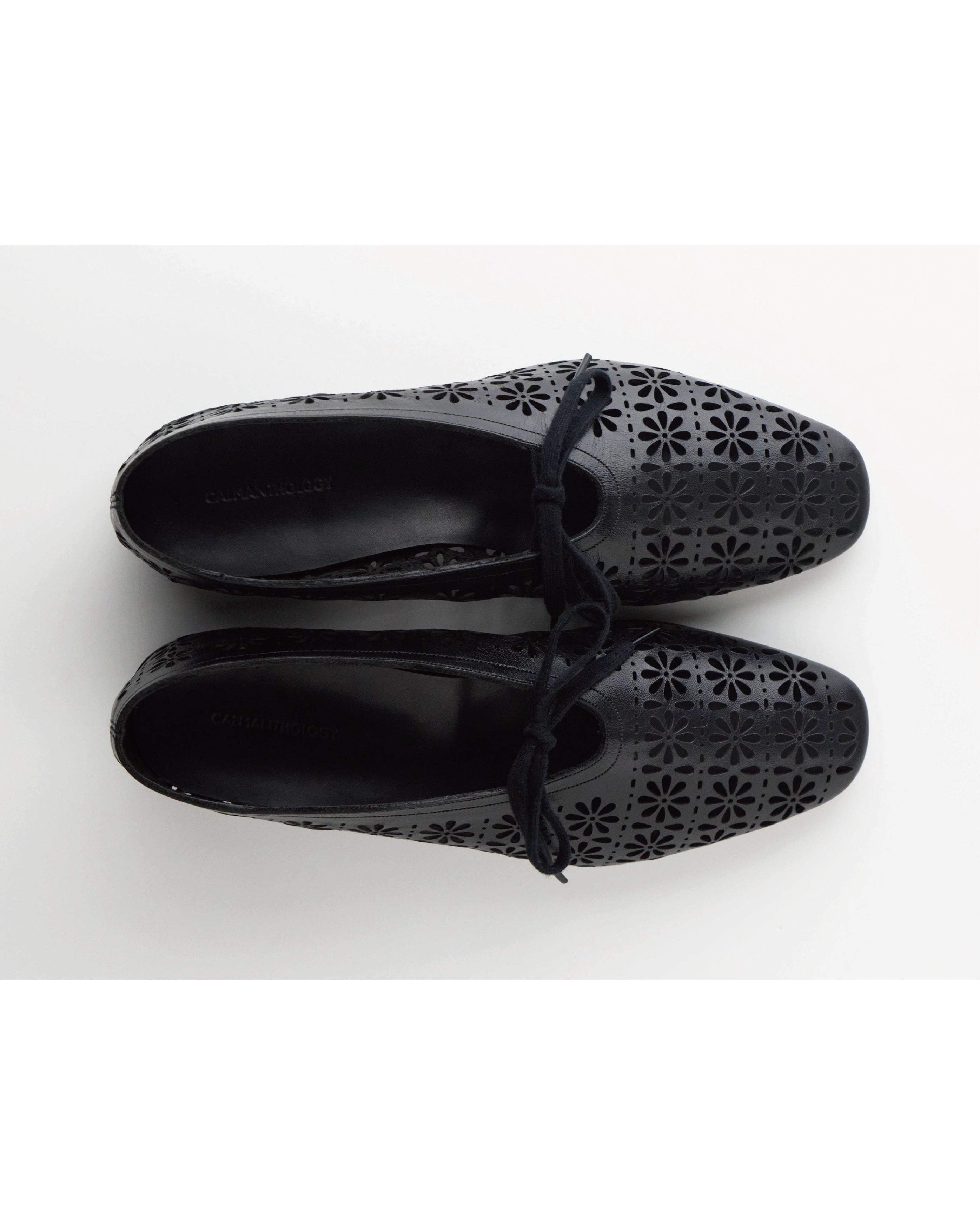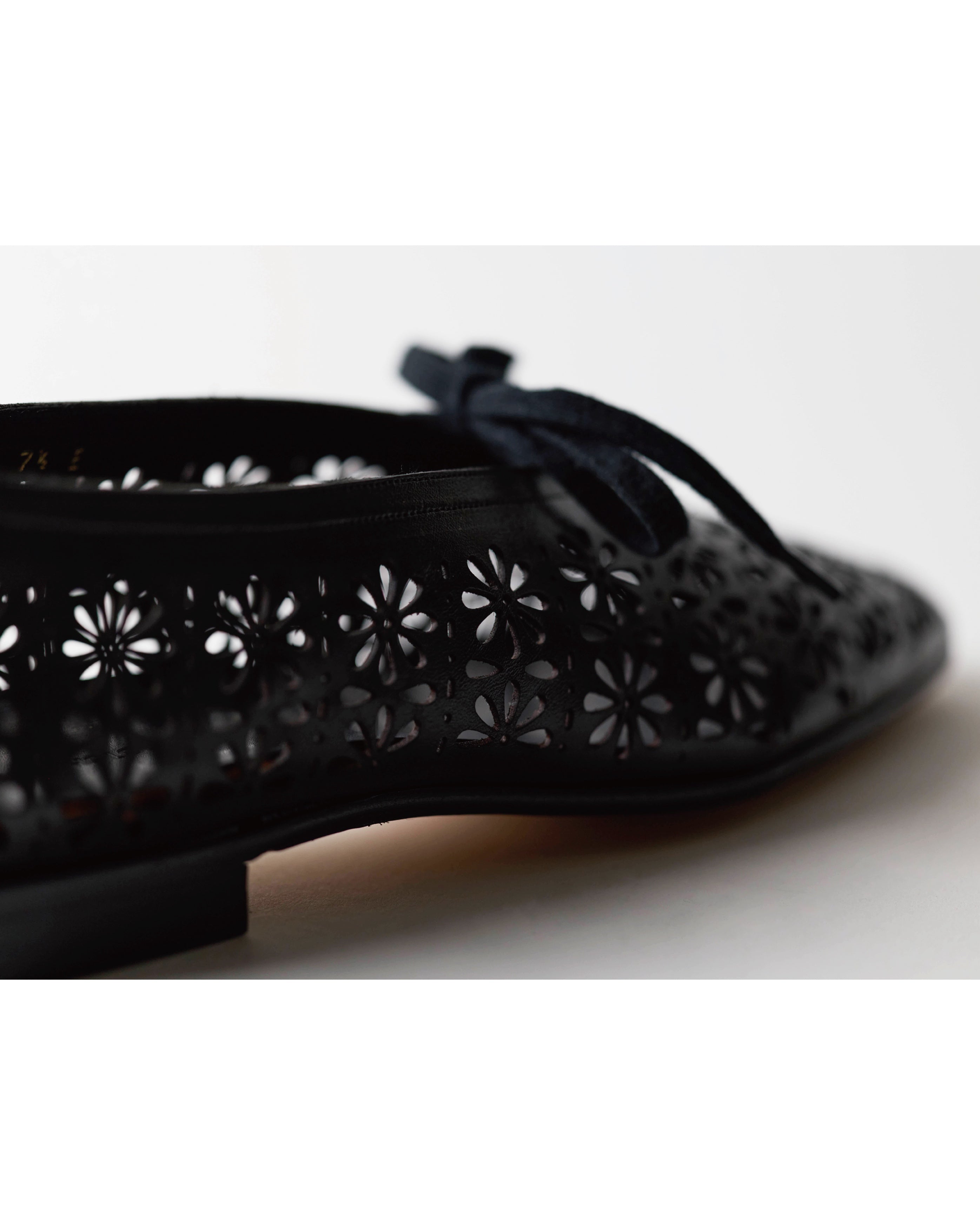 パンプスカットのデザインをベースに花柄に抜いたレーザーカット・足を固定する為に取り付けたリボン紐を加え、より華やかで優雅に見える履物として