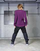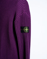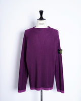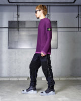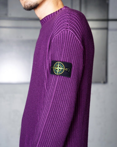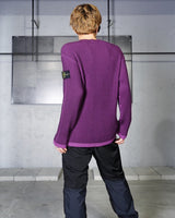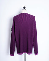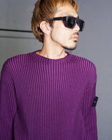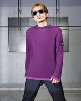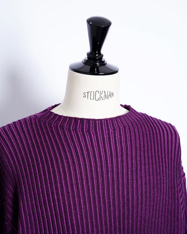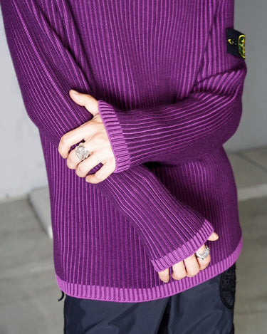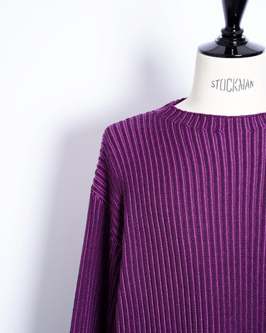 ・2色のパープルのコントラスト際立つリブ編みが特徴。動くたびに表のパープルから色味の異なるパープルが覗き、非常に表情豊かな質感を見せる編立です。