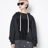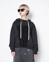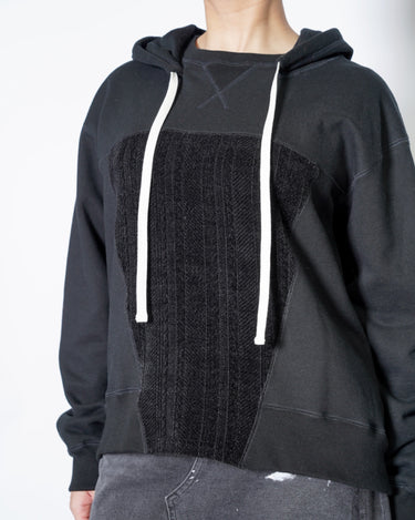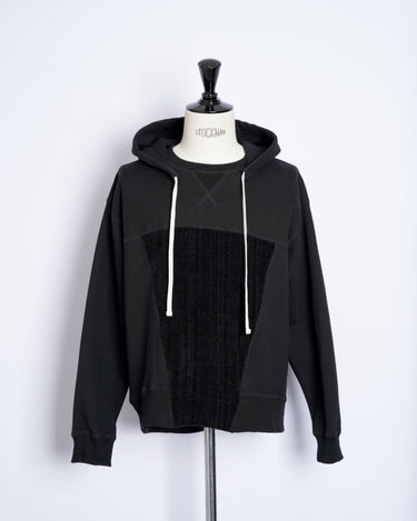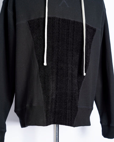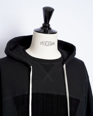 ・後付けのフードとVガゼット付きのスウェットシャツで、力強くビンテージ感のあるデザインに。