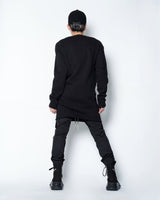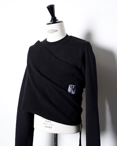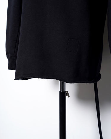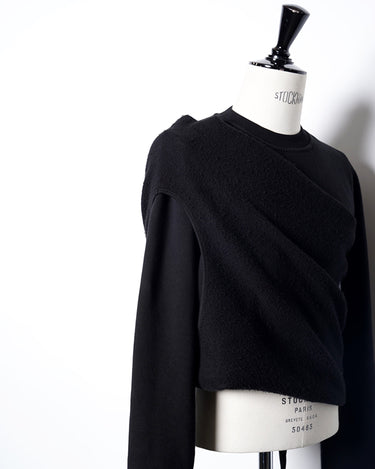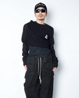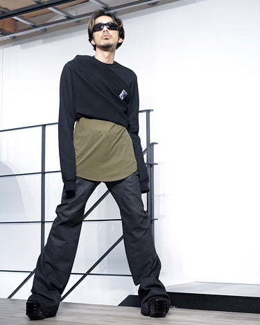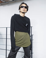 ・更にこの着方をすることにより表地と裏地の質感のコントラストを生み出し、胸にかけてのドレーピーなシワ感ができることで、同ブランドらしいデカダンスでストイックな雰囲気を演出します。