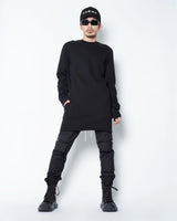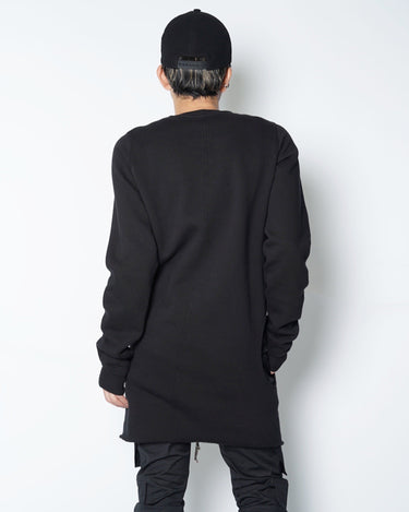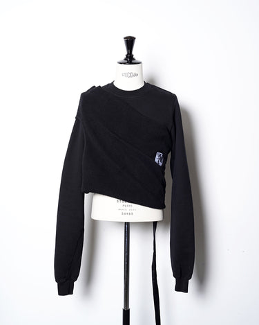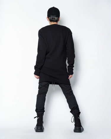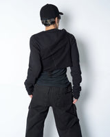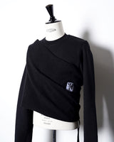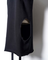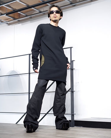 ・普通に着た状態でサイドに広く開いたホールに袖を通して着ることにより、裾が裏返って着丈が一気に短くなり、メリハリの効いたシルエットで着ることが可能に。