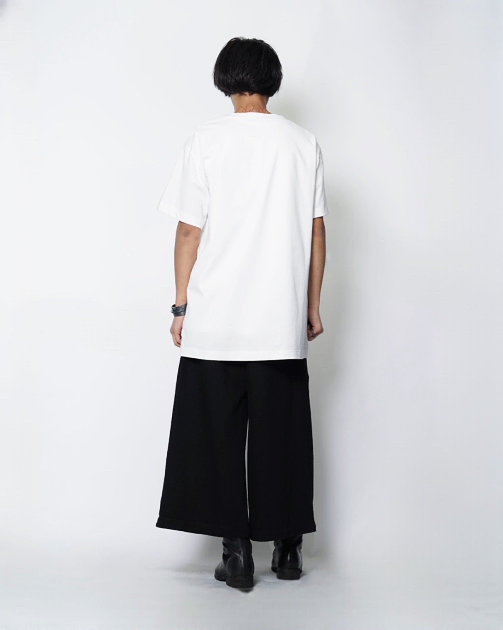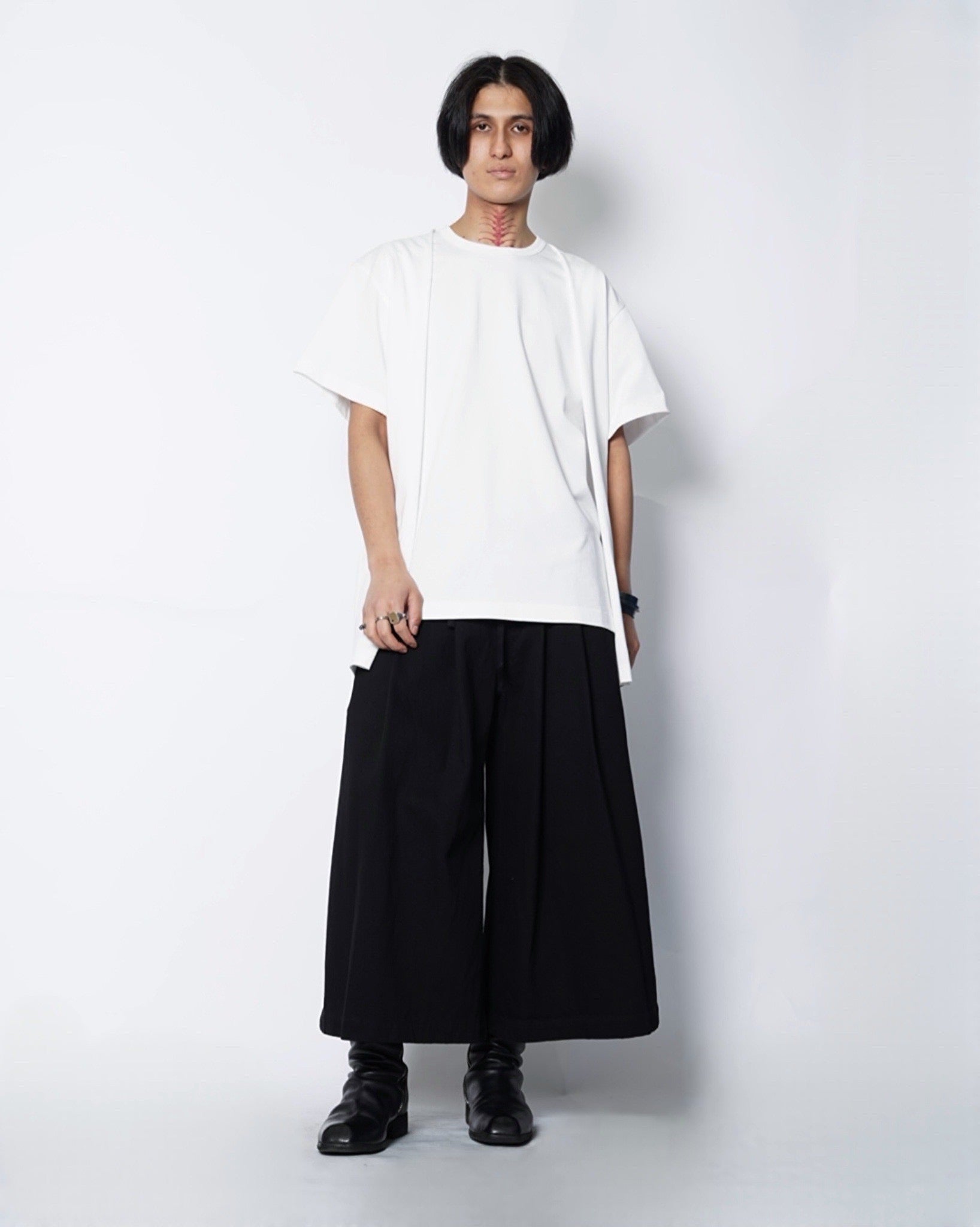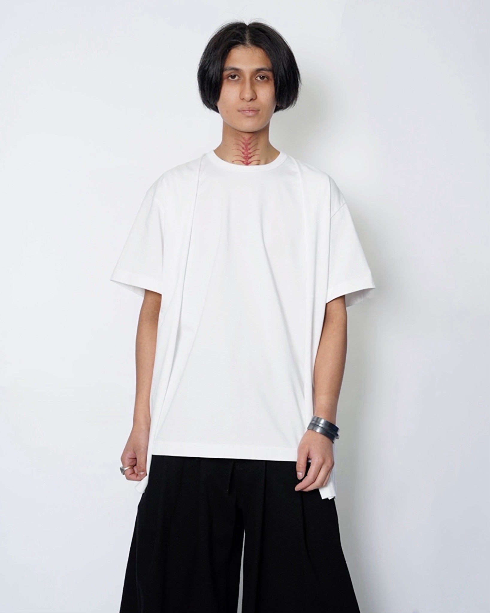 ・Tシャツの前身頃を大胆にカットオフすることで、羽織のようなニュアンスが生まれ、軽やかな抜け感と動きを演出します。