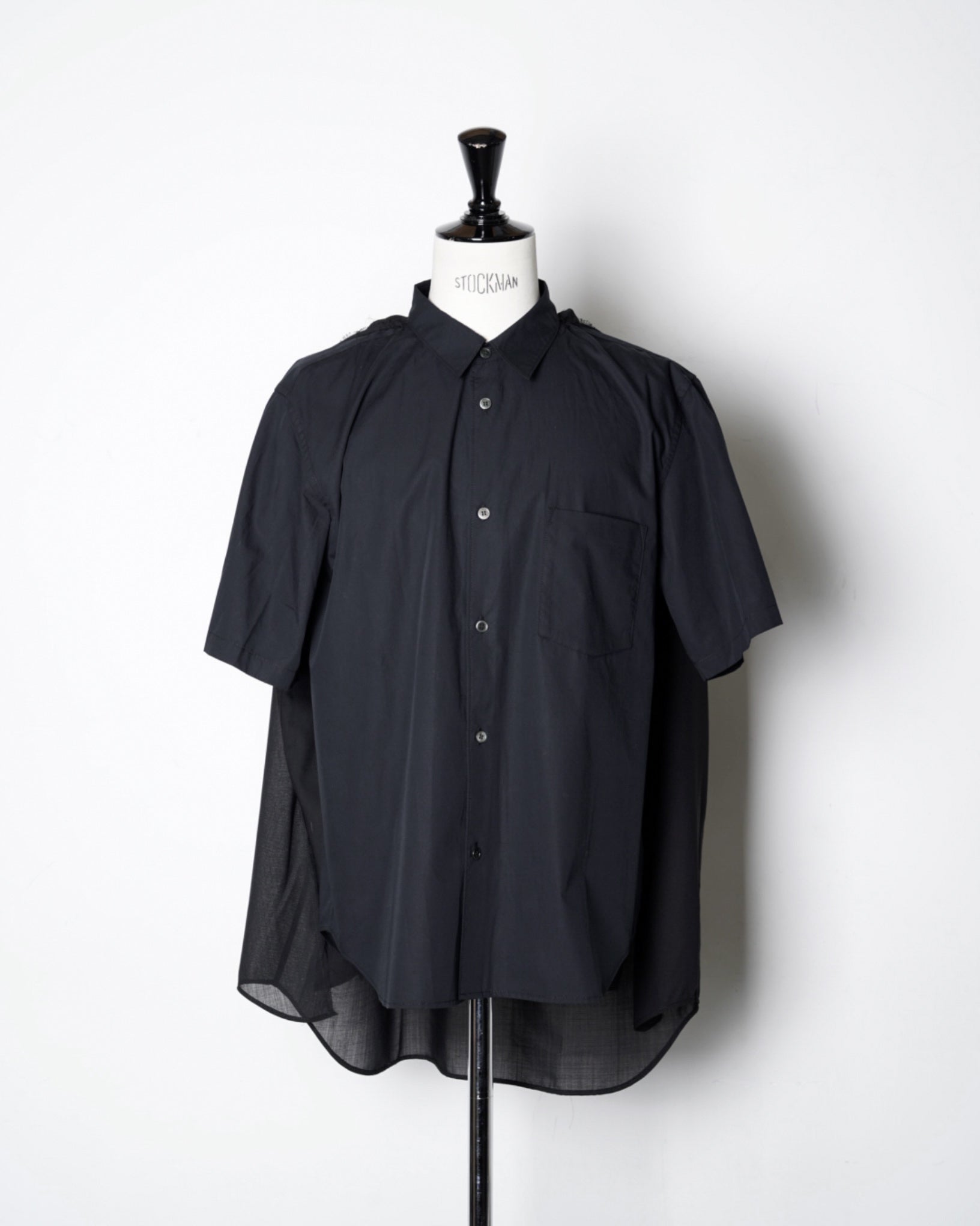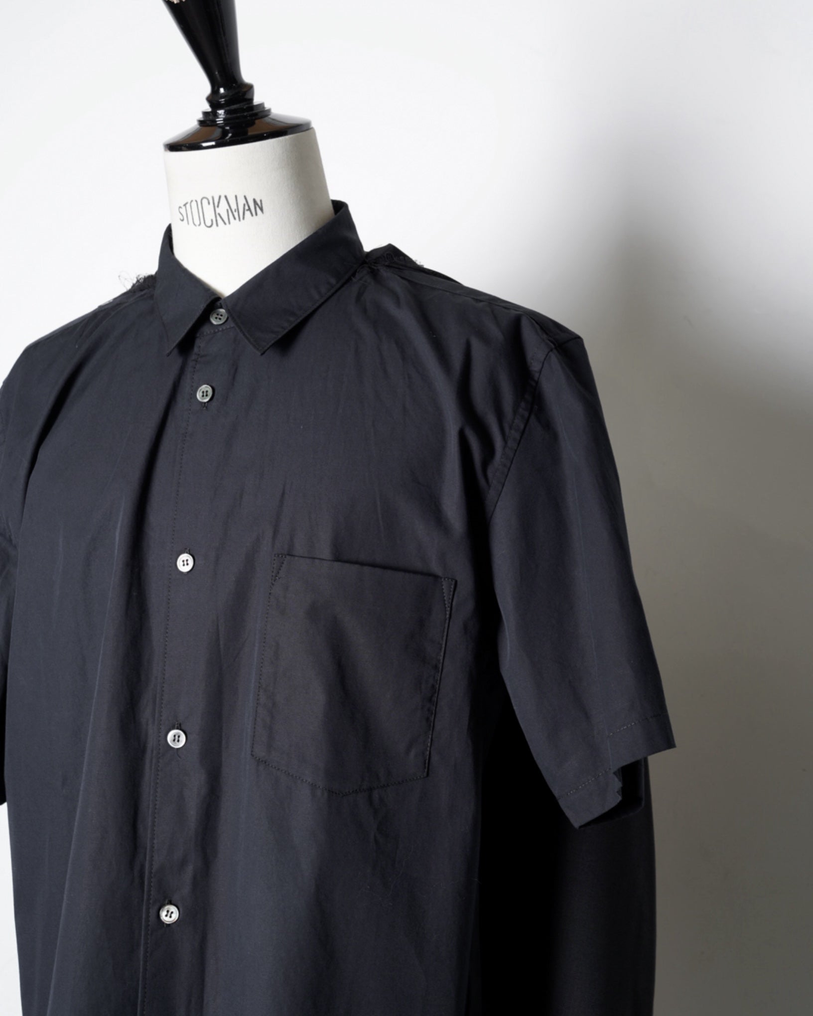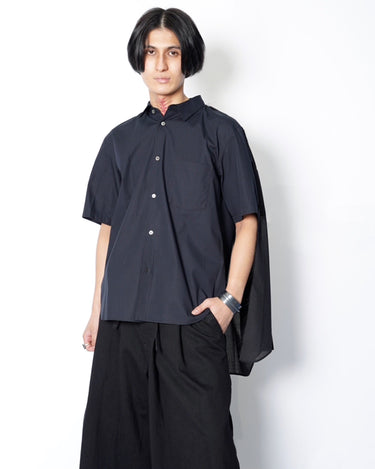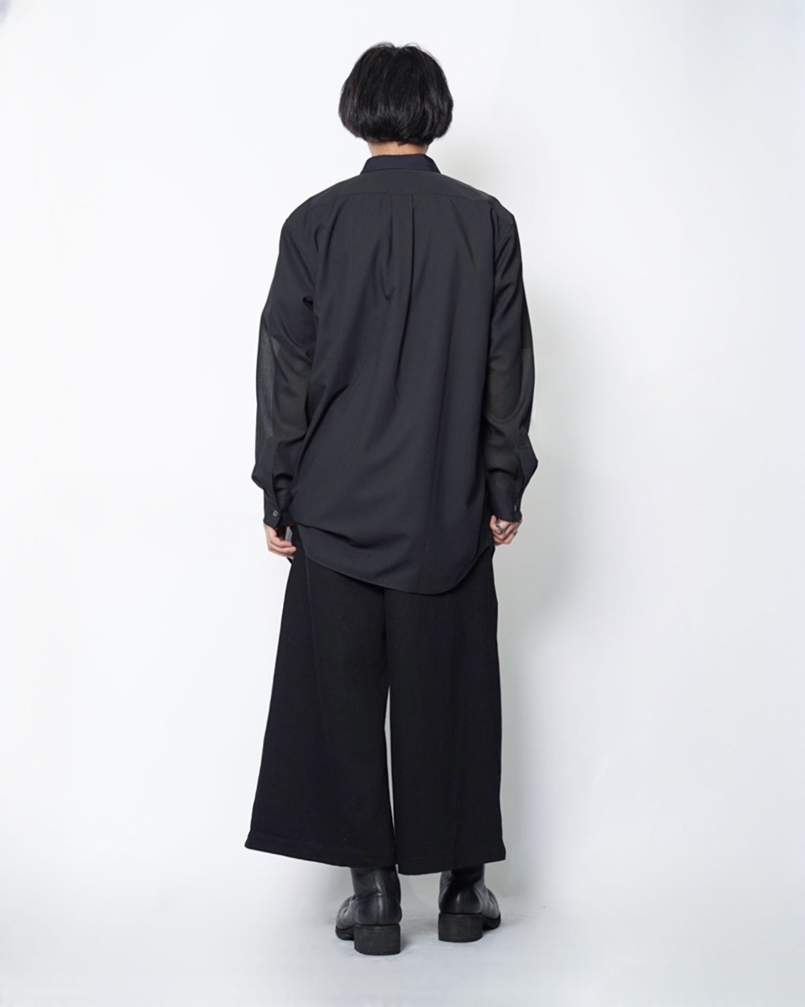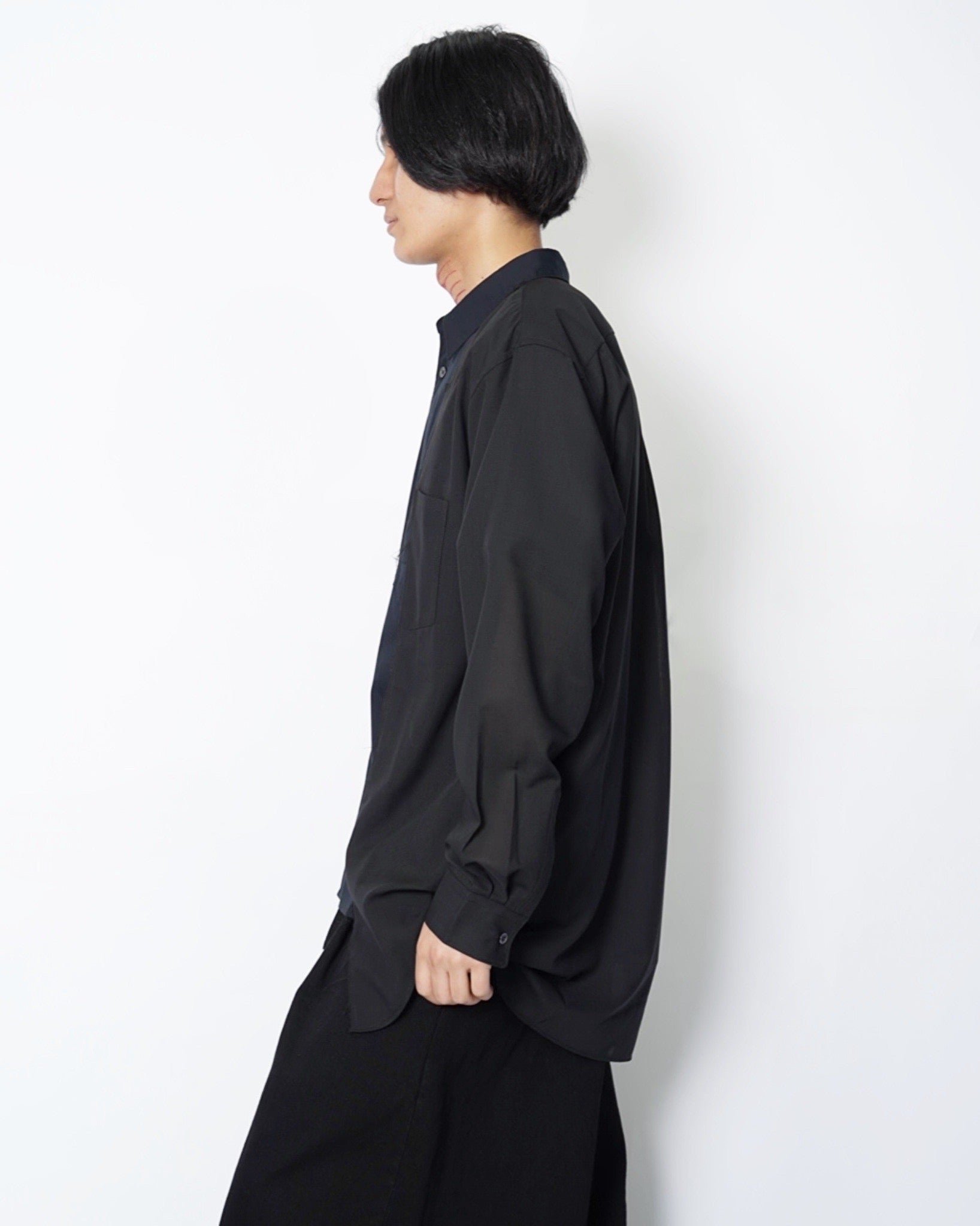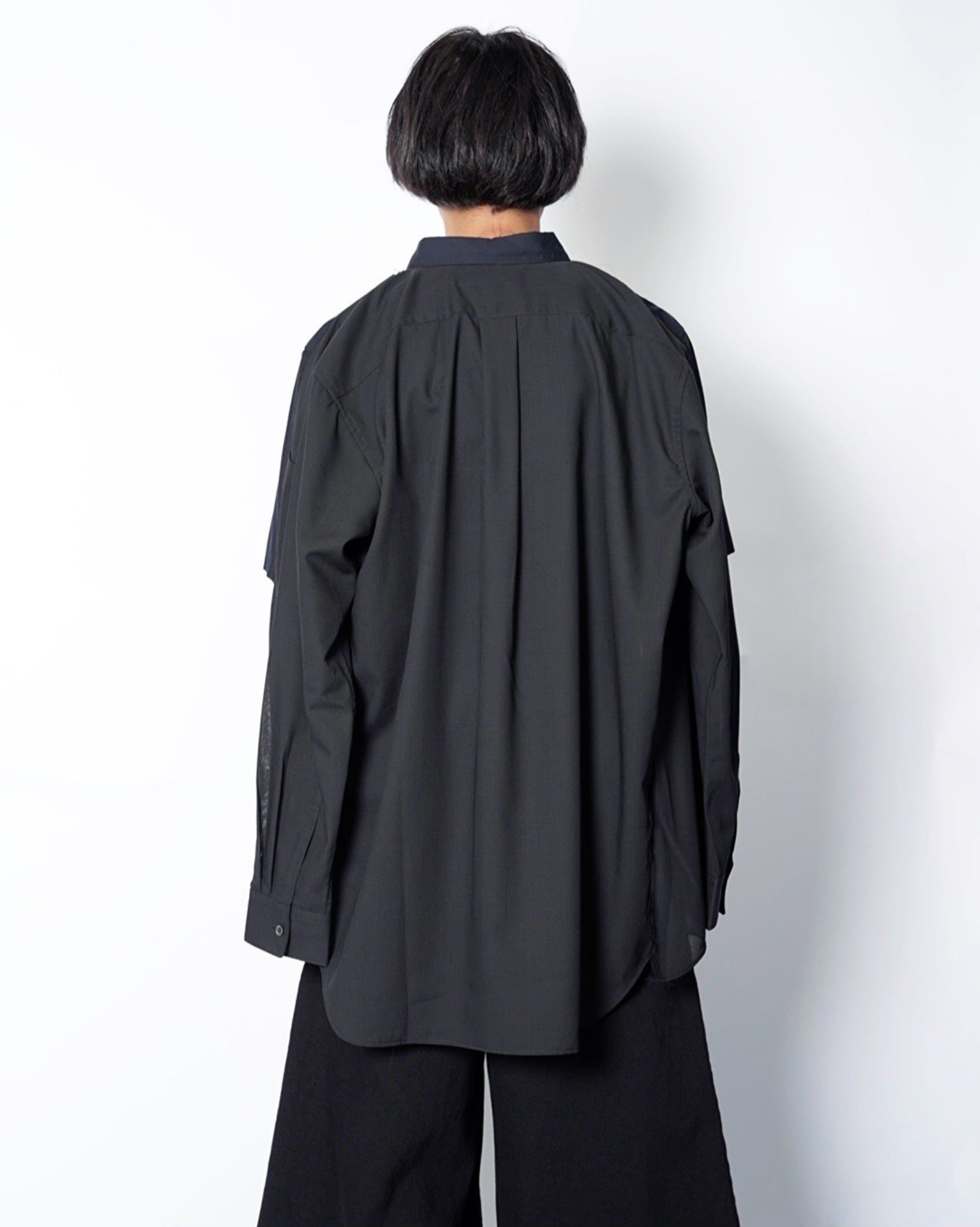 ・薄手のウールポリエステルを使用した長袖シャツと、コットン素材の半袖シャツをレイヤードしたデザイン。