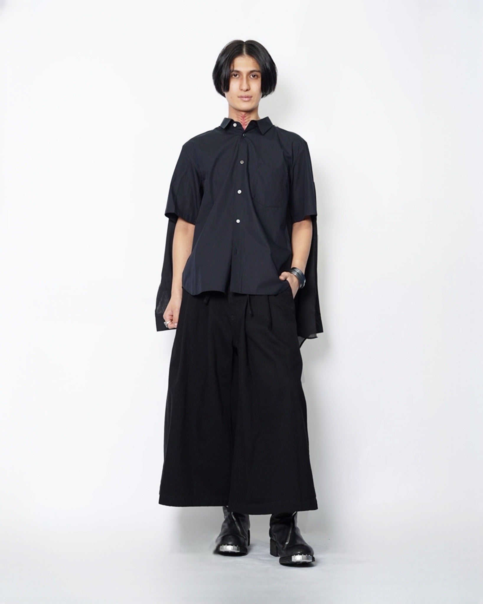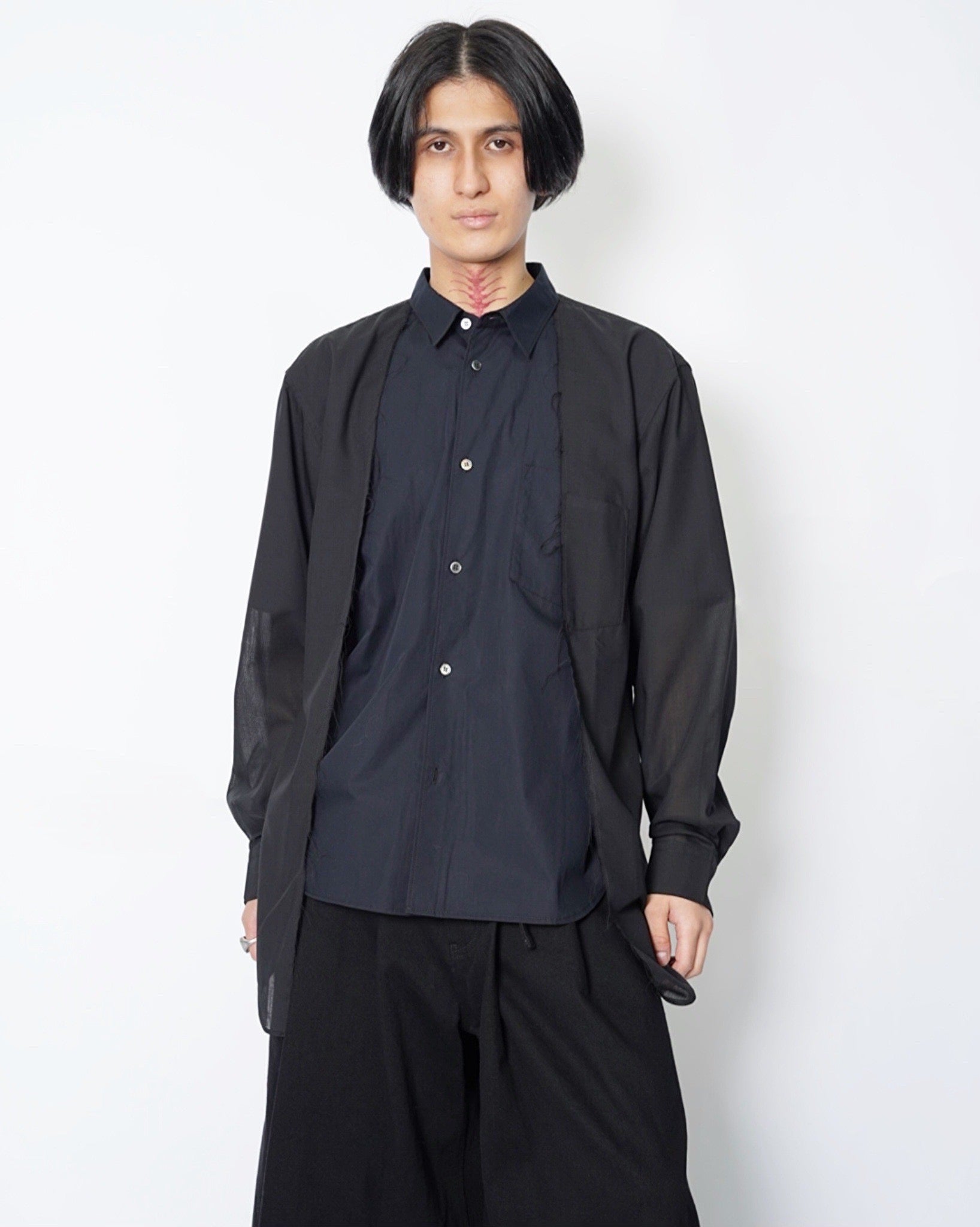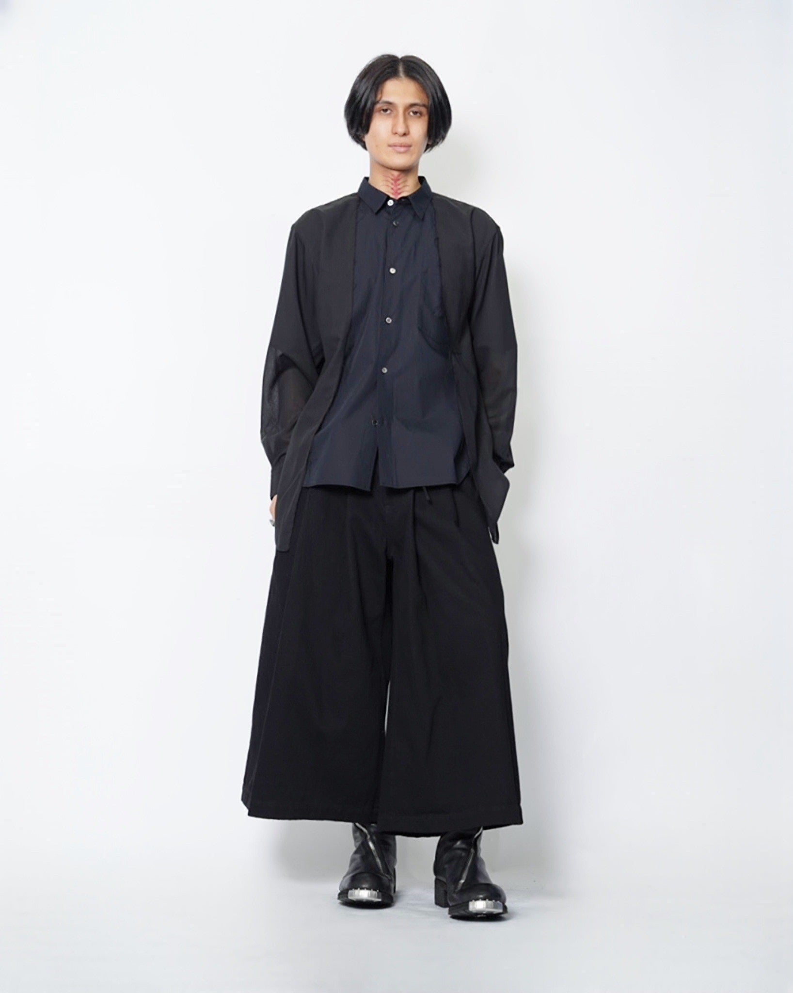 ・長袖シャツの前端をカットオフすることで、羽織のようなニュアンスも生まれ、軽やかな抜け感を演出。