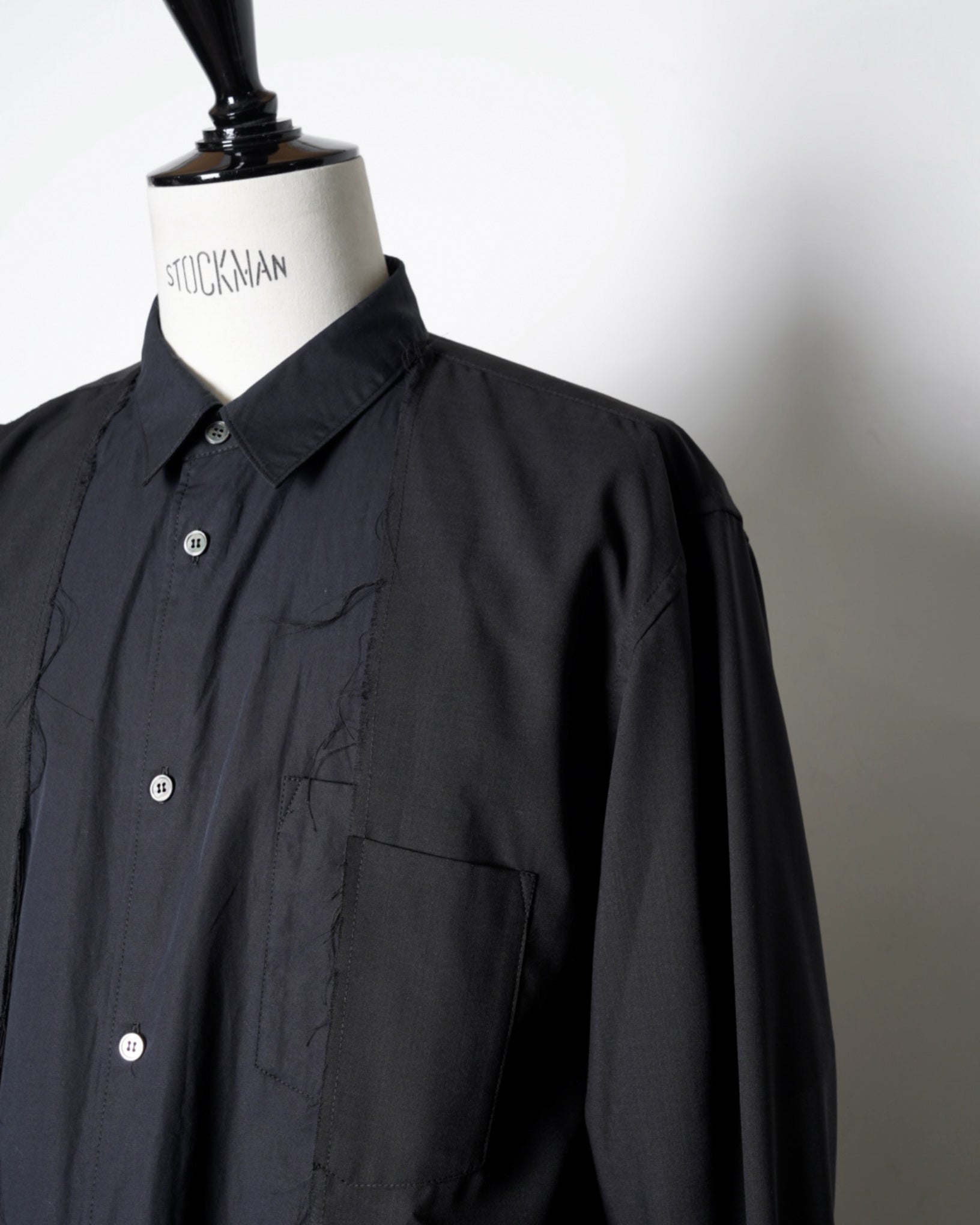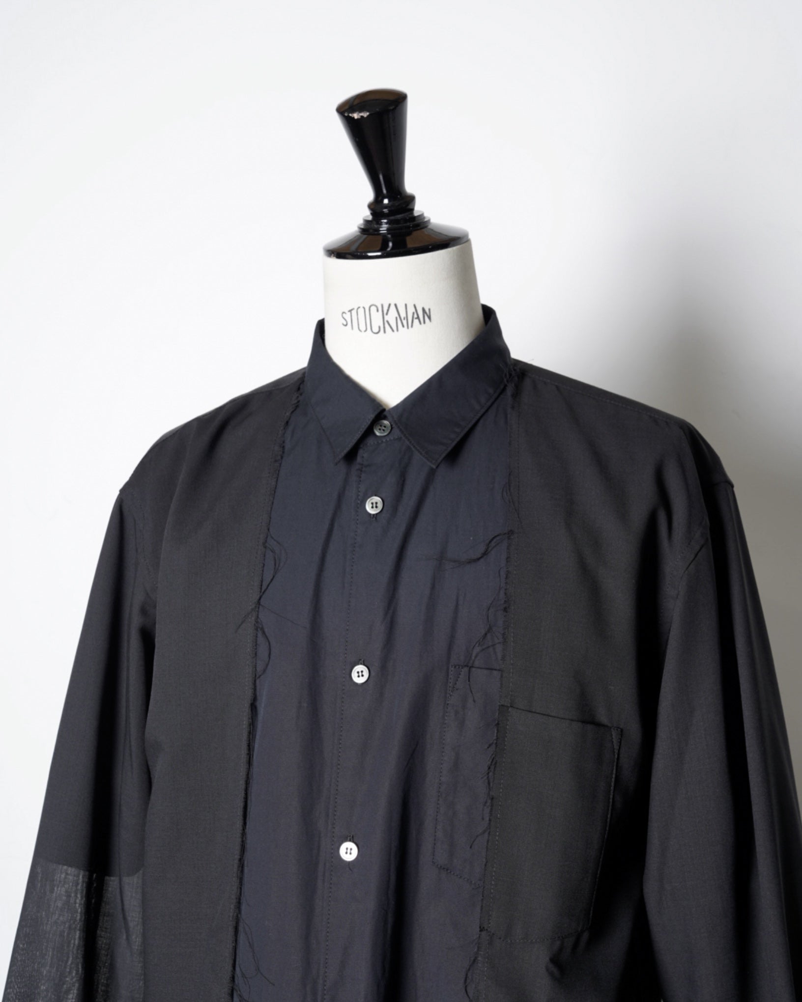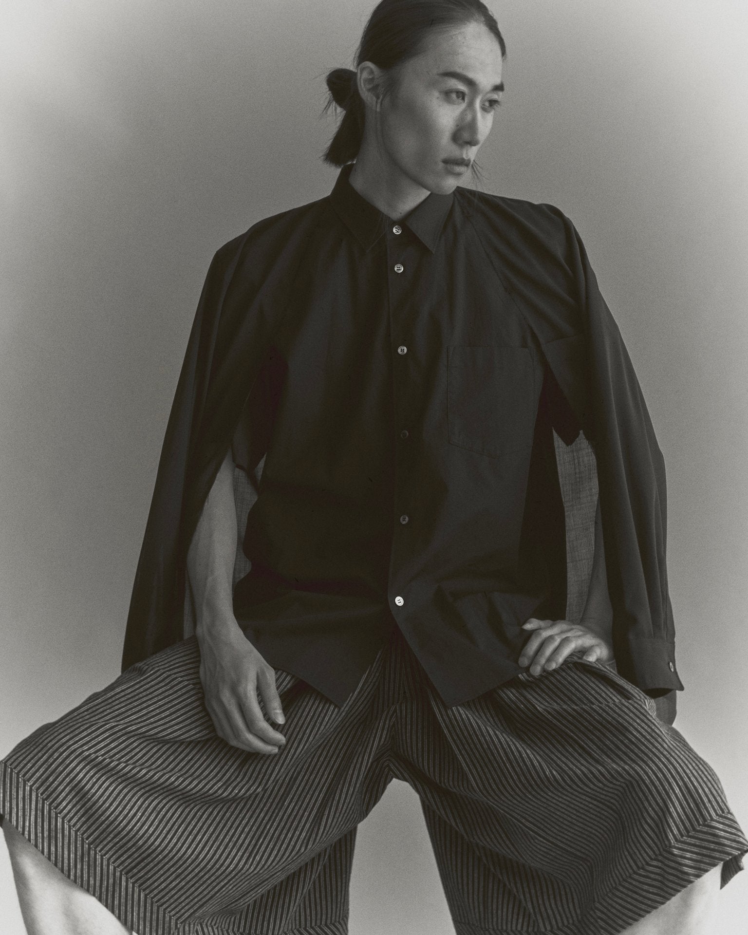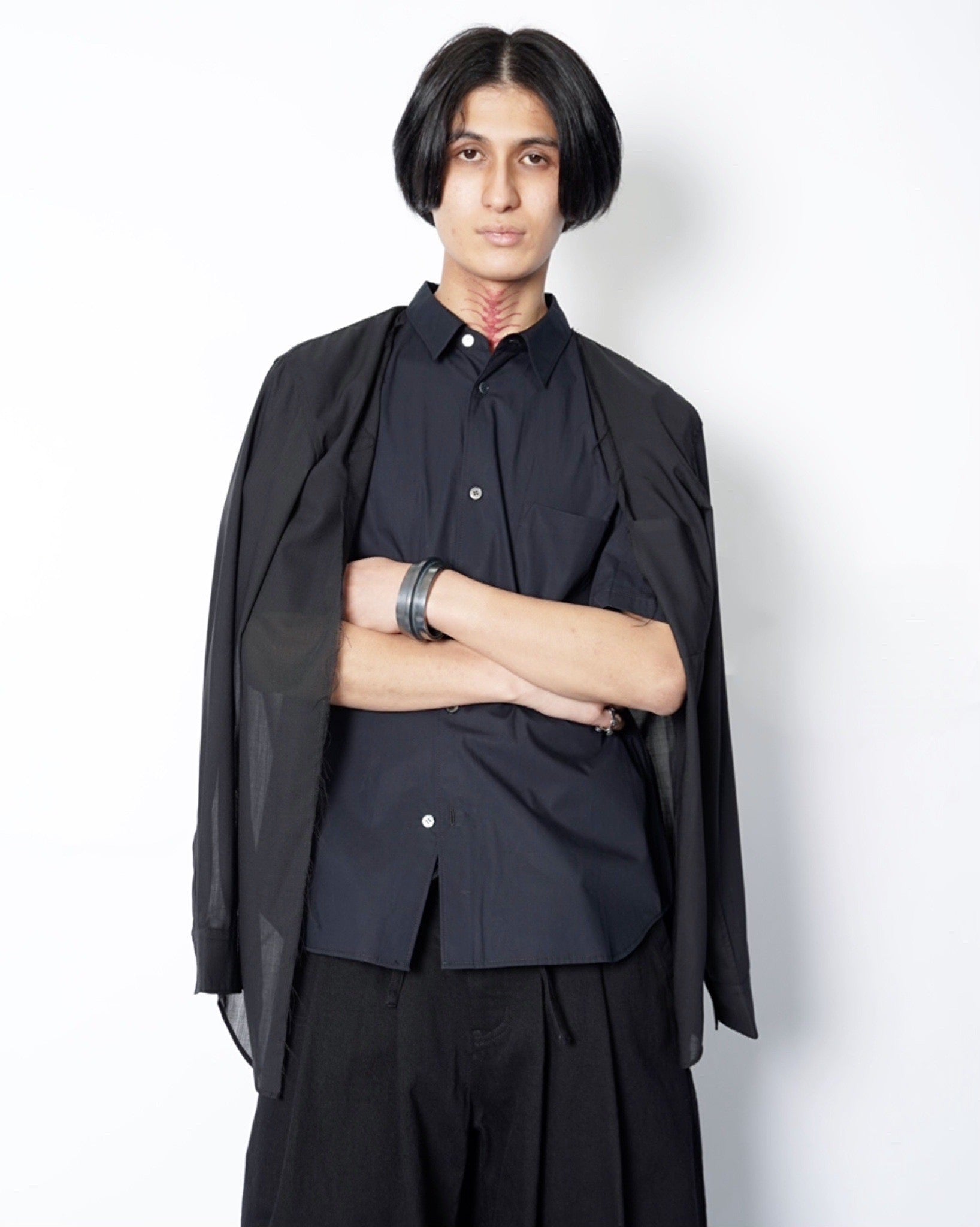 ・長袖シャツの前端をカットオフすることで、羽織のようなニュアンスも生まれ、軽やかな抜け感を演出。