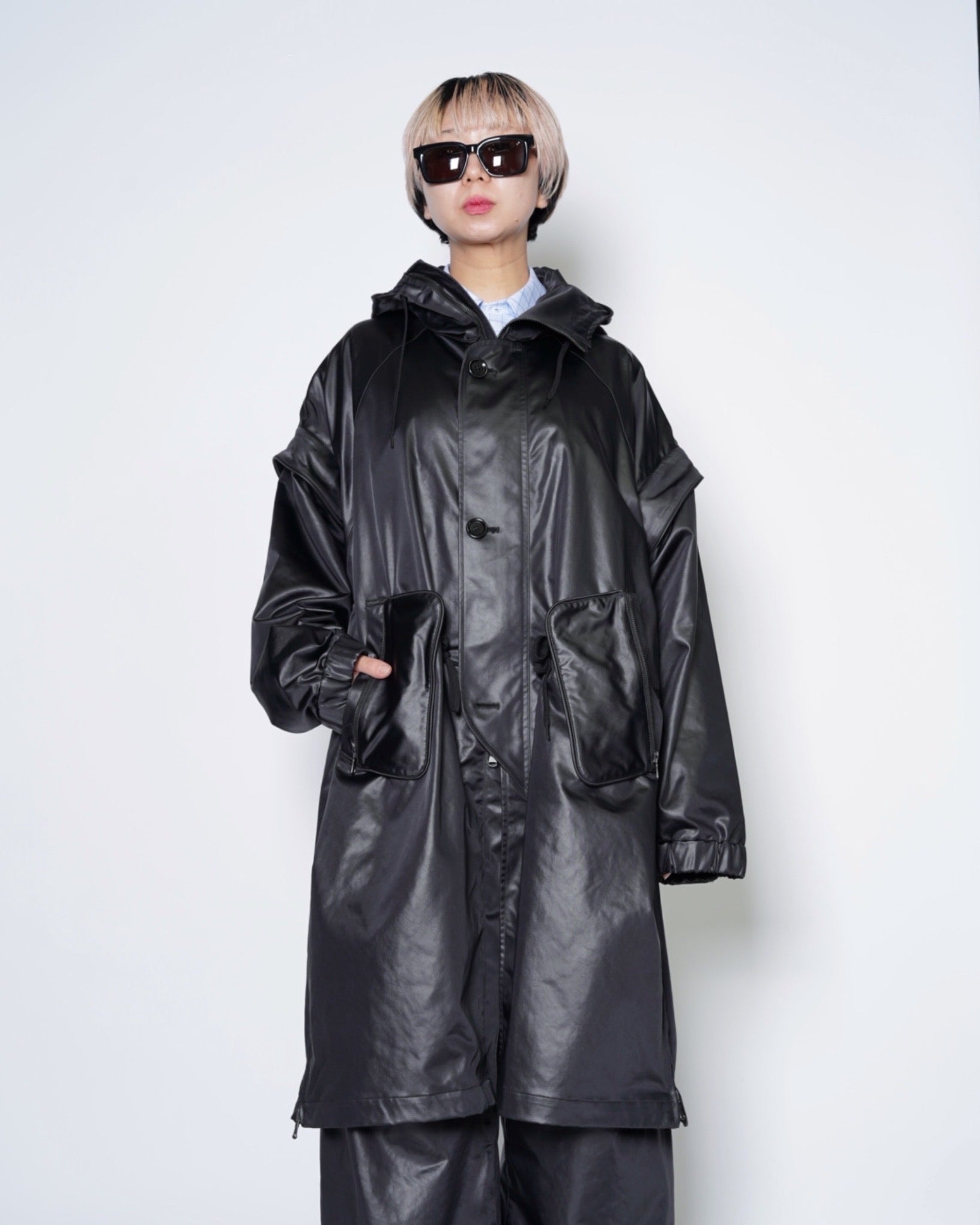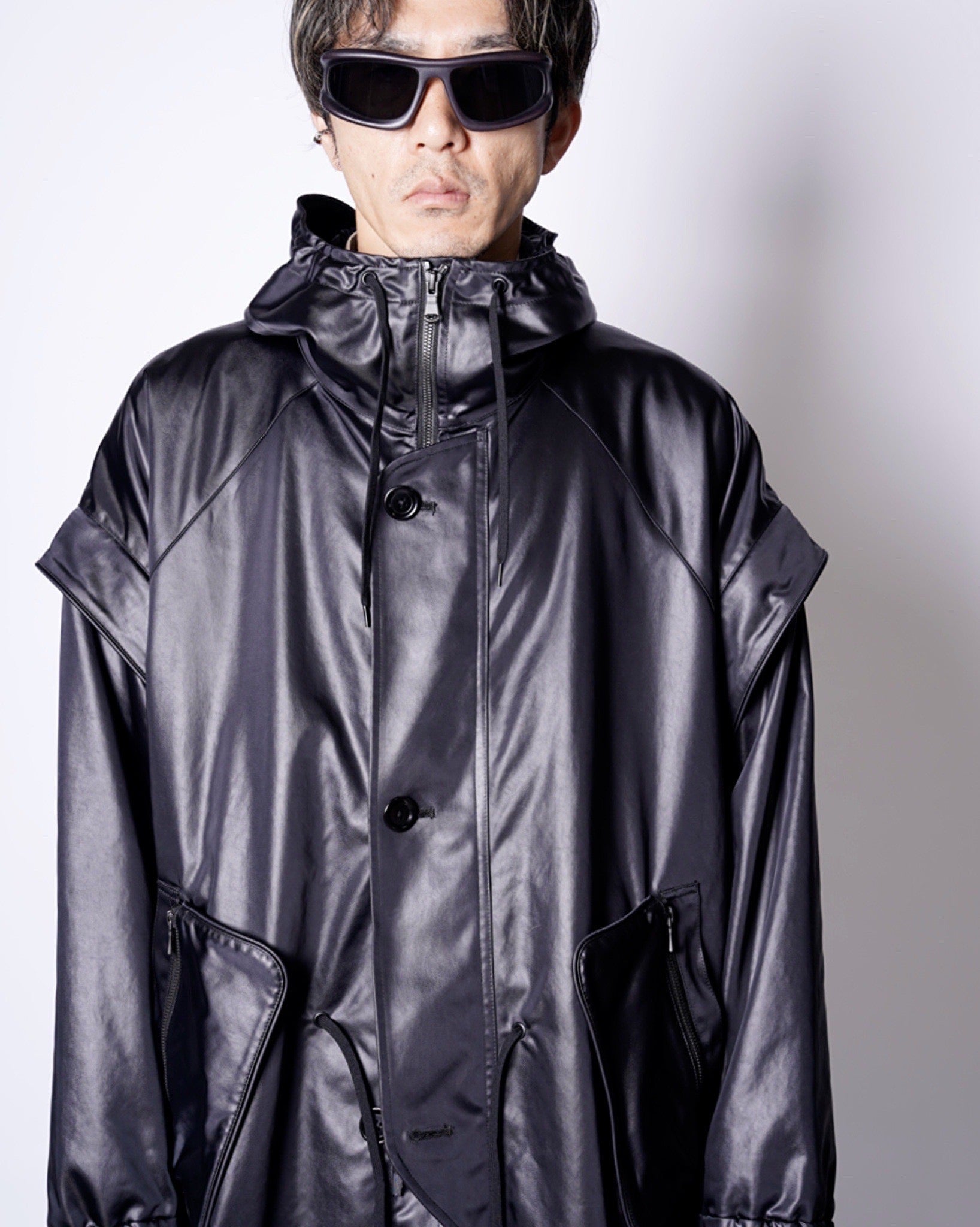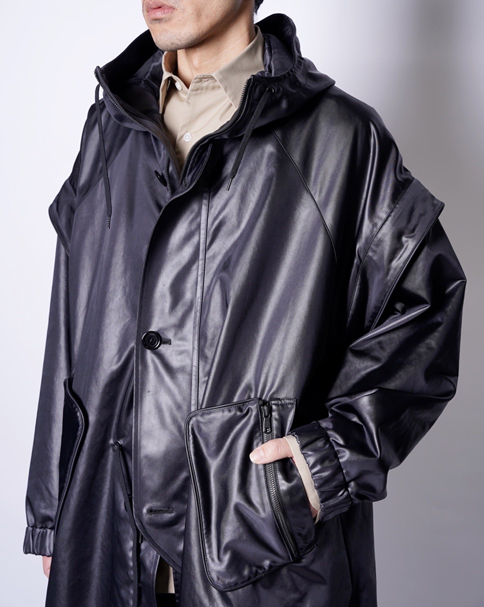 ・ヴィンテージレザーのような質感が特徴的なフーディーコート。