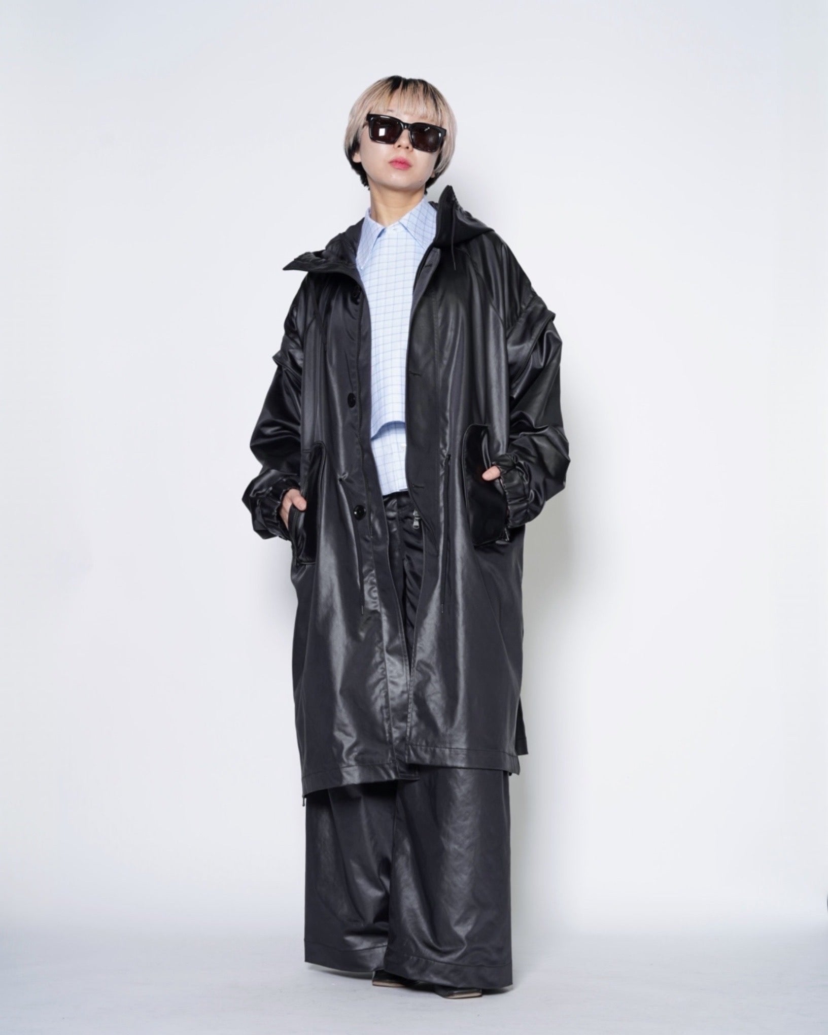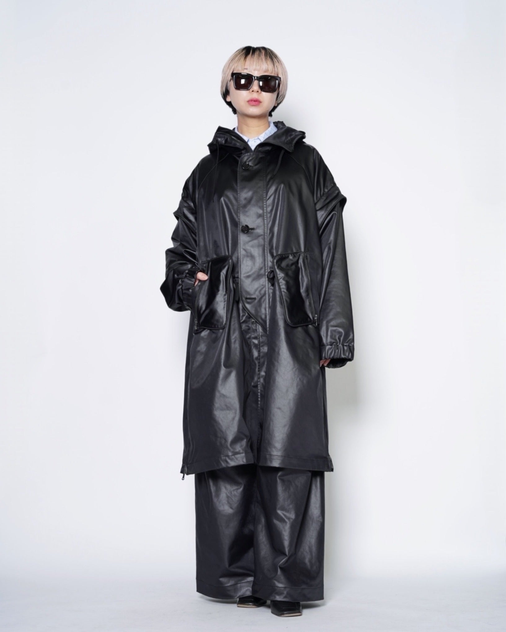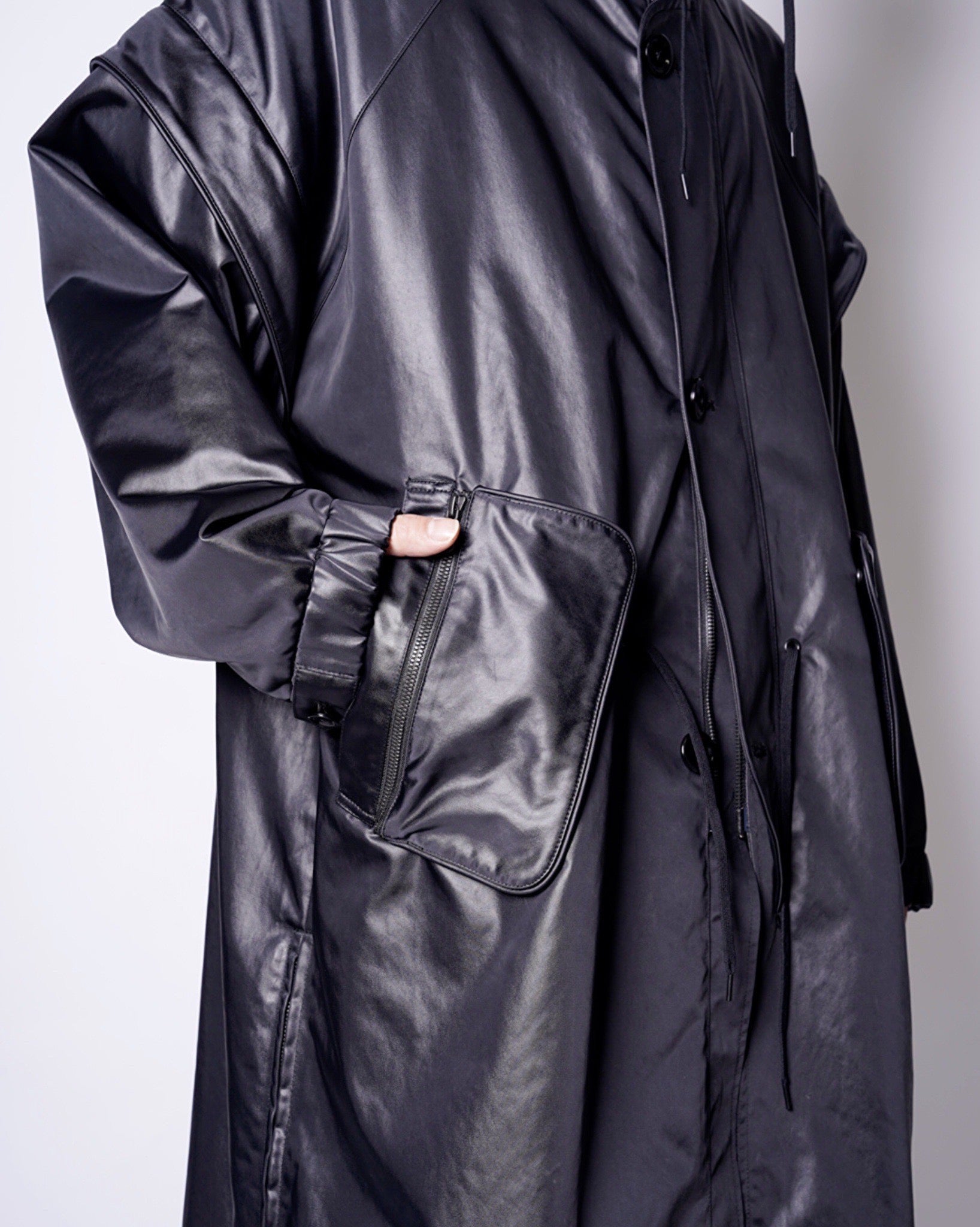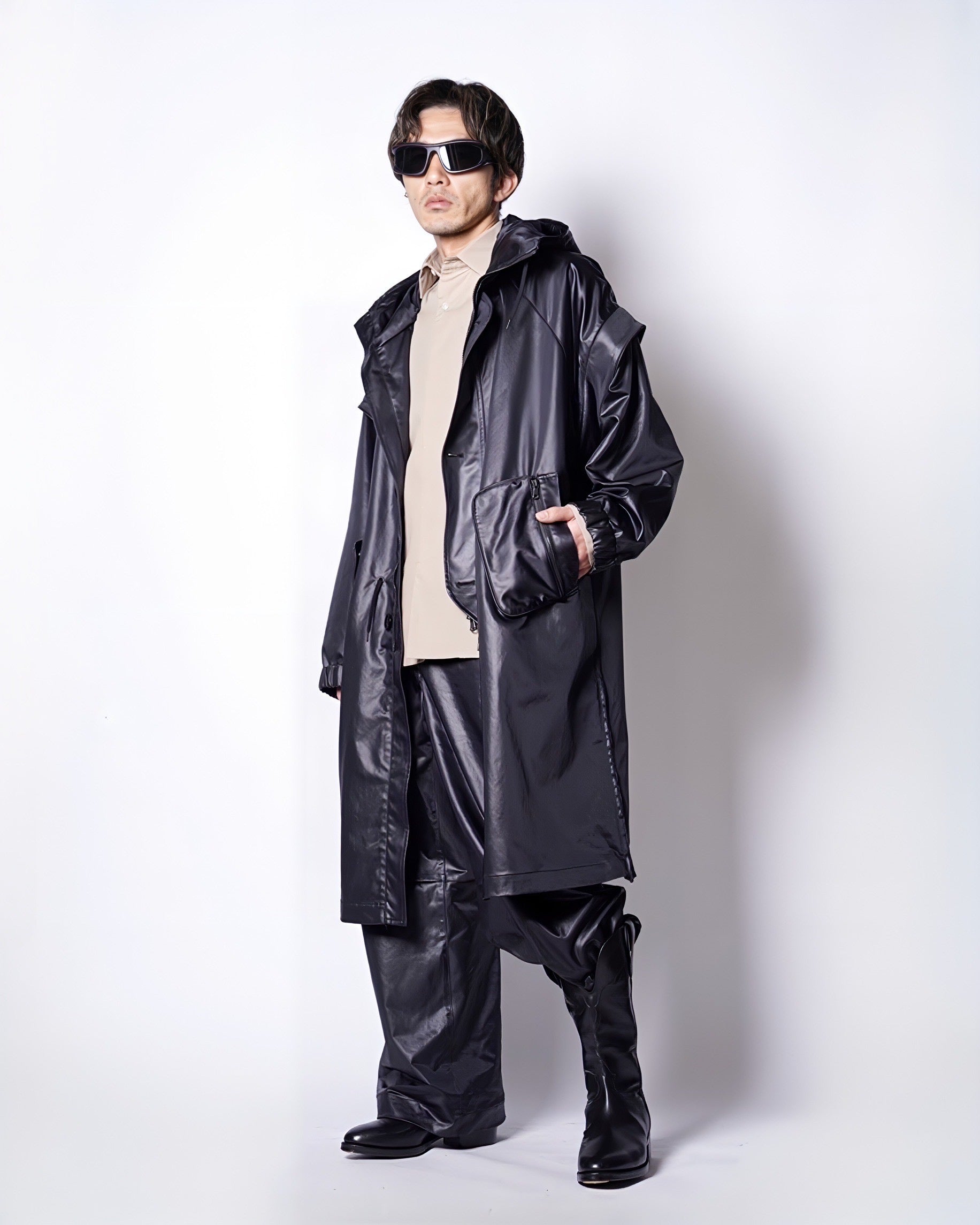 ・熱加工により重厚な表情を生み出しつつ、撥水性を備えた高機能素材でモードと実用性を融合させた佇まいが魅力。