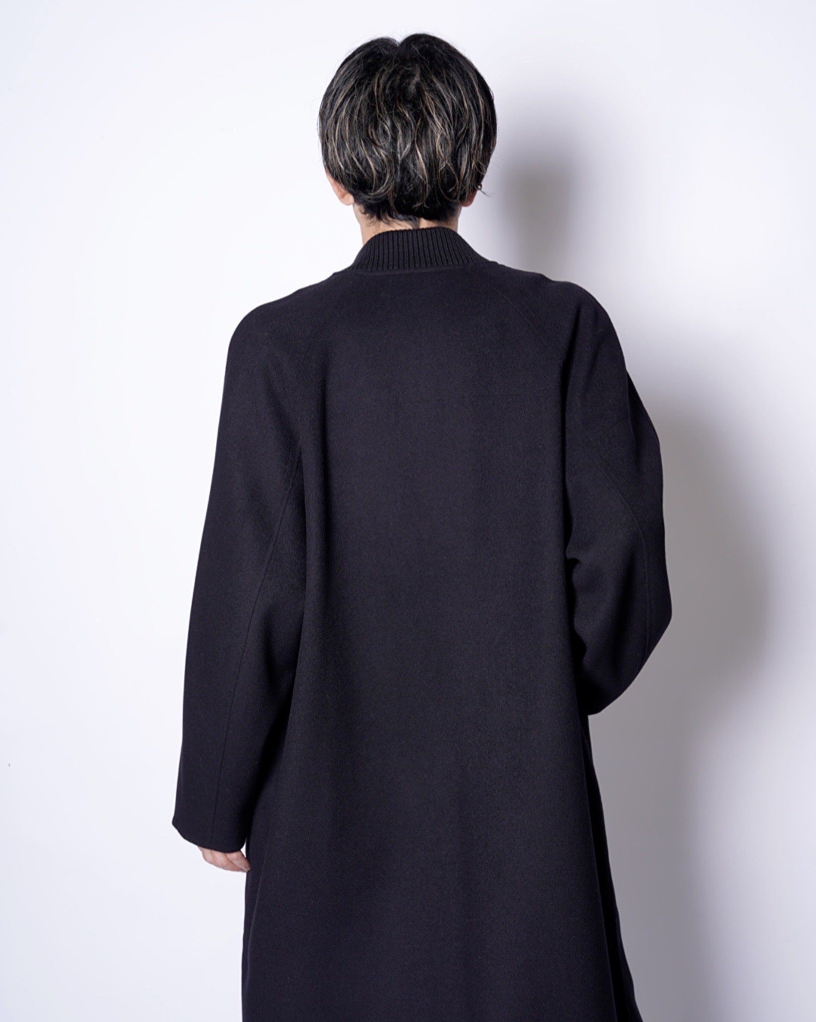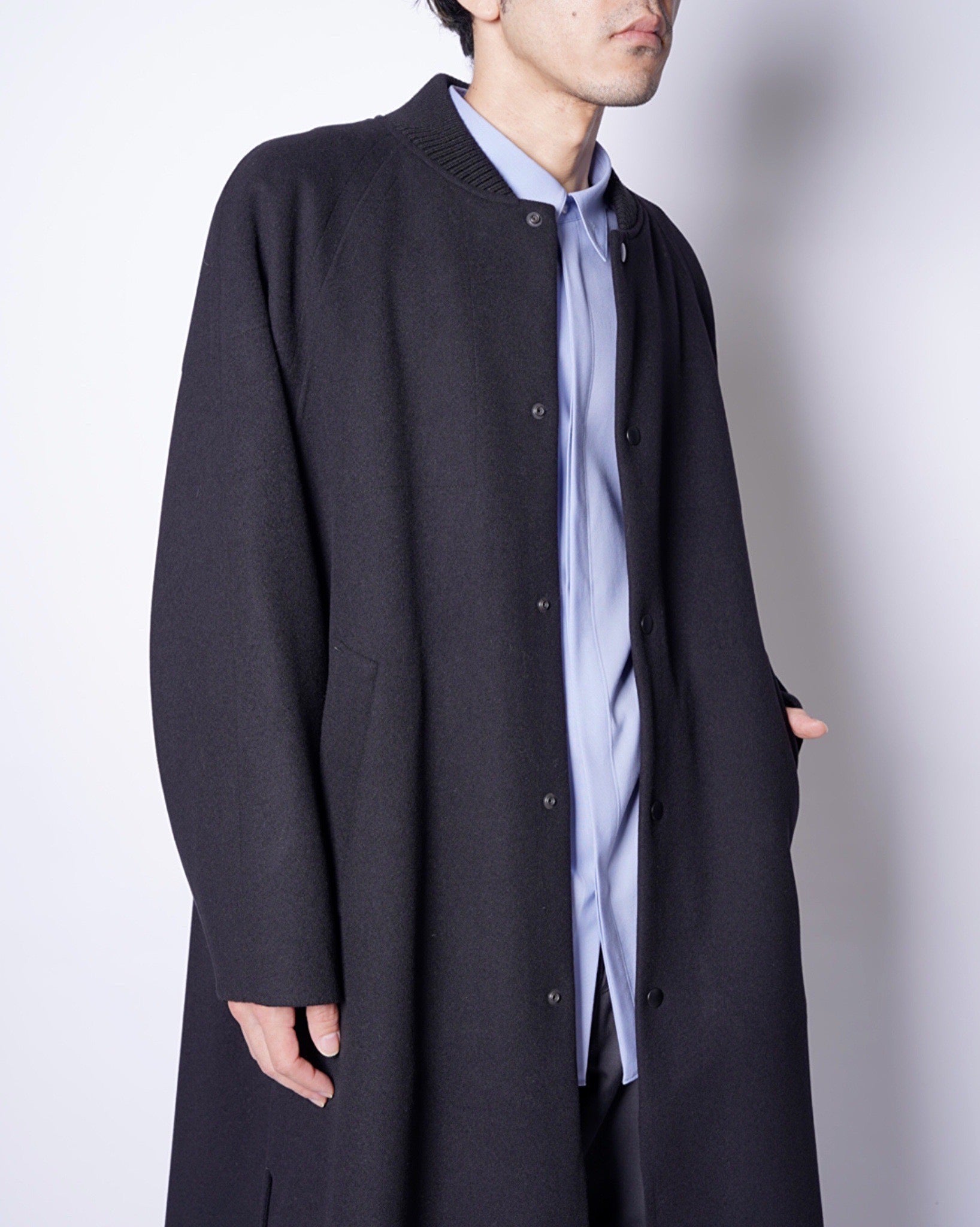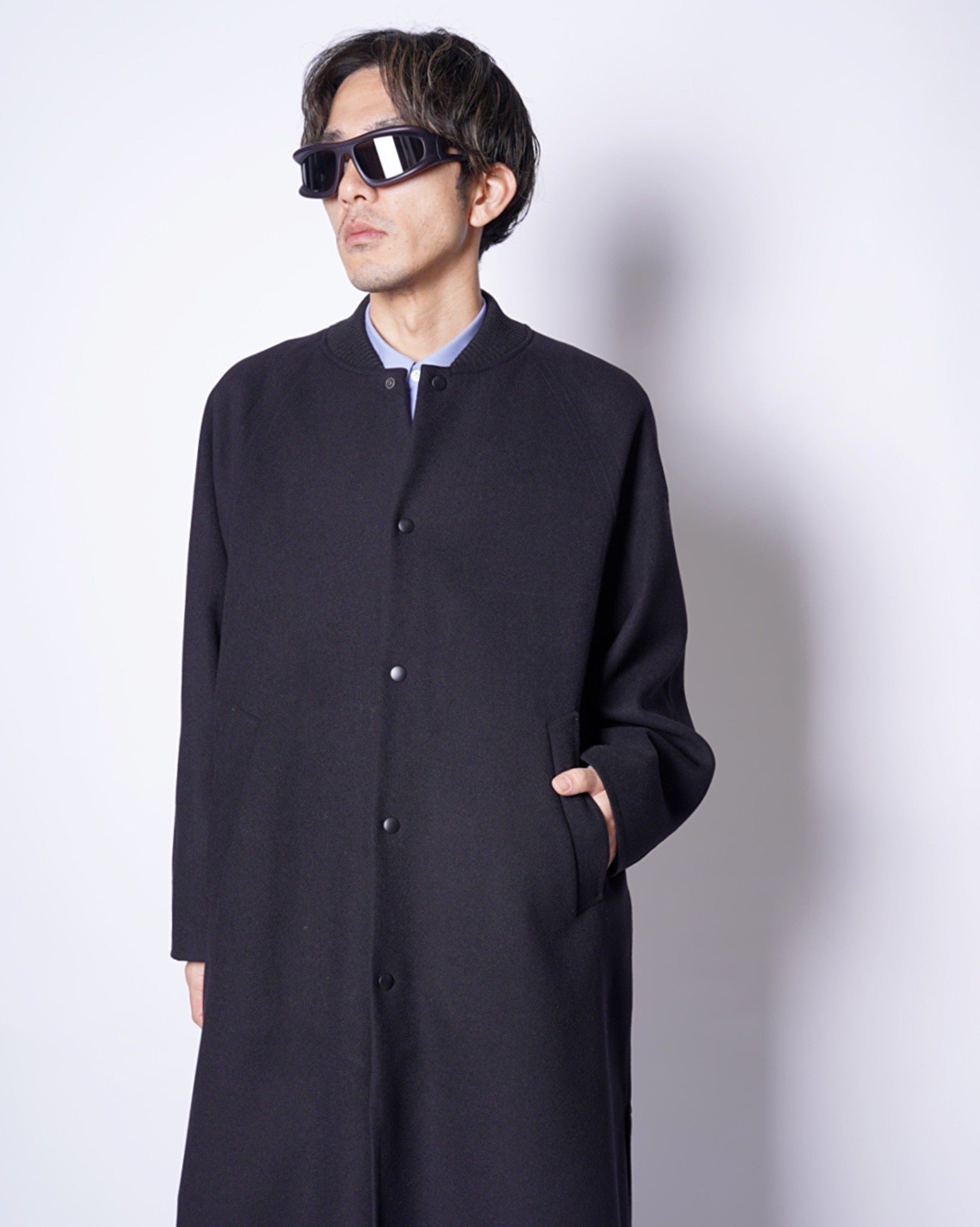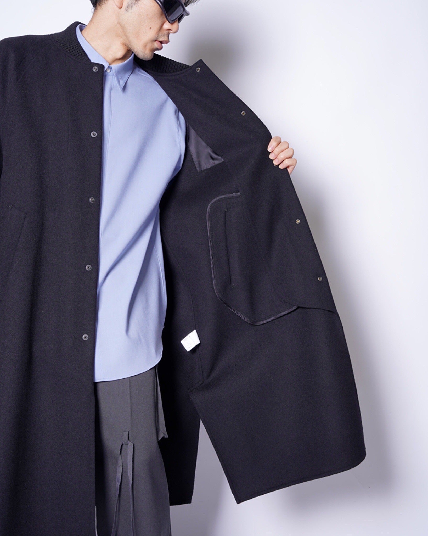 ・スタジアムジャンパーをベースにコートへ展開。職人の手まつりによる“リバー縫製”で仕立て上げ、シームのストレスがなく、軽くてシンプルな作りを追求した。