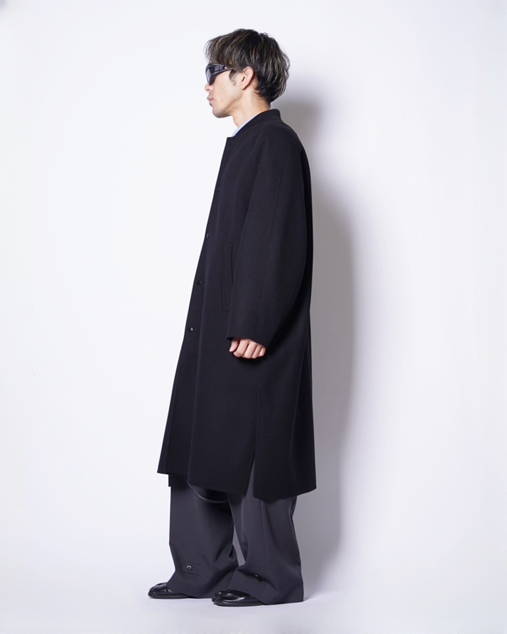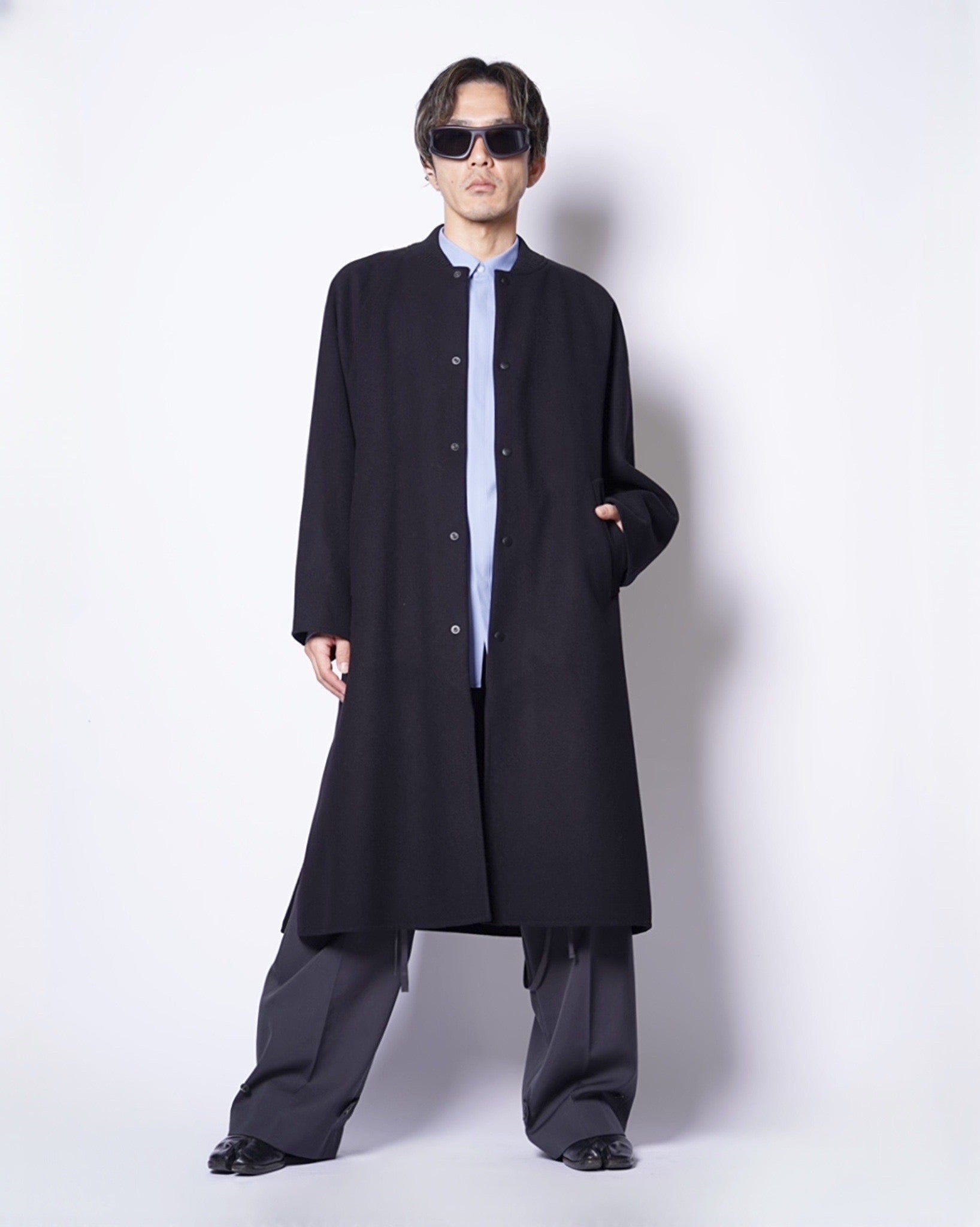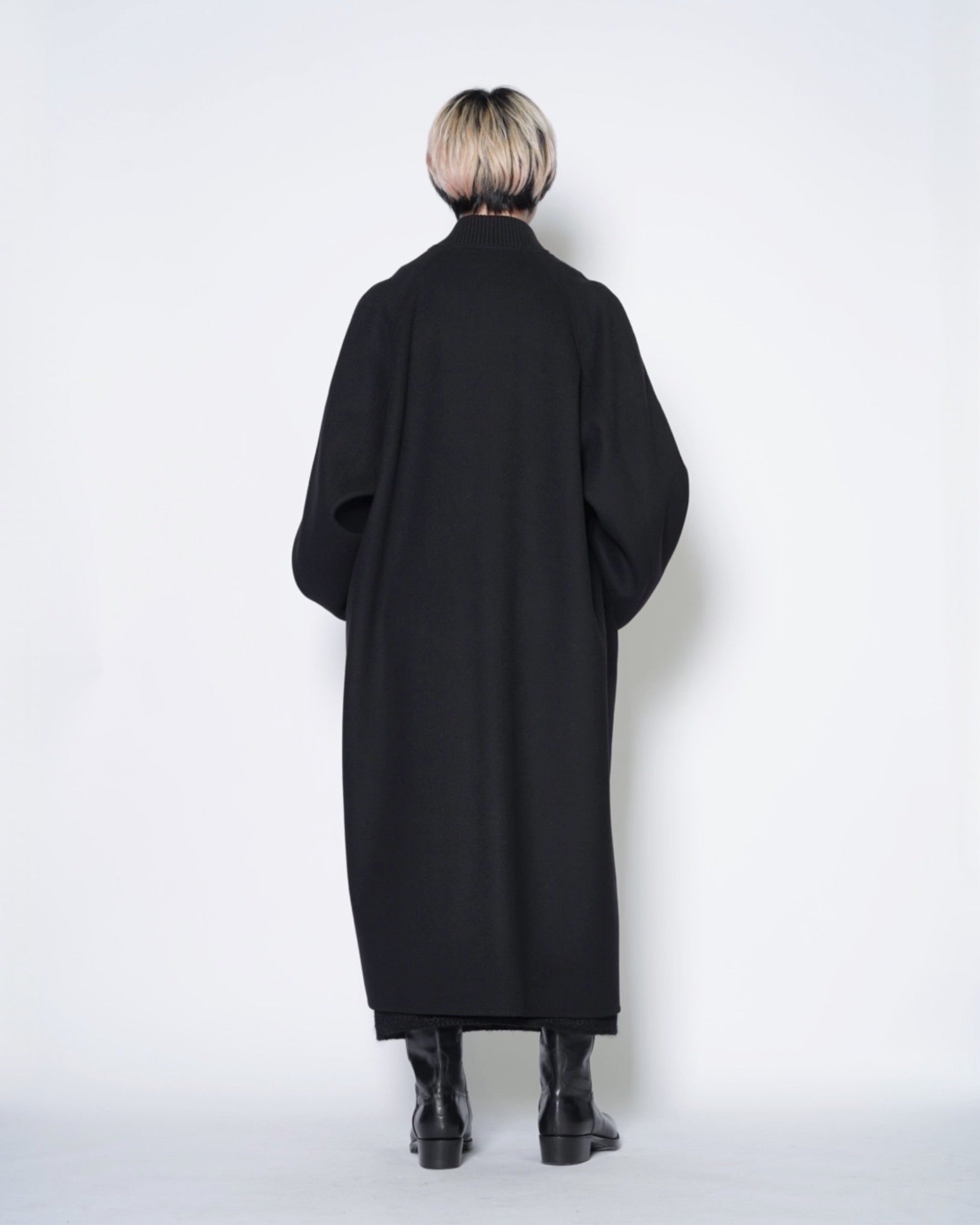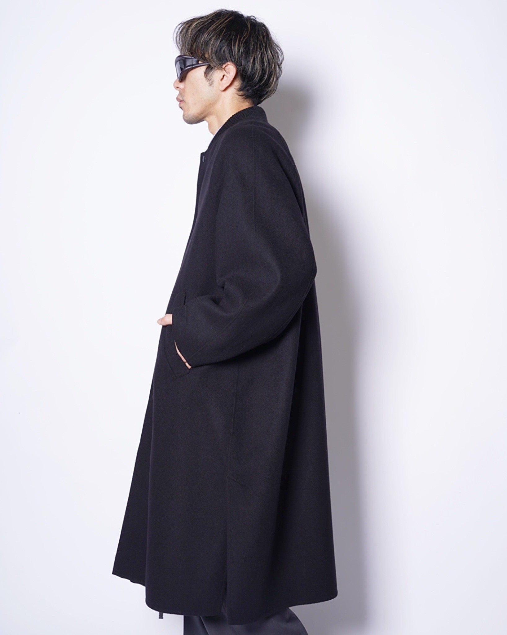 ・スタジアムジャンパーをベースにコートへ展開。職人の手まつりによる“リバー縫製”で仕立て上げ、シームのストレスがなく、軽くてシンプルな作りを追求した。