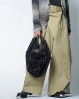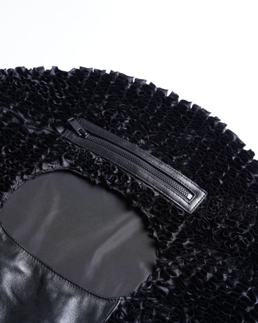 Worm-shaped wool tailored jacket and nylon MA-1 are designed to combine two opposing elements and change naturally around the waist.