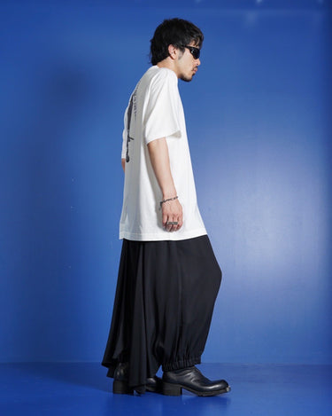 - The unique tapered silhouette with a deep rise is also the key to the design, creating a sophisticated yet chic atmosphere typical of Yohji Yamamoto.