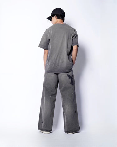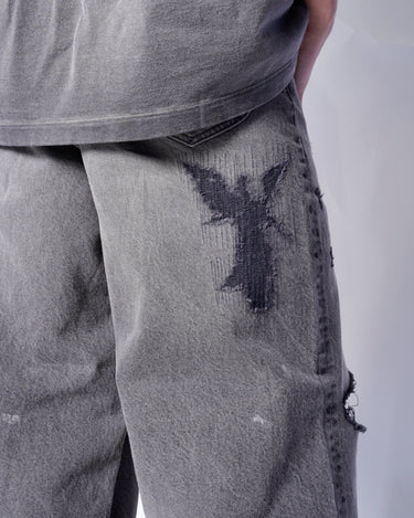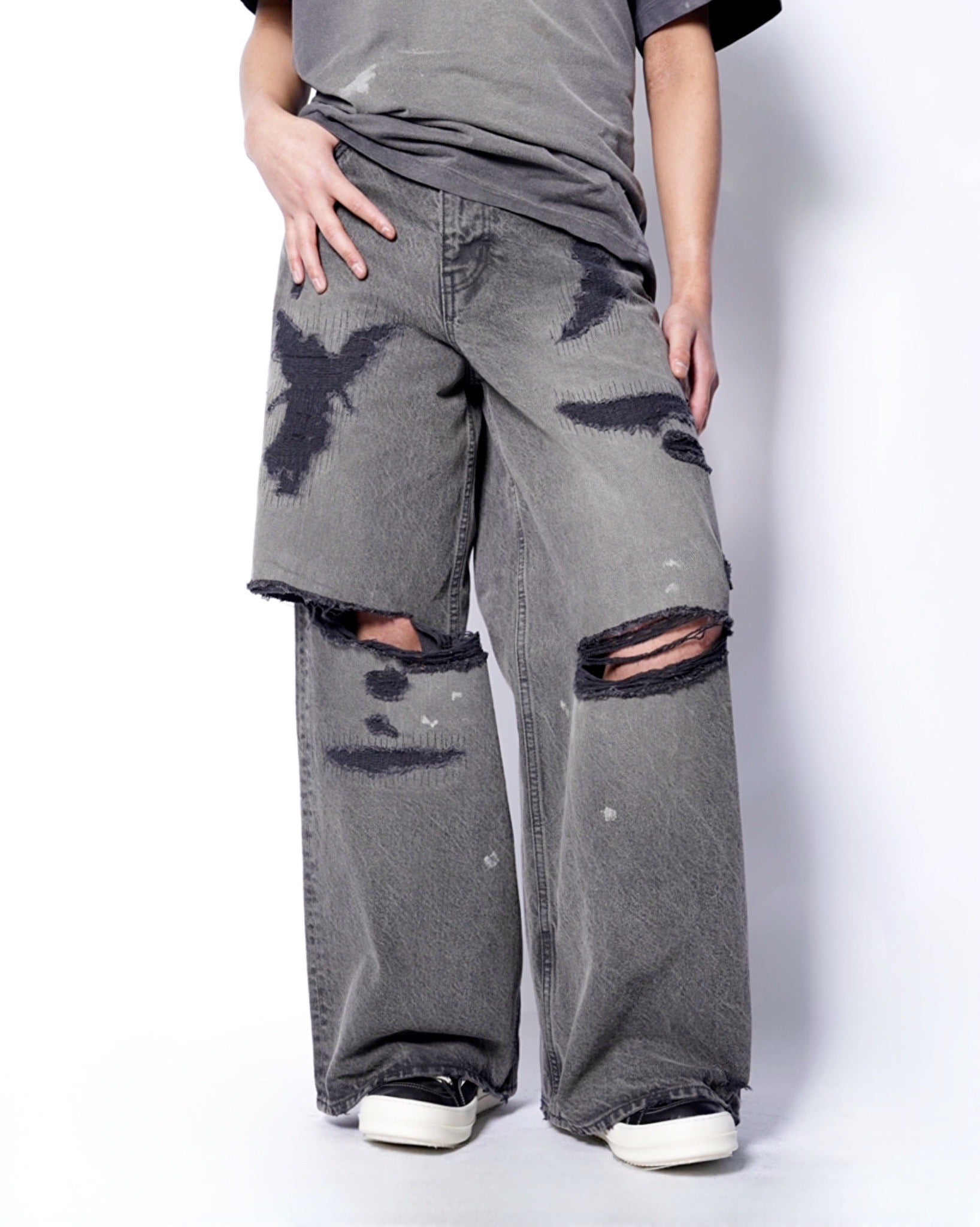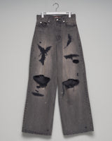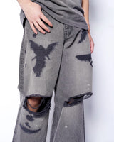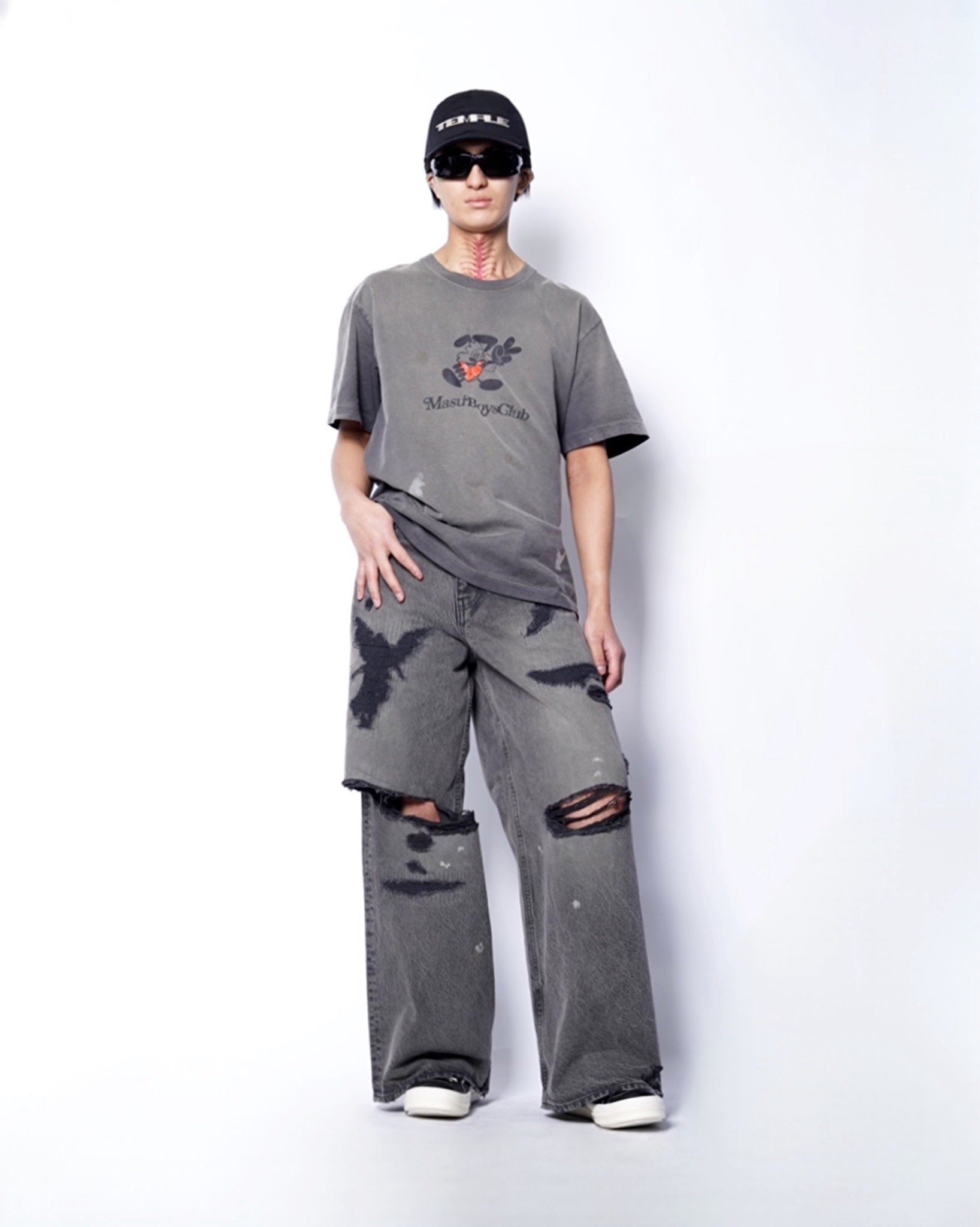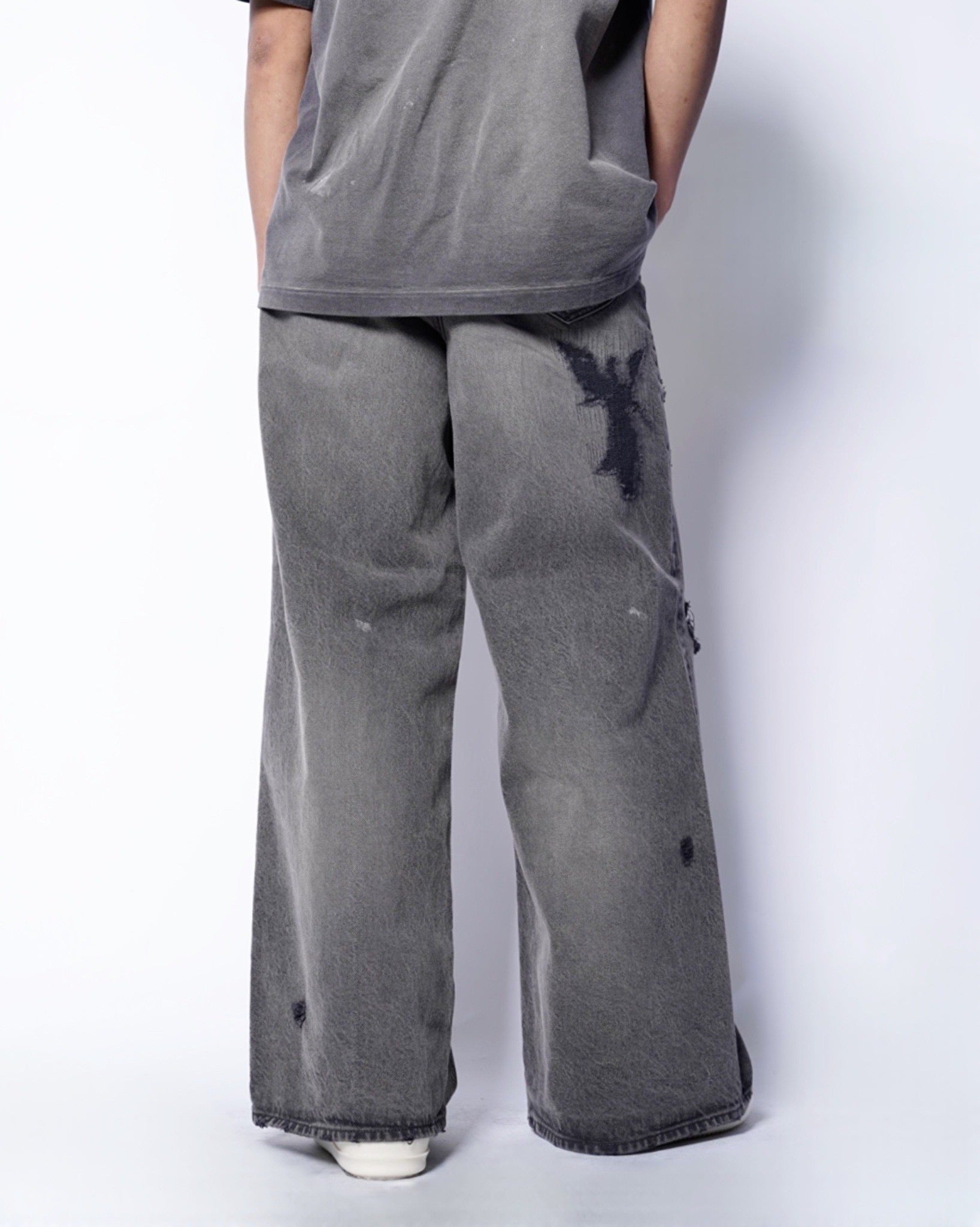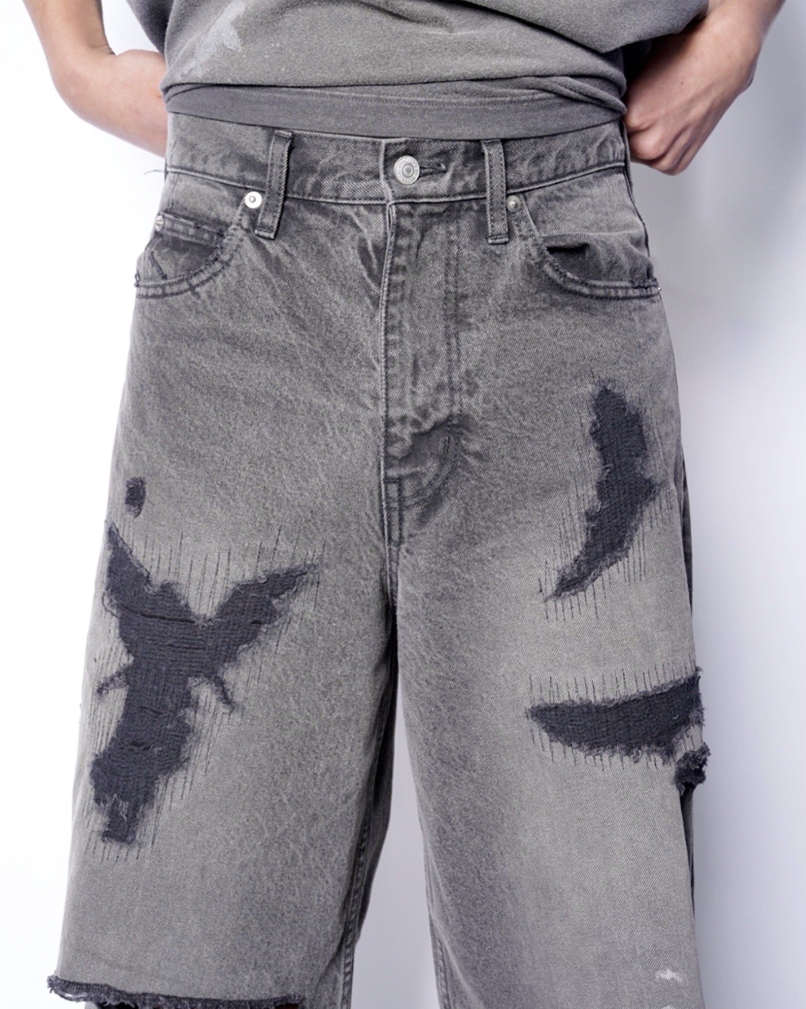 右身頃には天使、左身頃には羽のシルエットを象ったダメージを美しさに変える、遊び心のあるアイロニー。