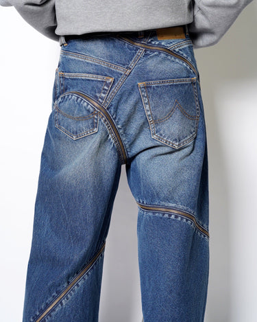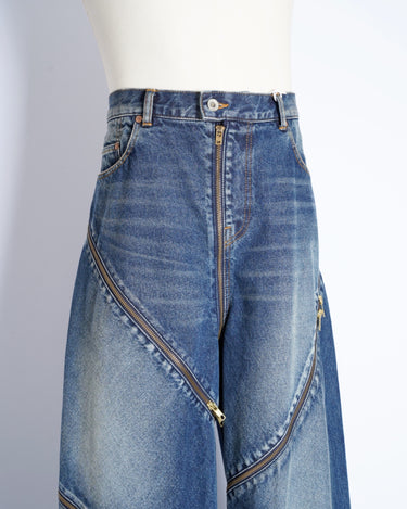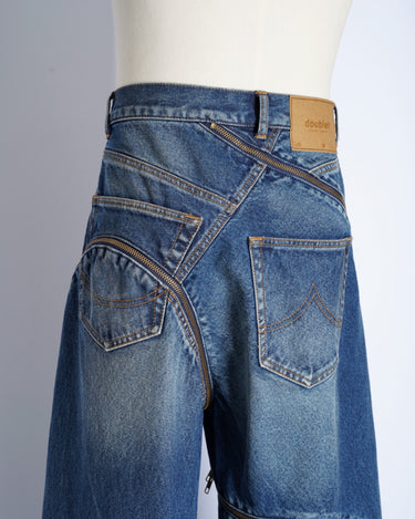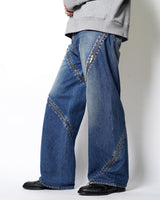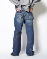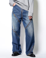 ・魚の“開き”をベースに、Synfluxの技術で設計された平面パターンを複数のデニムパーツで構成。