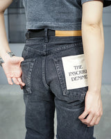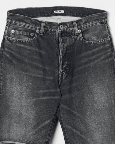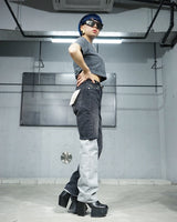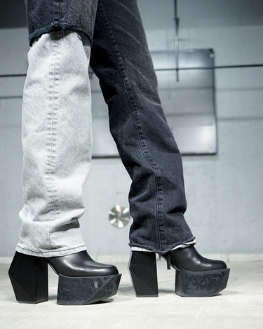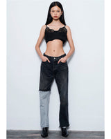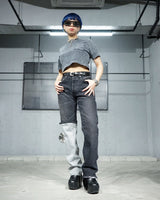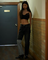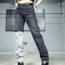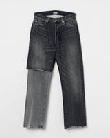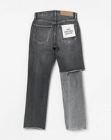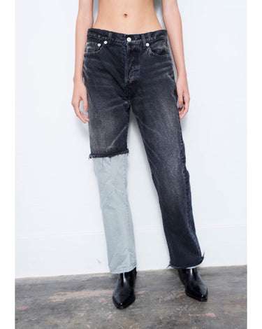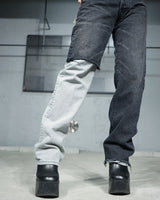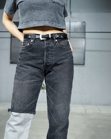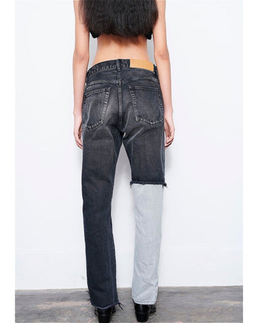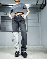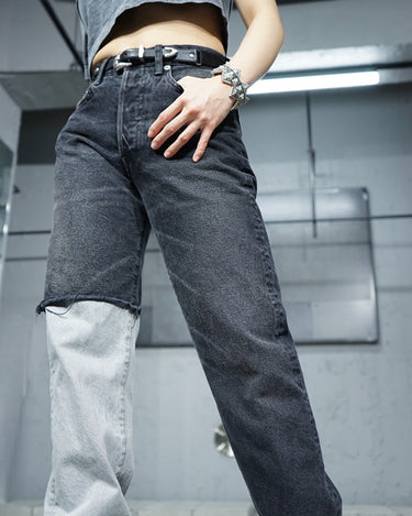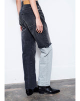 -A design with a strong presence with grayish denim on one leg based on chic black denim.