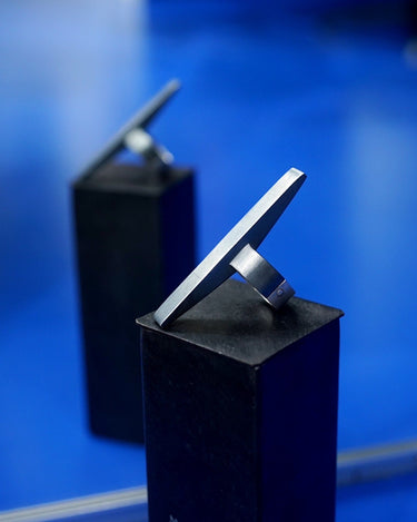 ・ A ring with a linear and edged top bar with a symbolic and heavy object.