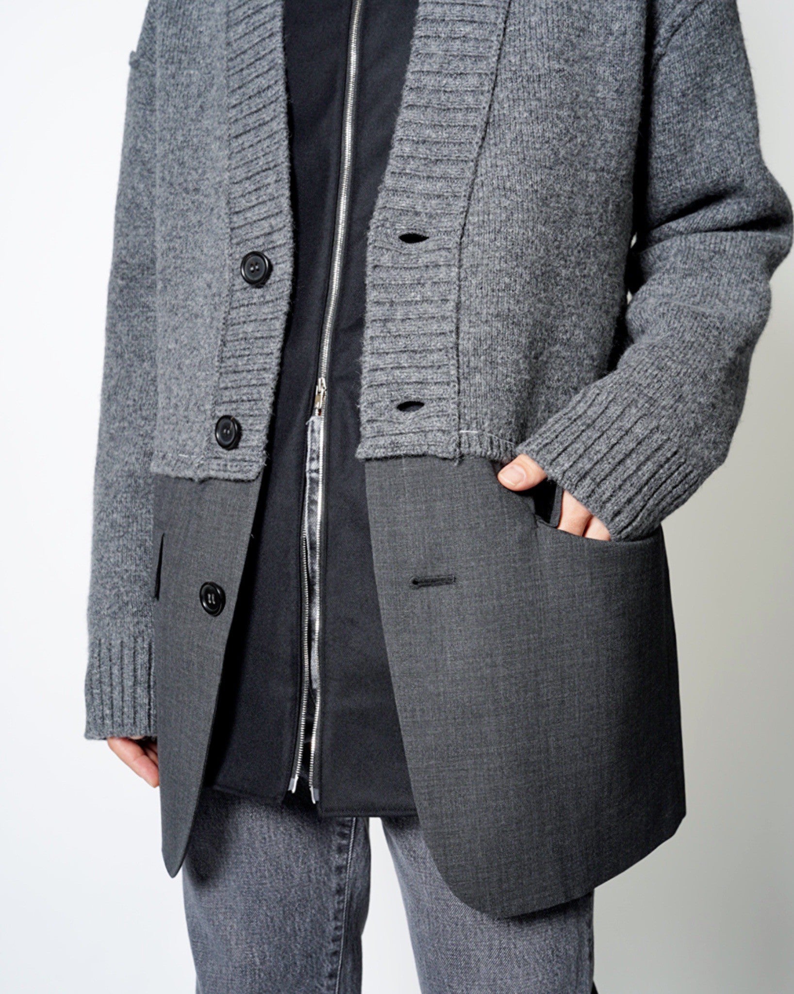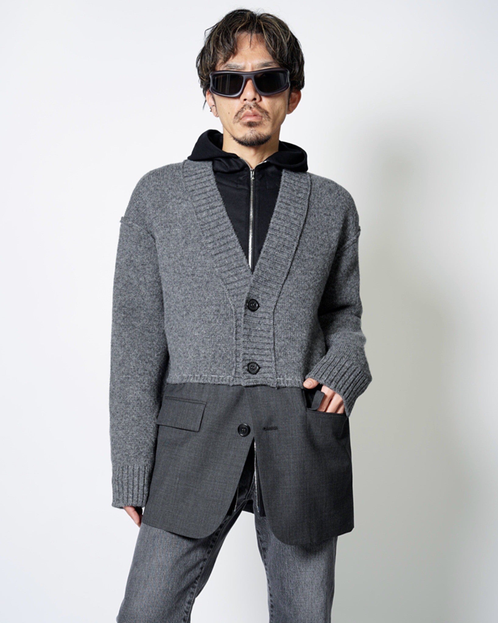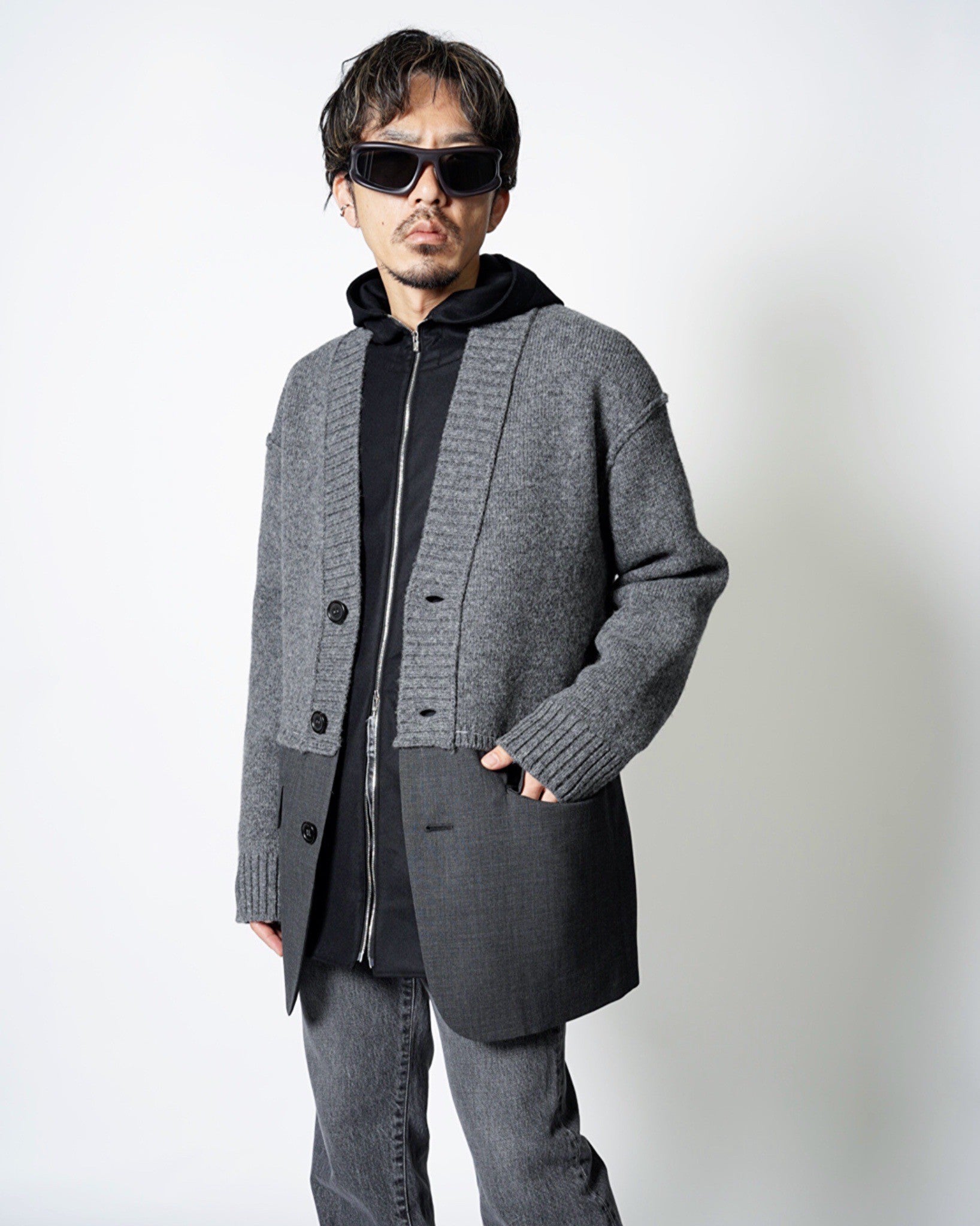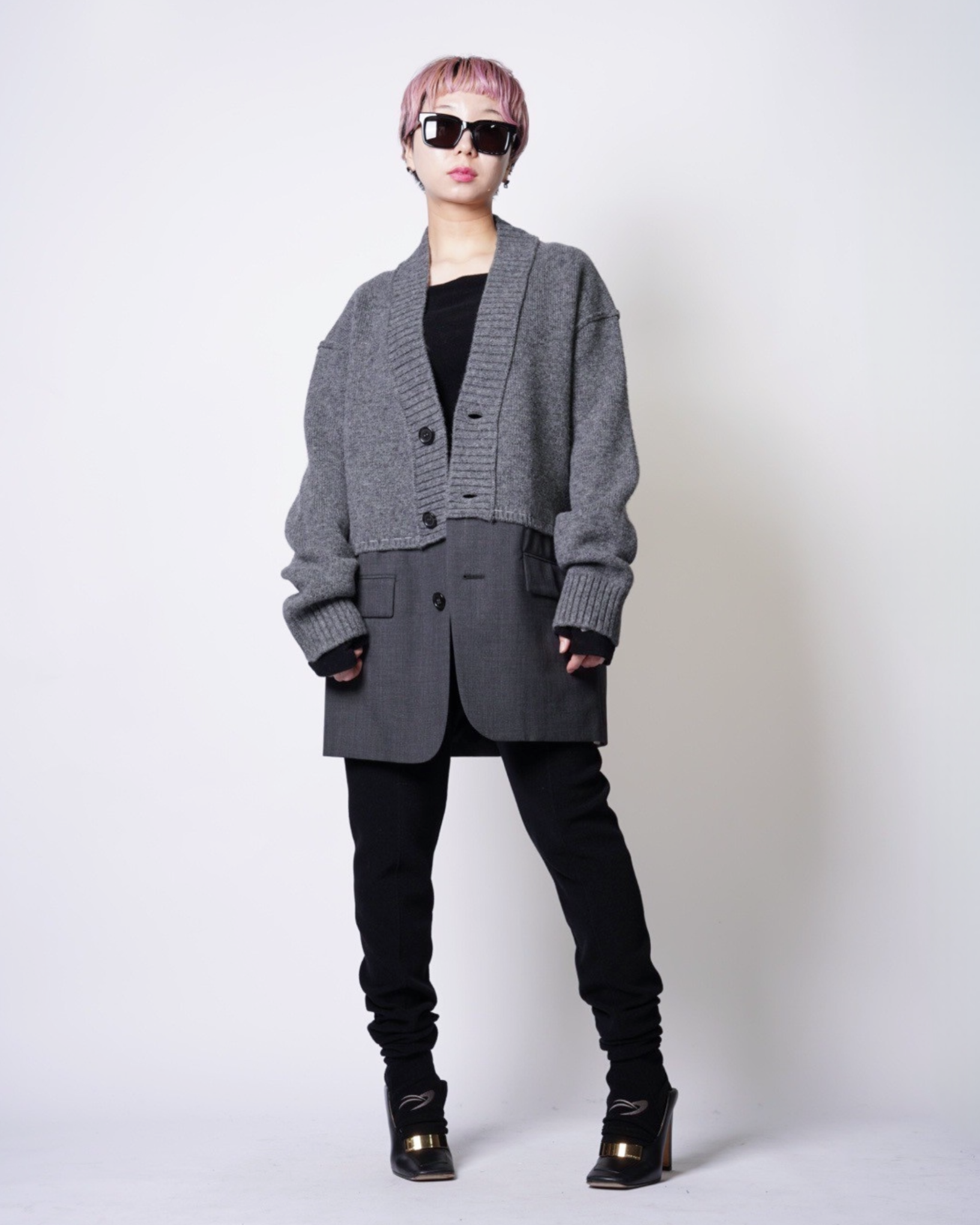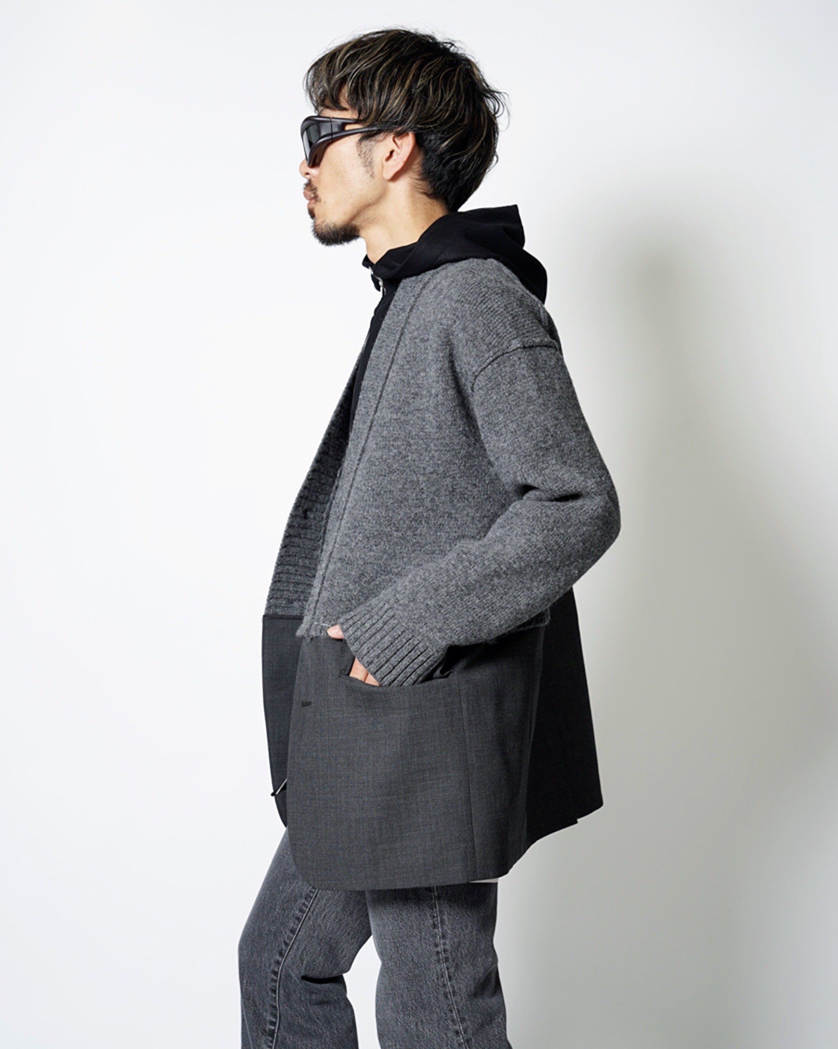 ・カーディガンとジャケットをレイヤードしたデザインは、硬さもありながら気軽さもあるユニークなアイテム。