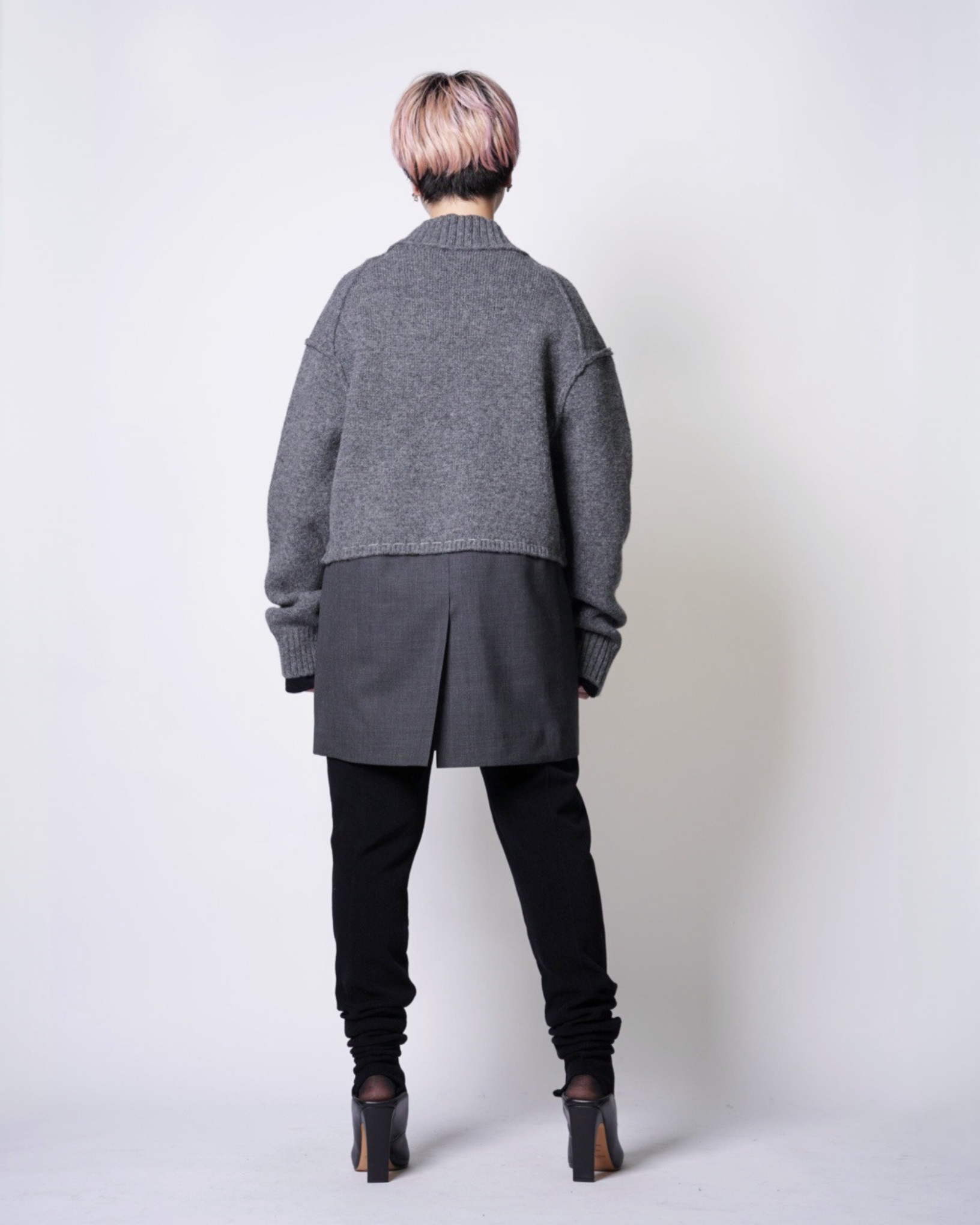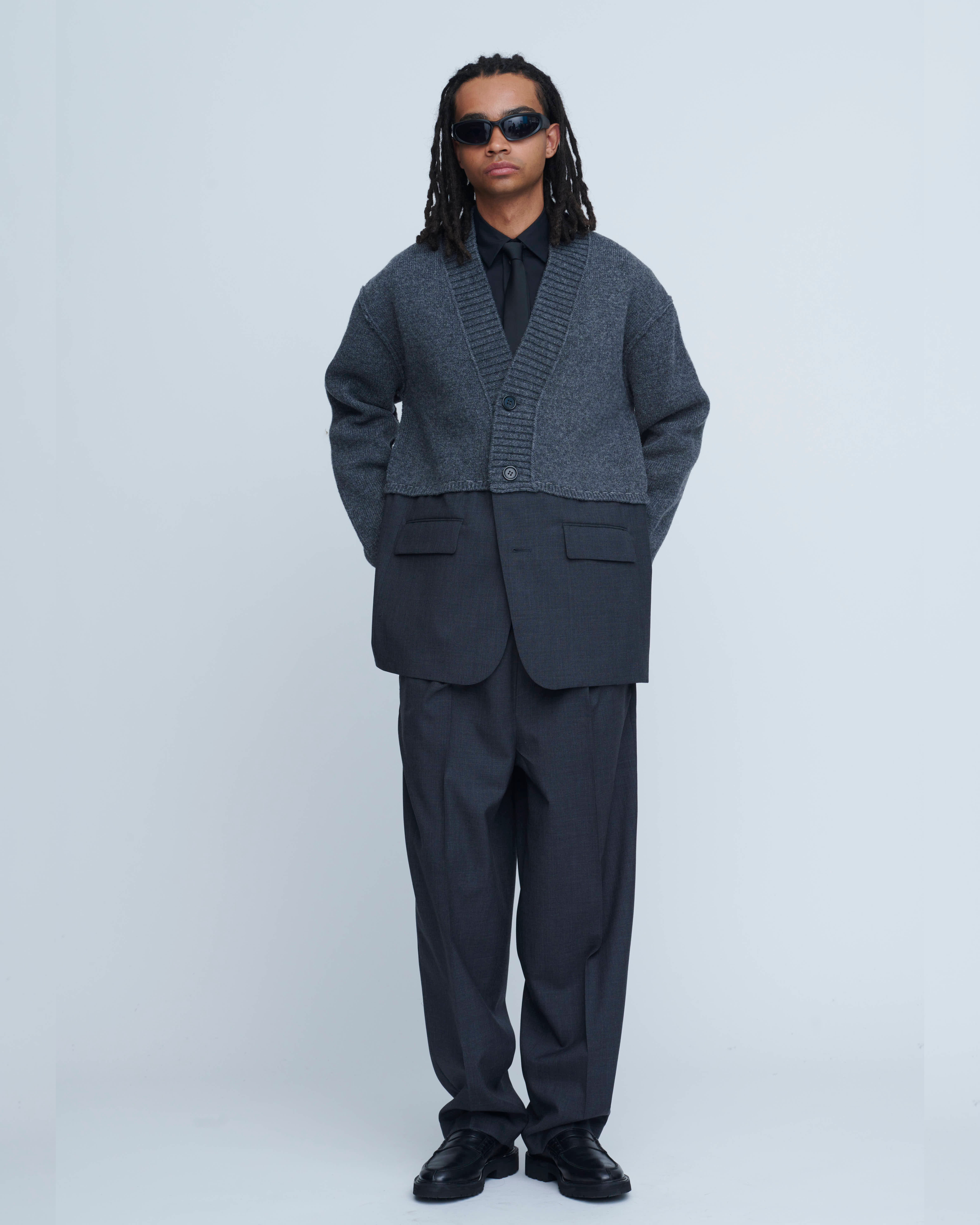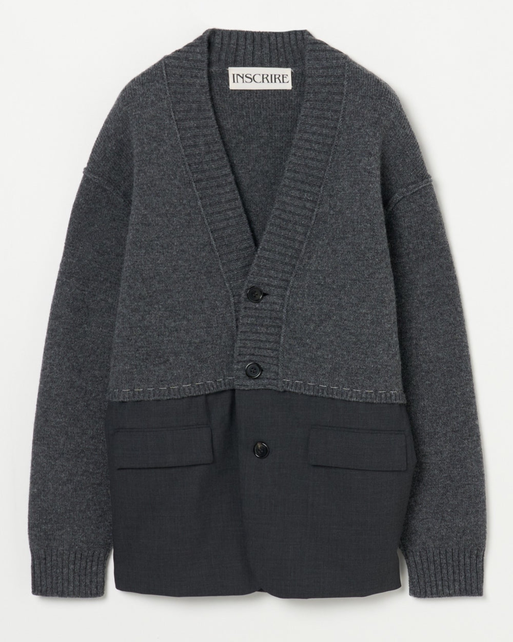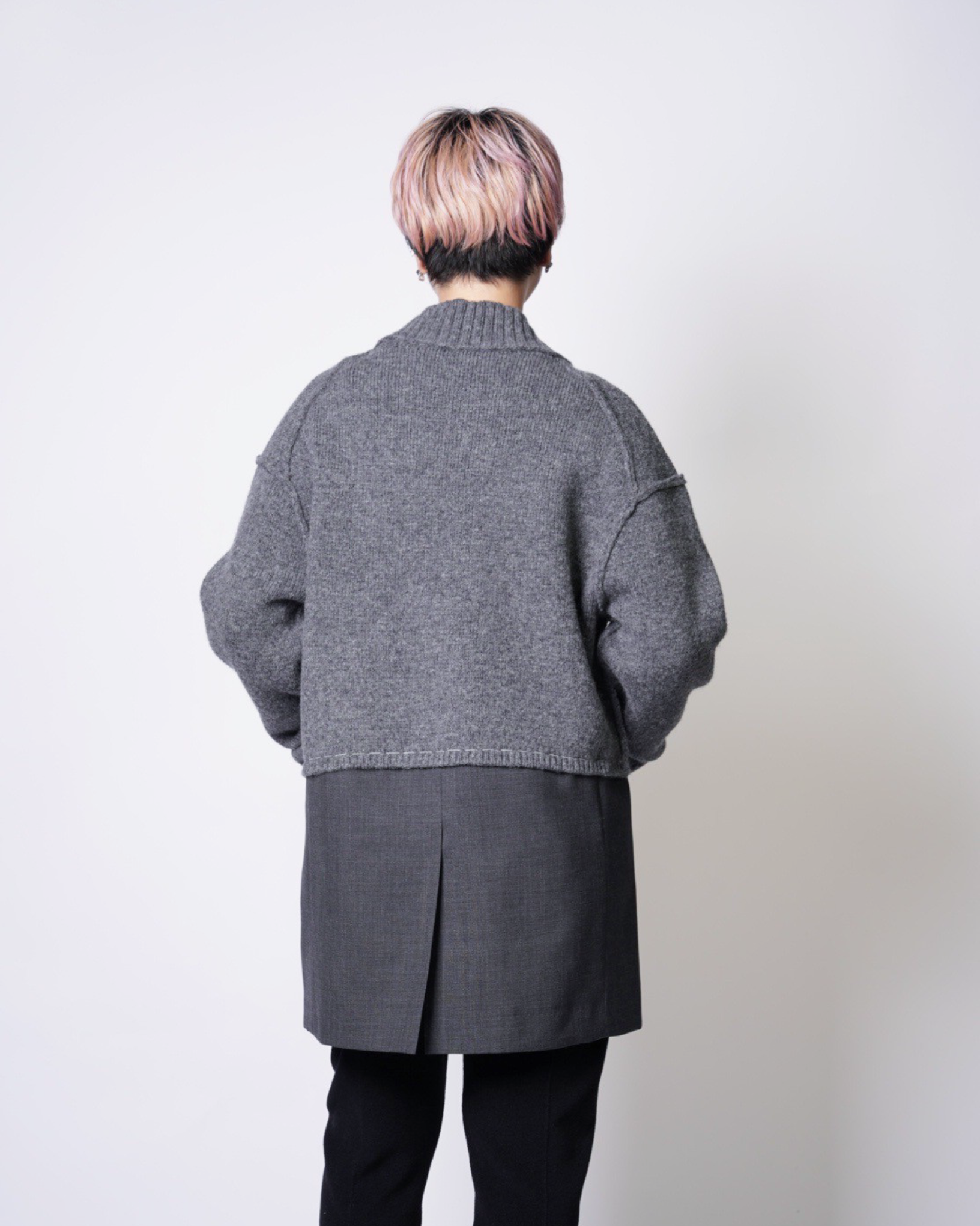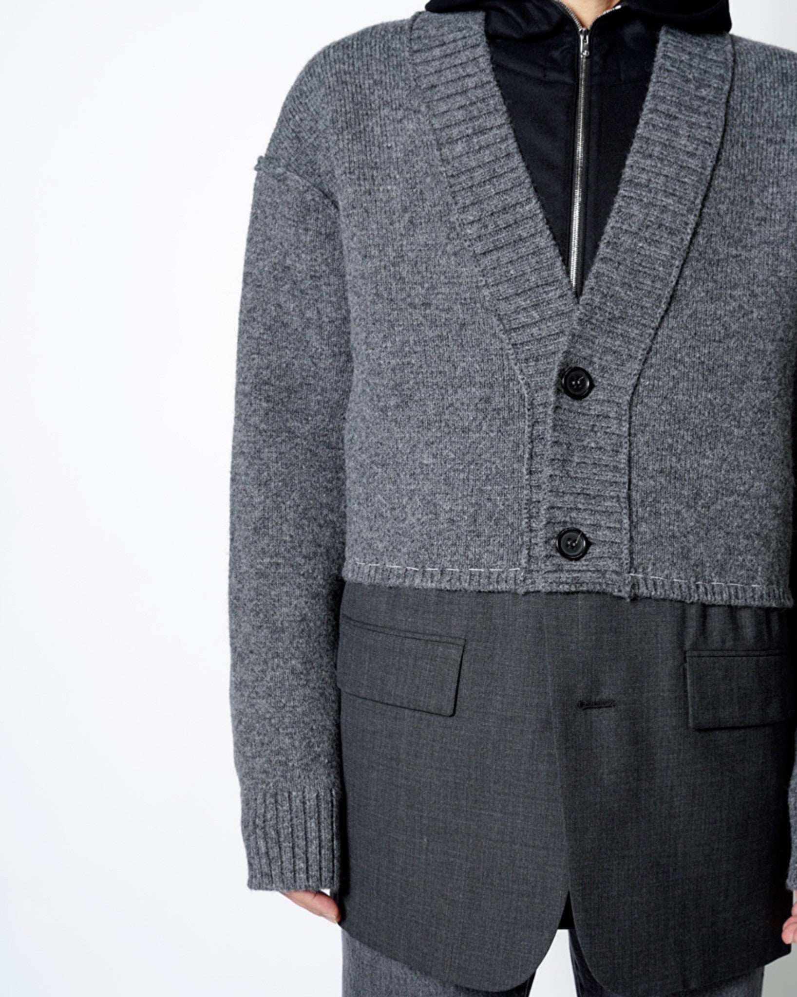 ・カーディガンとジャケットをレイヤードしたデザインは、硬さもありながら気軽さもあるユニークなアイテム。