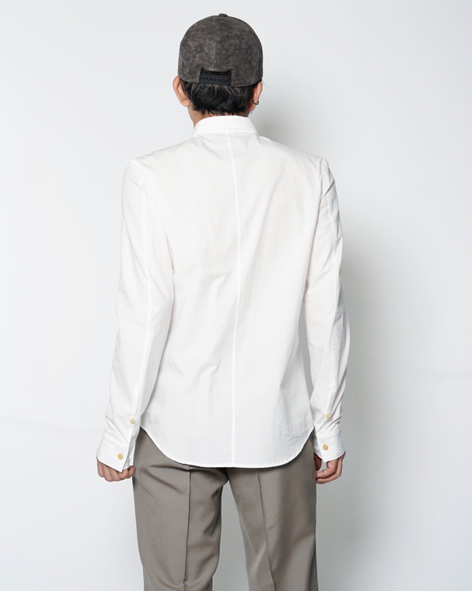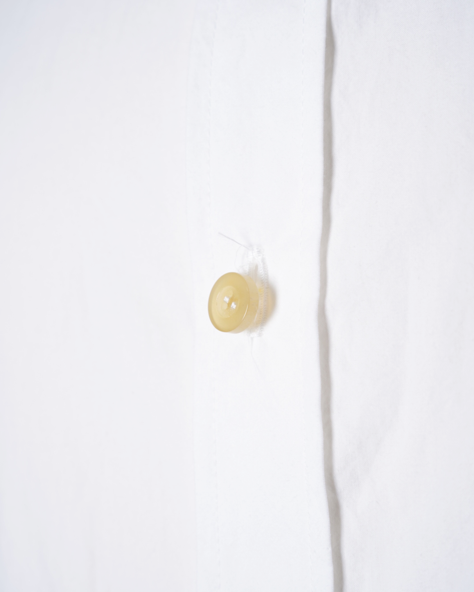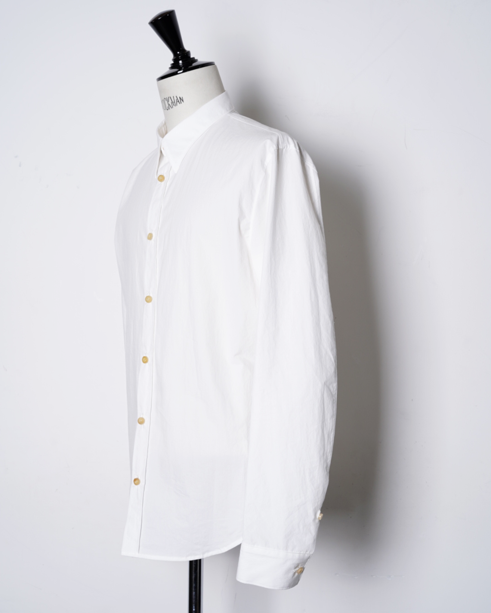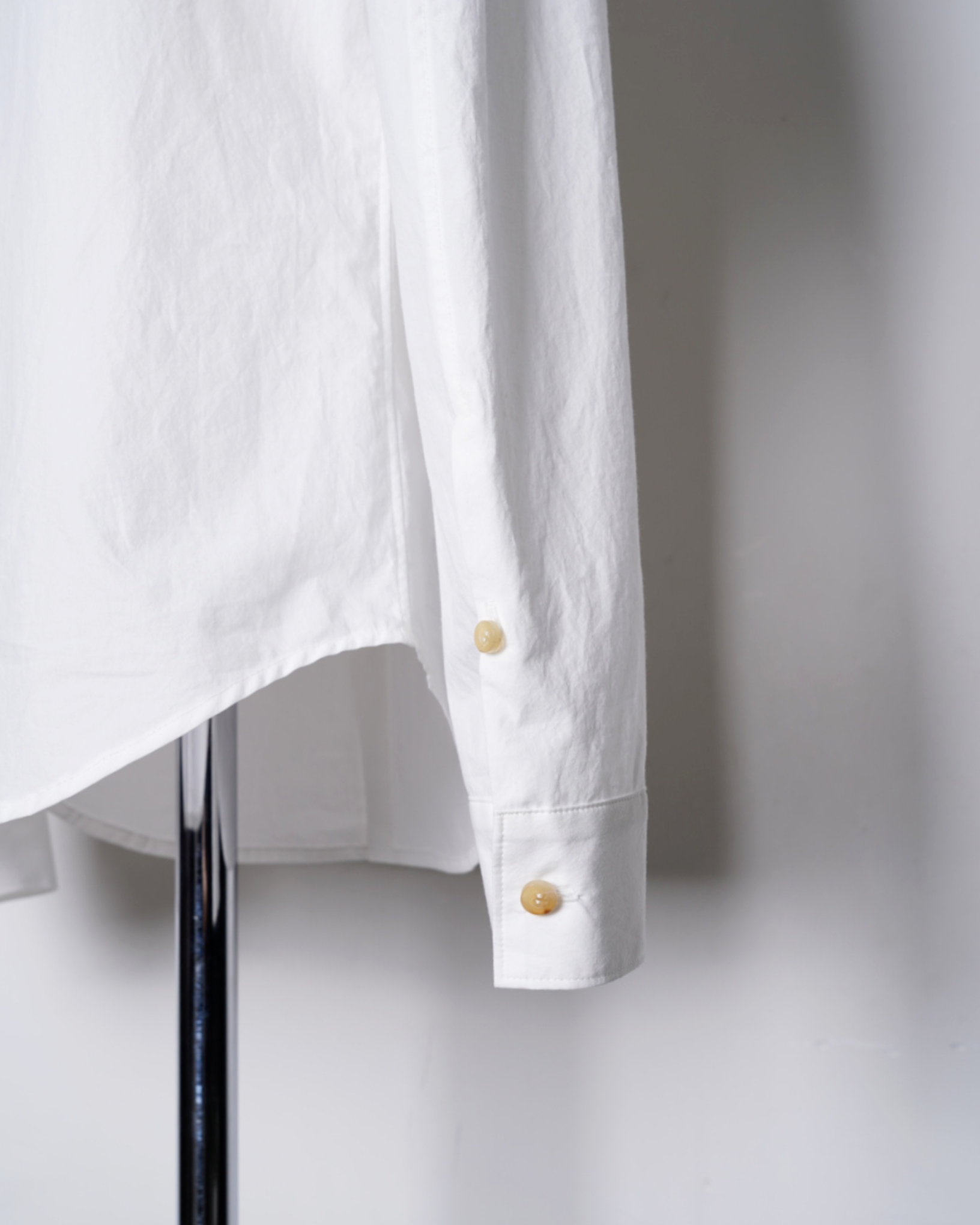 ・厚みのある水牛ボタンを使用しており、クリーンな印象のシャツに力強さを感じるアクセントを与えています。