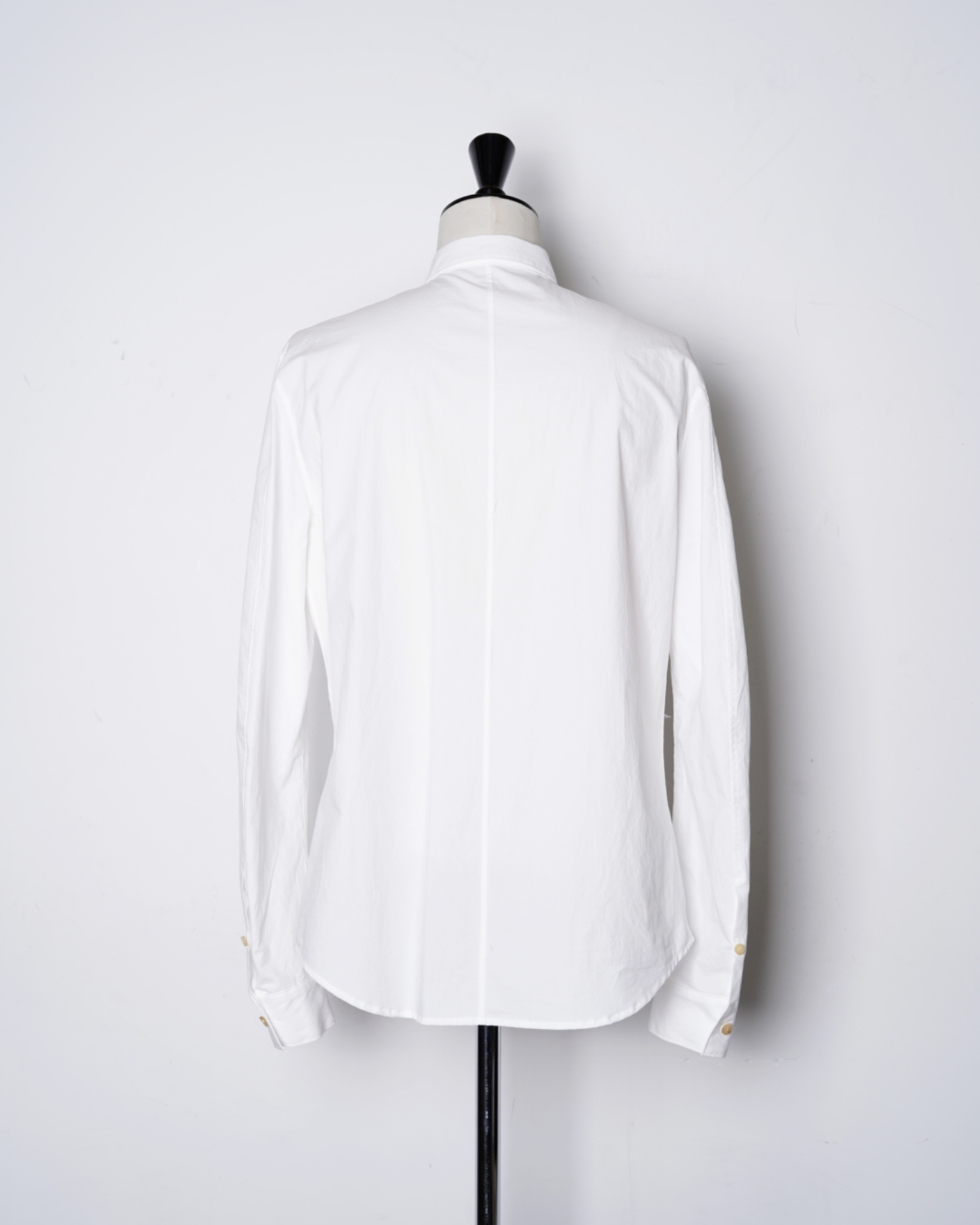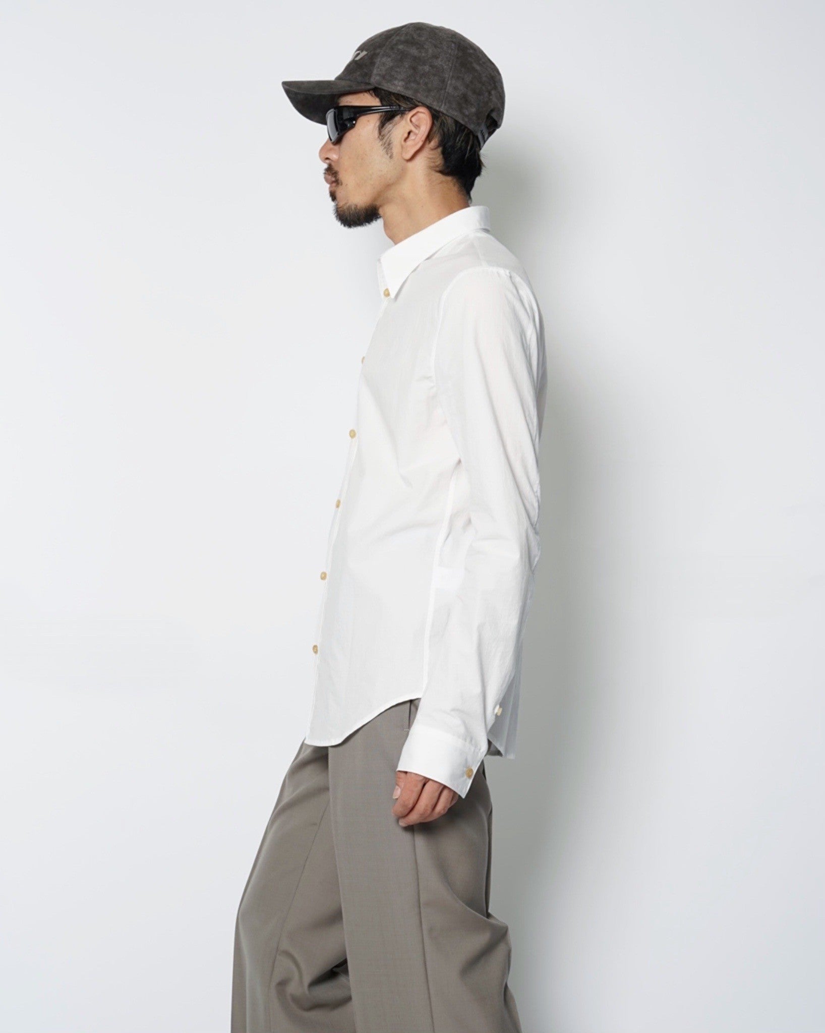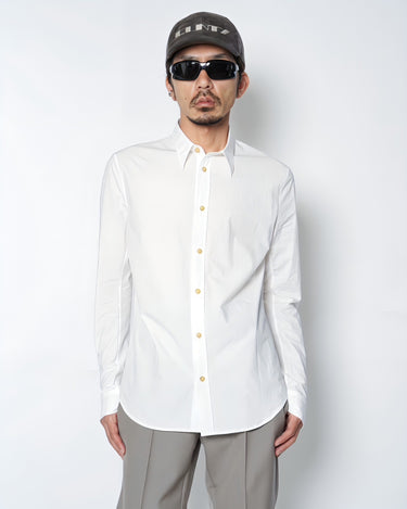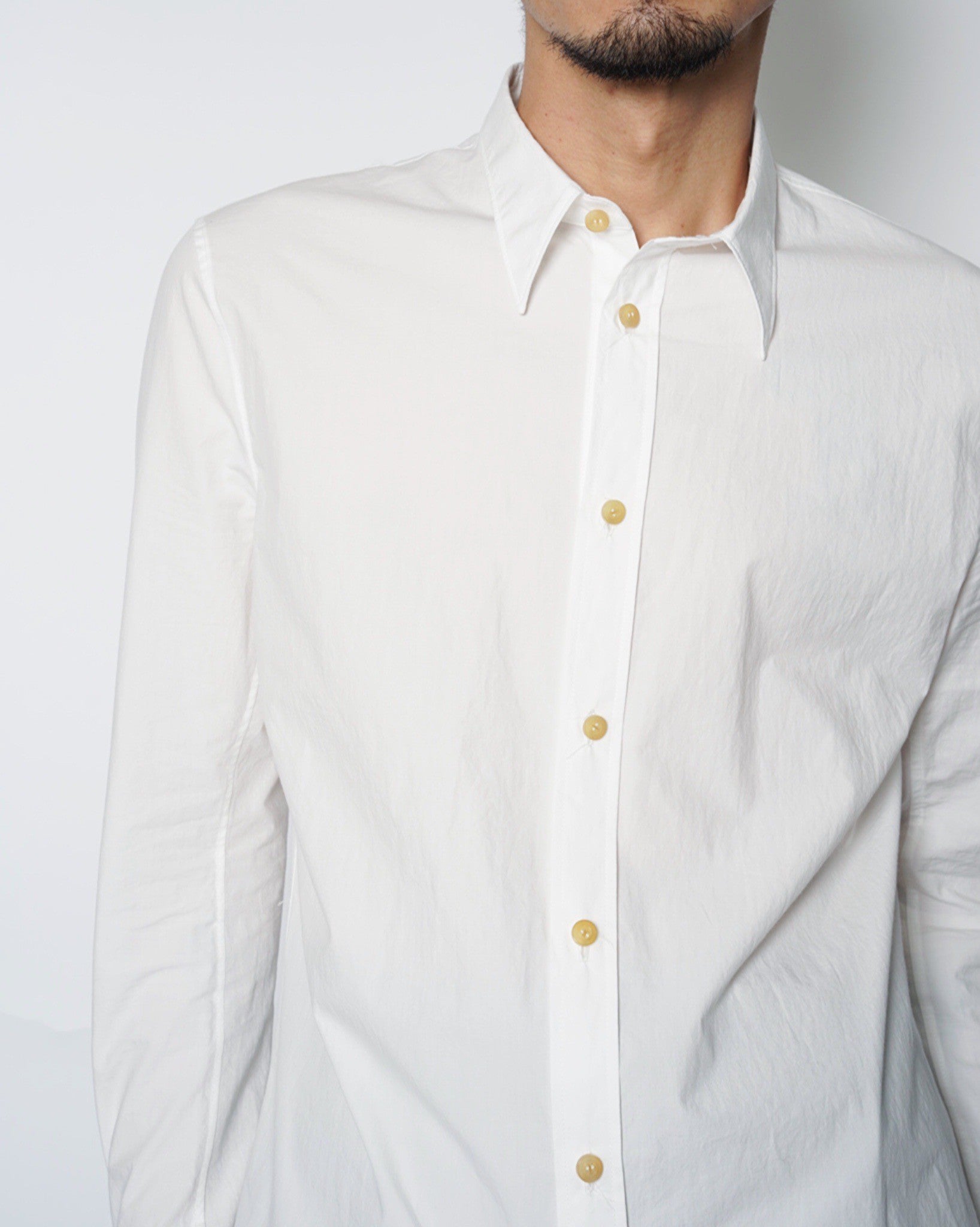・厚みのある水牛ボタンを使用しており、クリーンな印象のシャツに力強さを感じるアクセントを与えています。