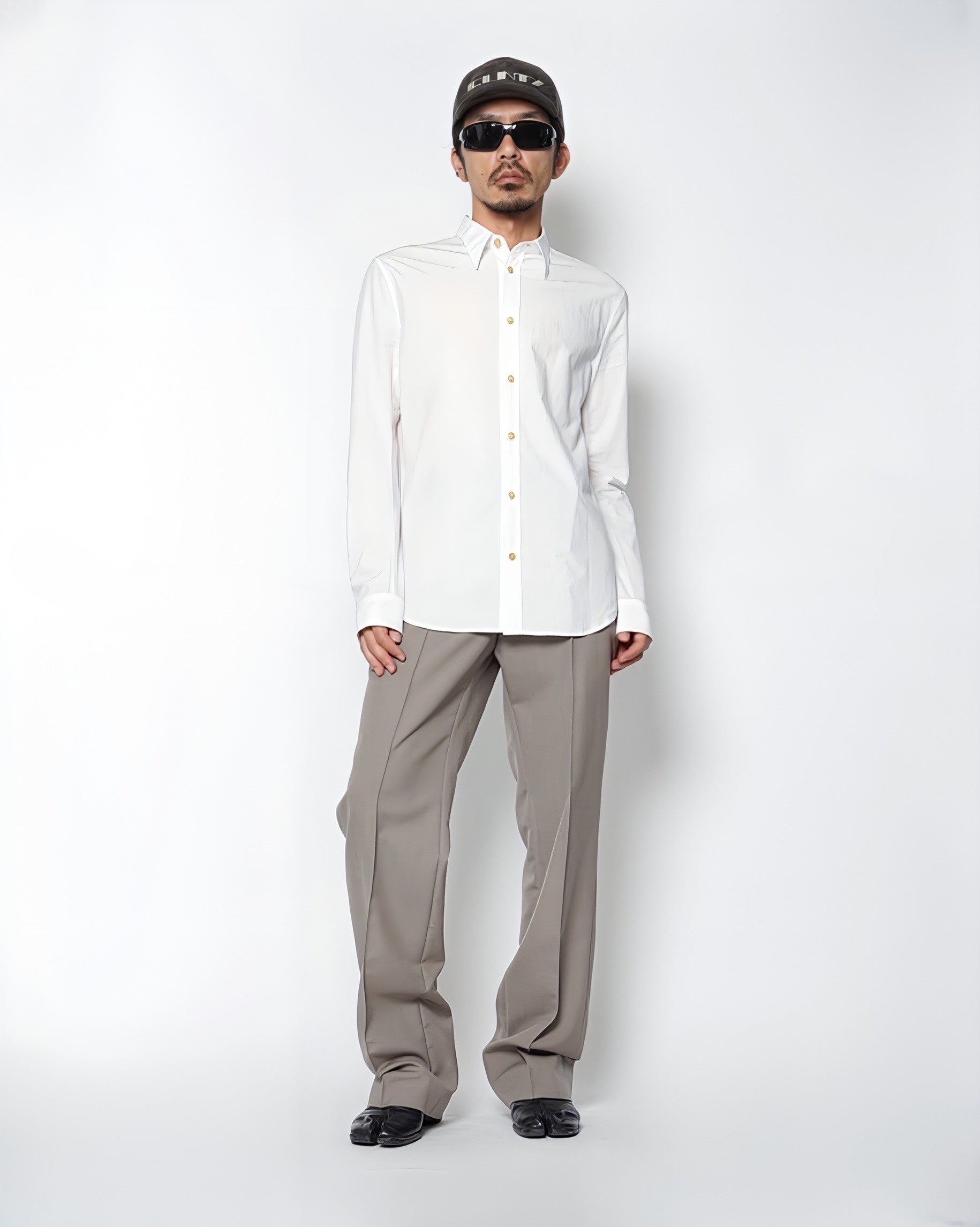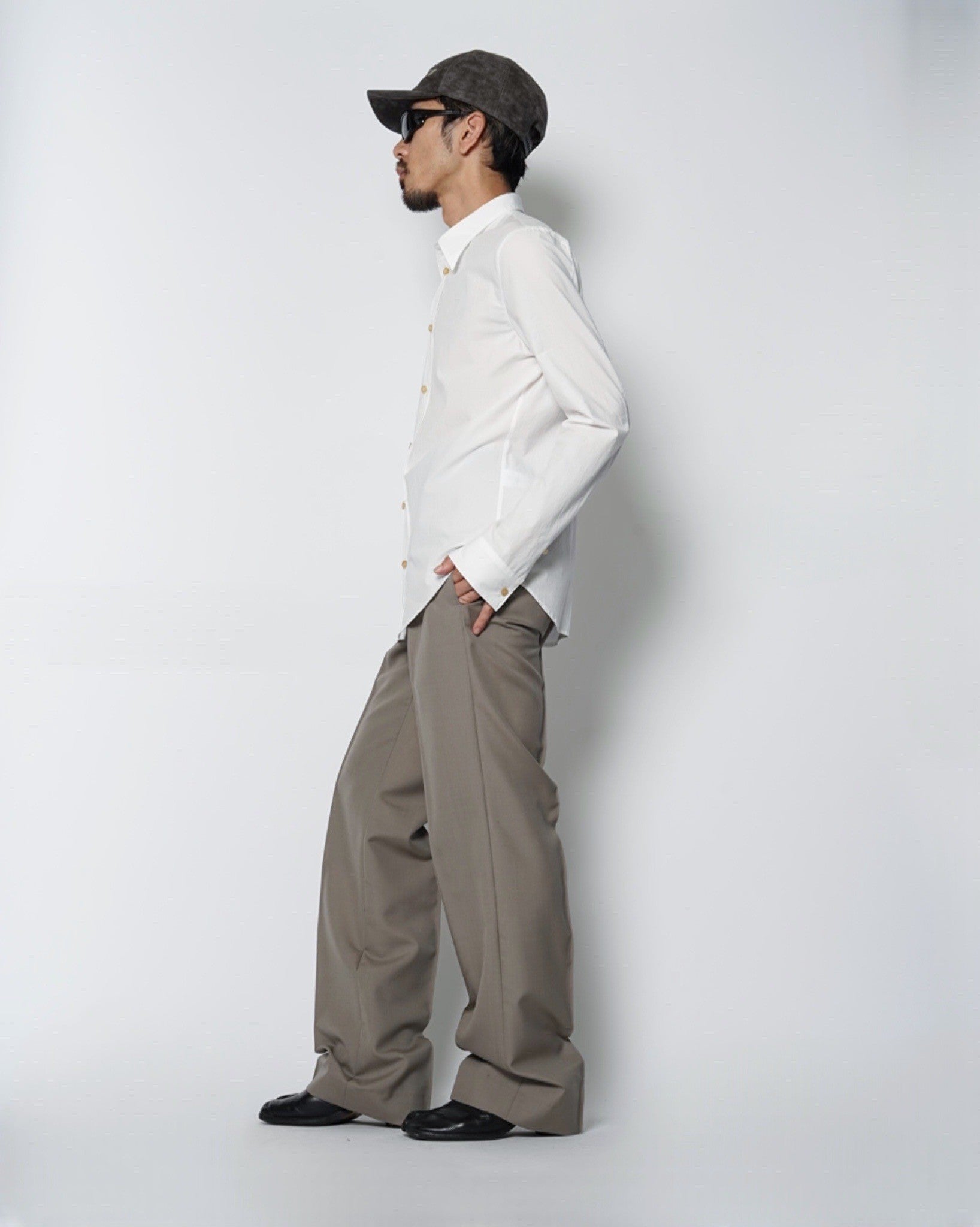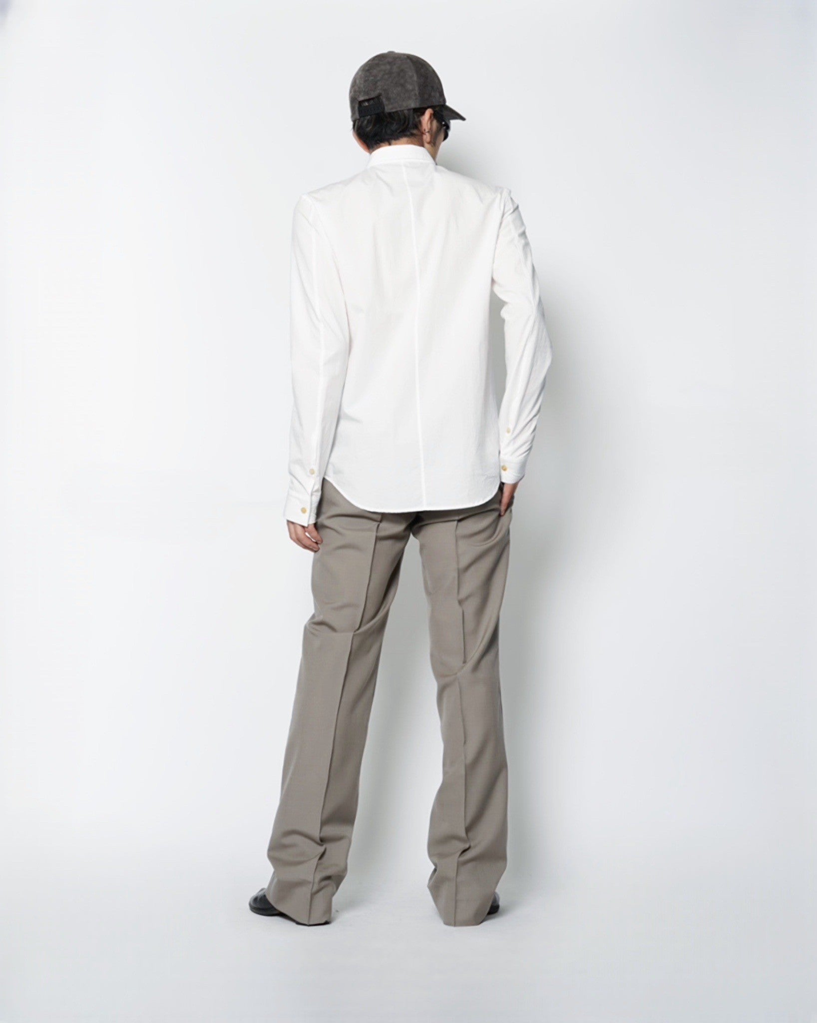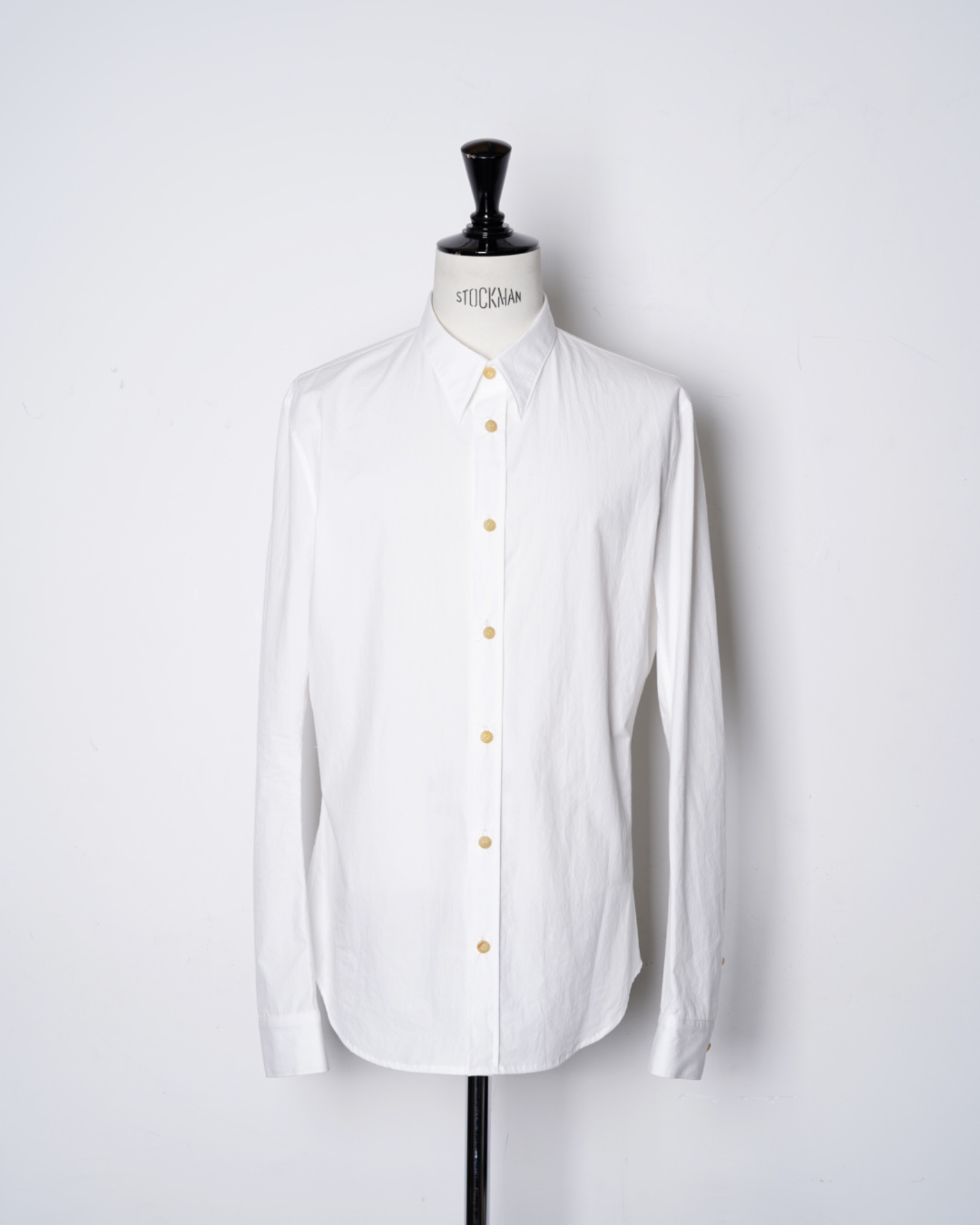 ・厚みのある水牛ボタンを使用しており、クリーンな印象のシャツに力強さを感じるアクセントを与えています。