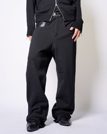 ・5ポケットパンツの形をベースに、スウェットとレザーのコンビネーションで作り上げたデザイン。