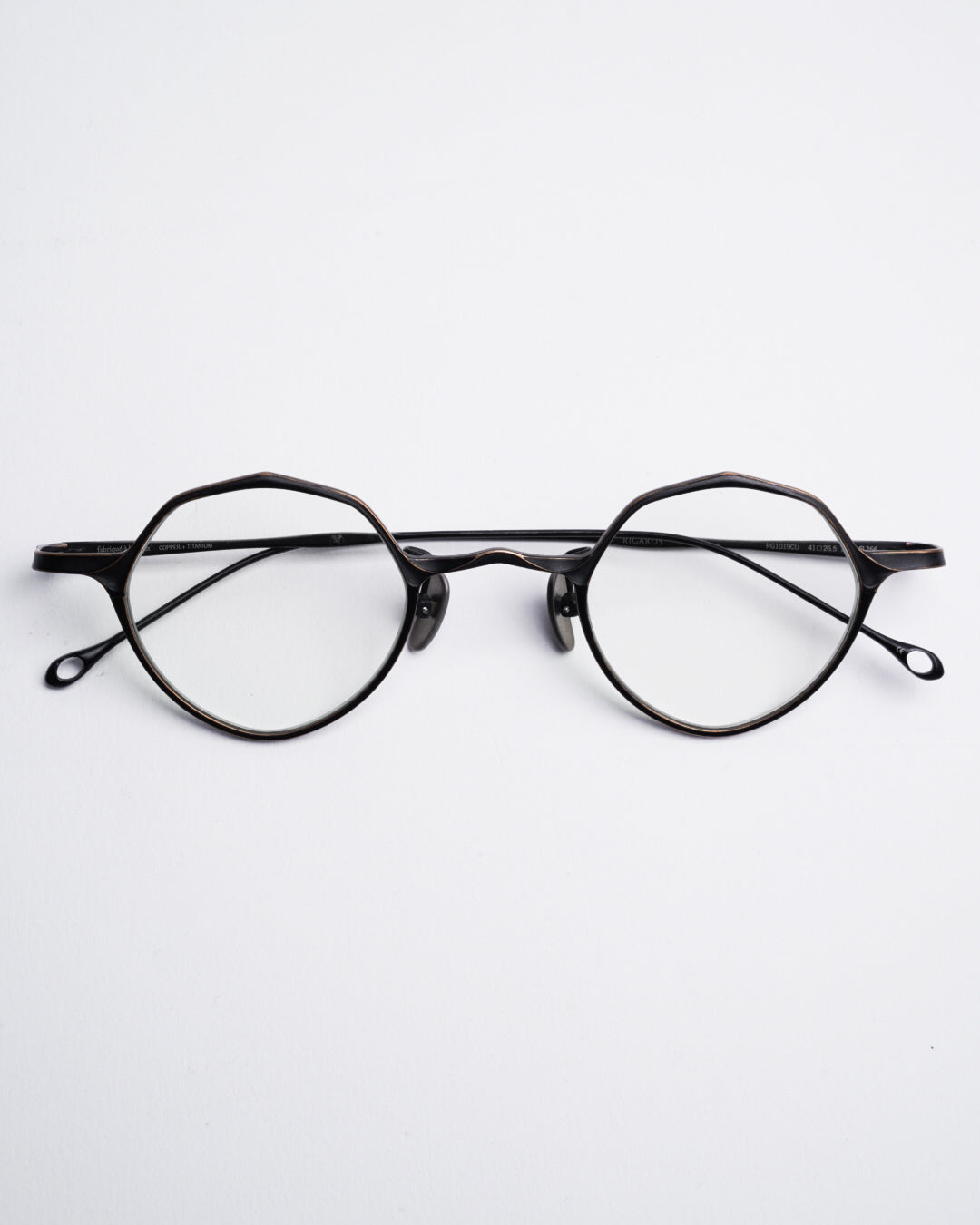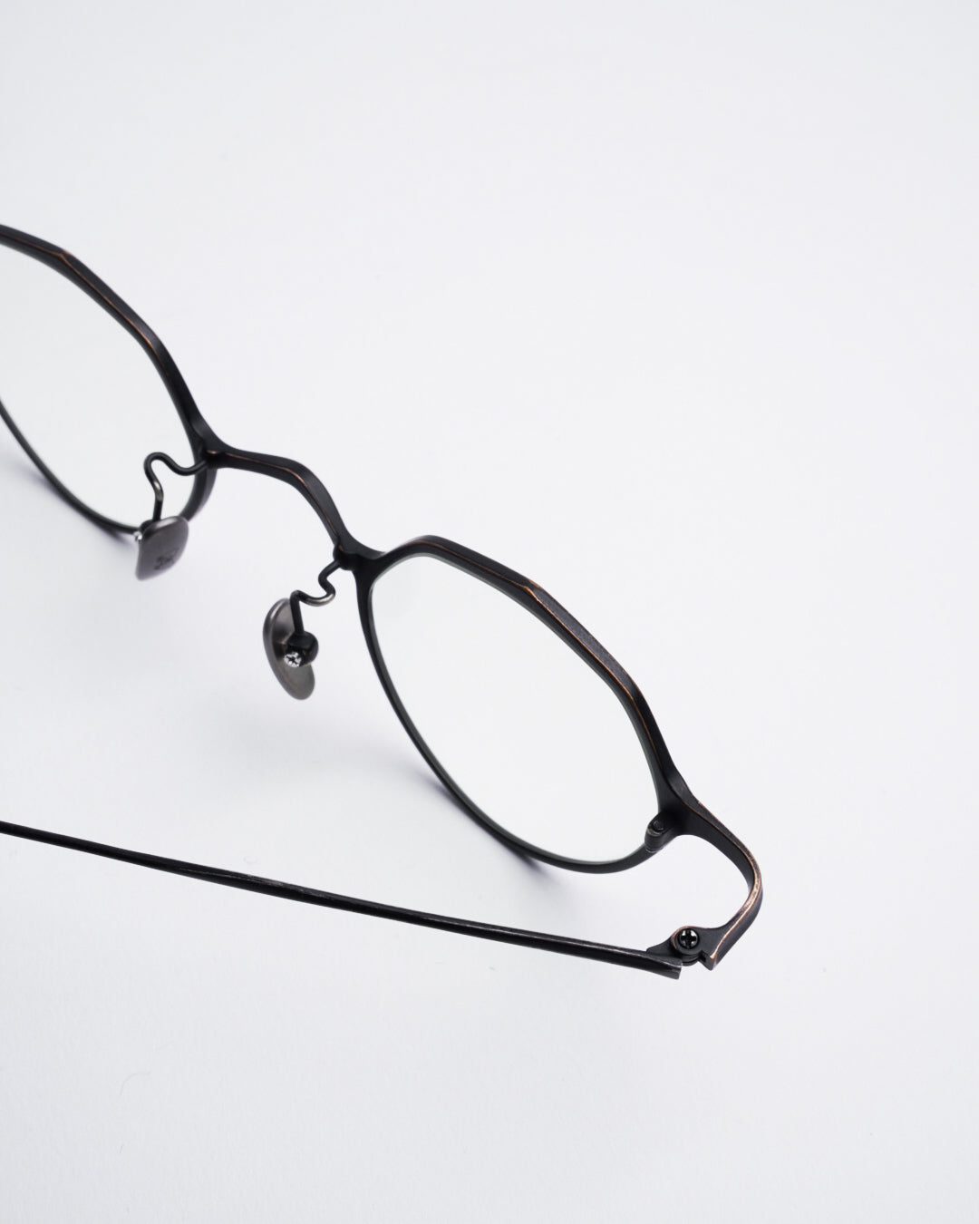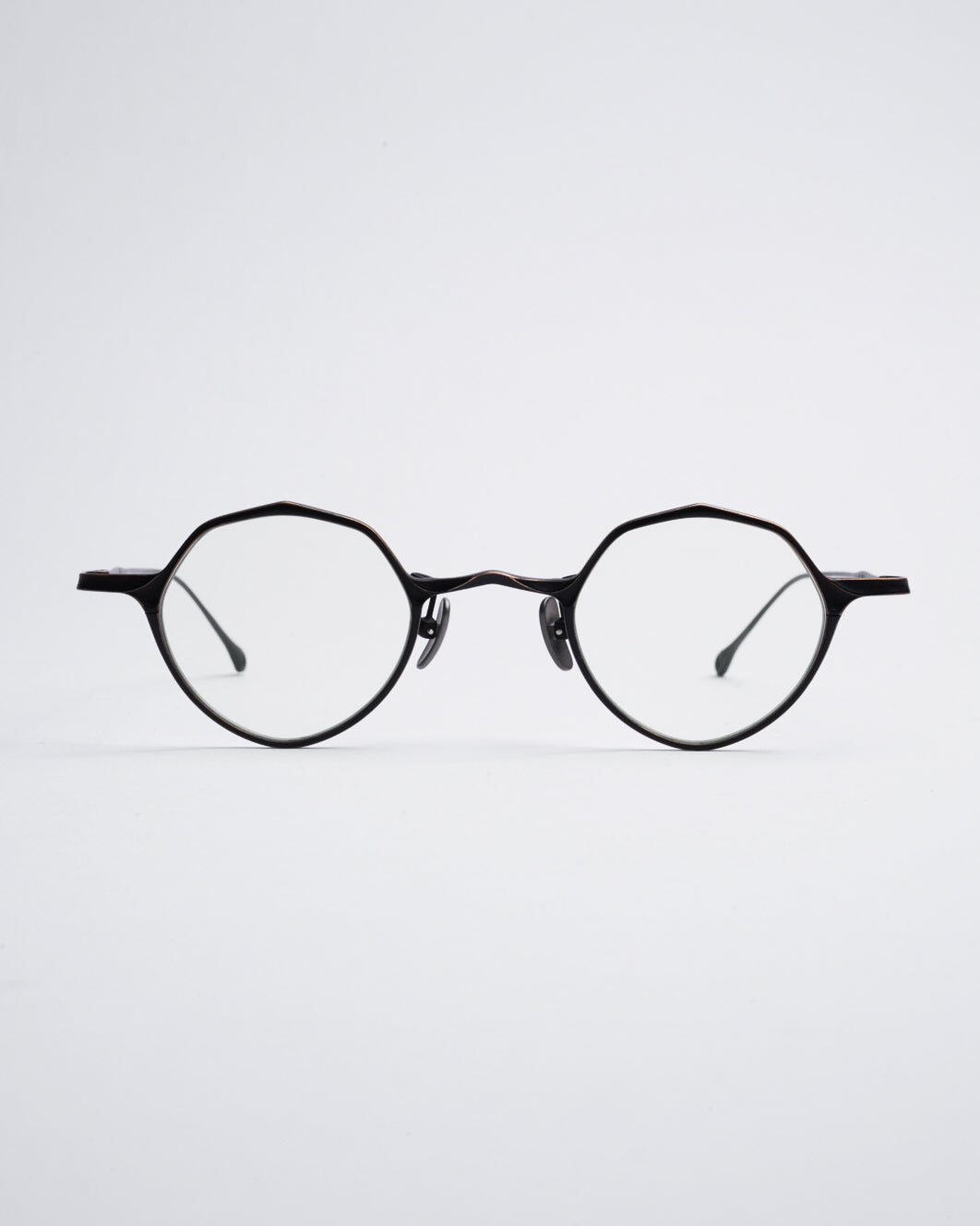 表面加工を施し、立体的でエッジの効いたカッティングのフレームとなっており、重厚的でアーティザナルな印象に。