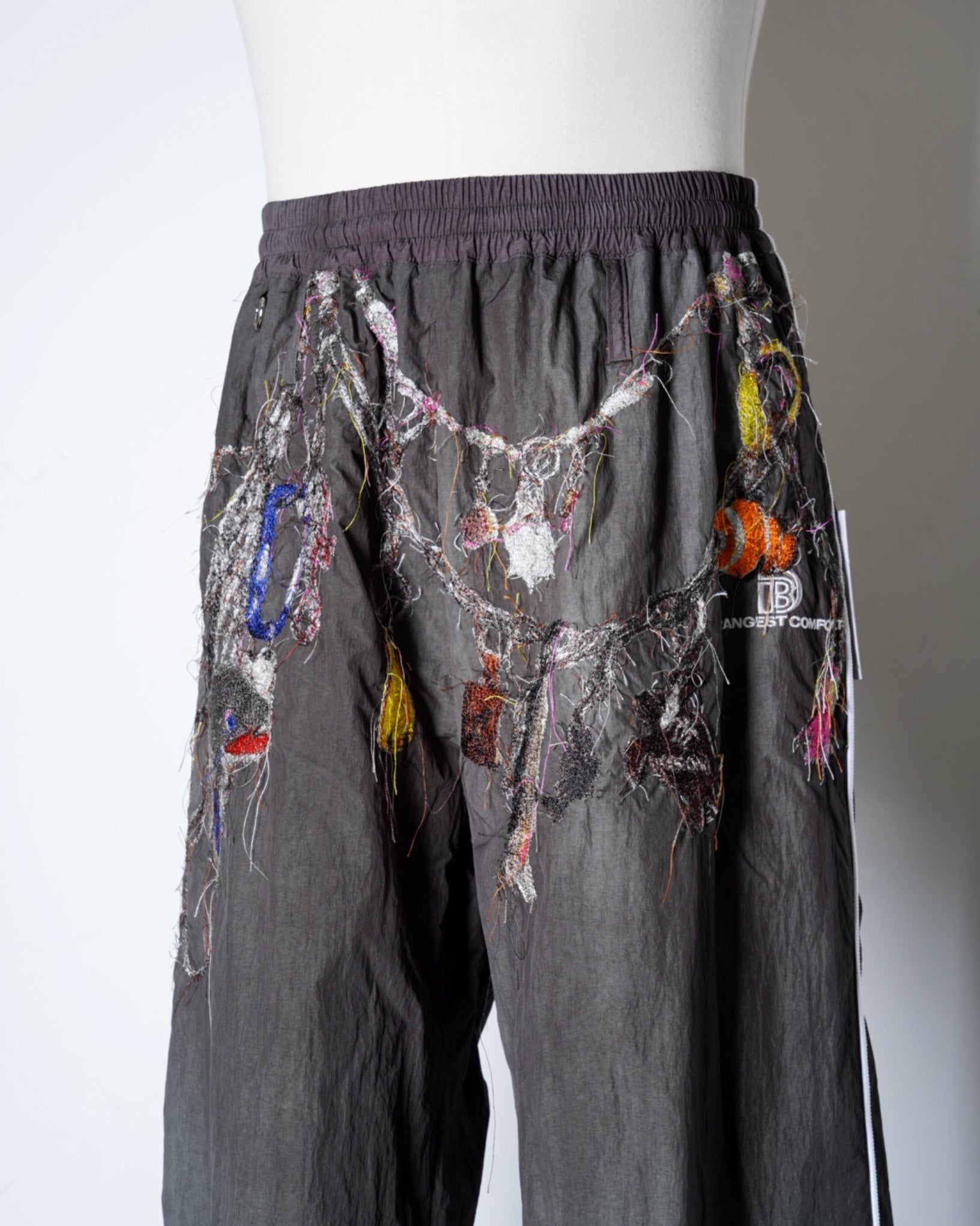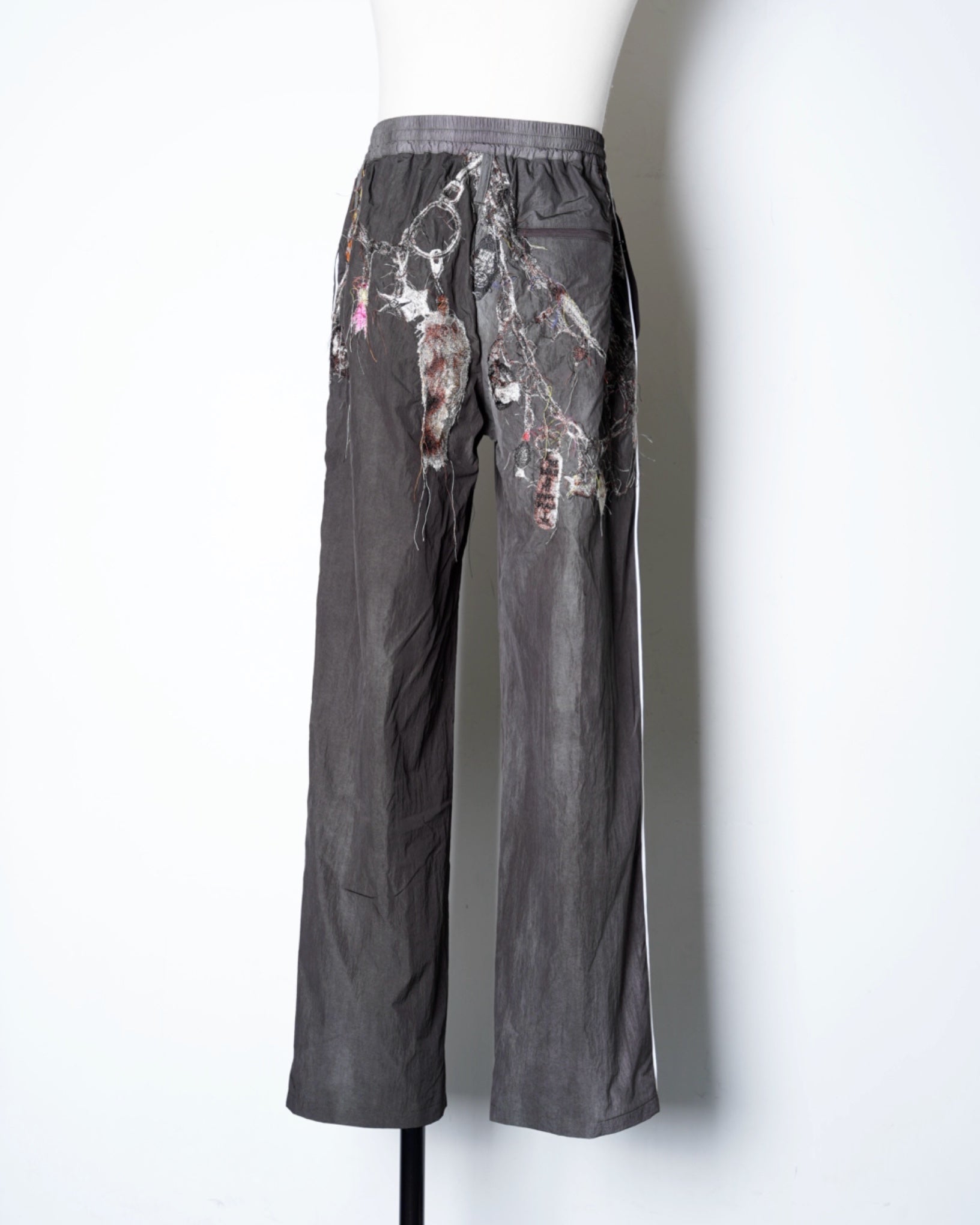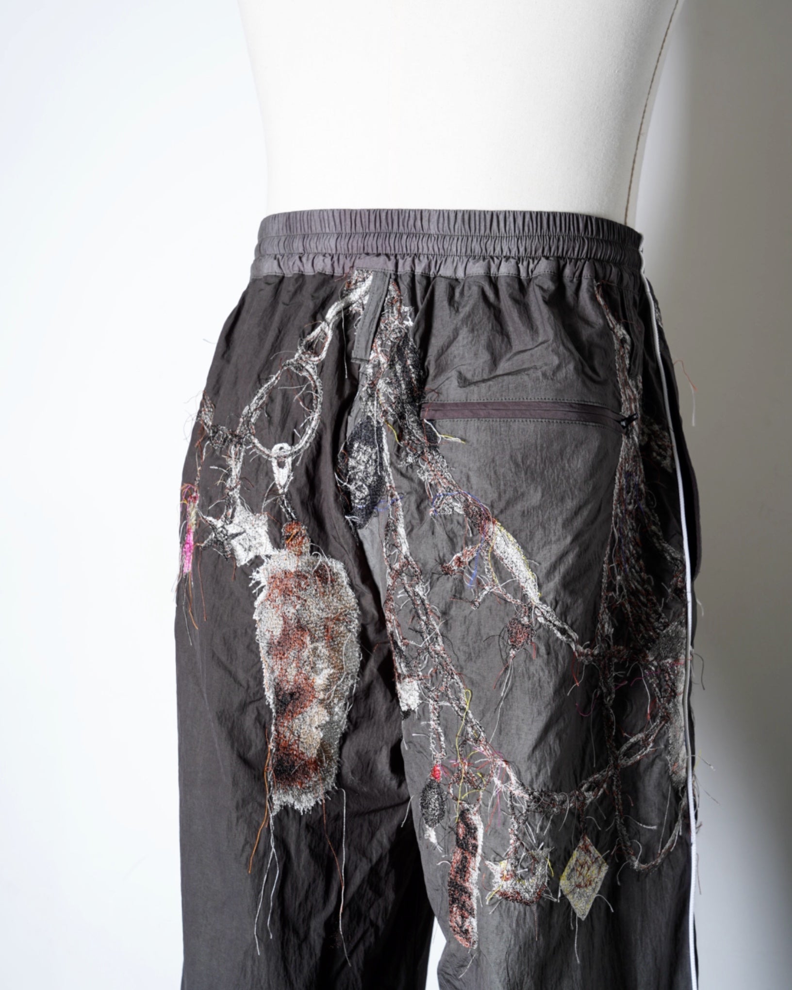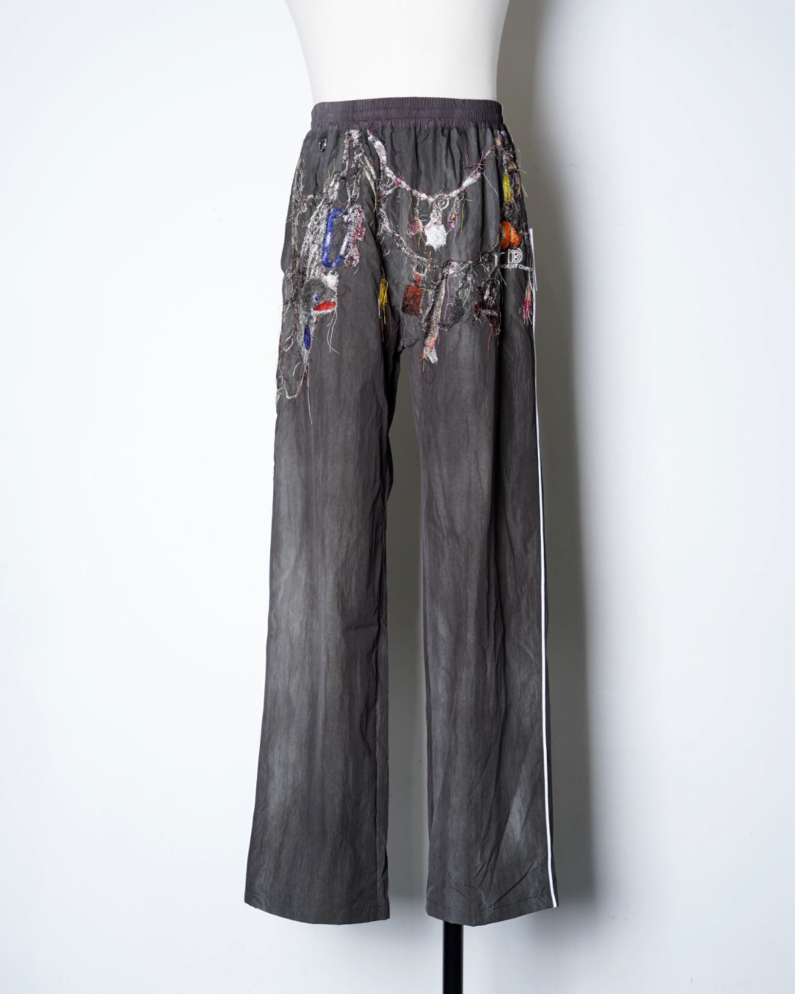 ・スプレーでムラ染め加工を施したナイロン素材のトラックパンツ。ポケットまわりには、魚やルアーなどのチャームを連ねたチェーンをリアルな刺繍であしらい、立体的な存在感を添えています。ジャケットとのセットアップも可能な一本です。