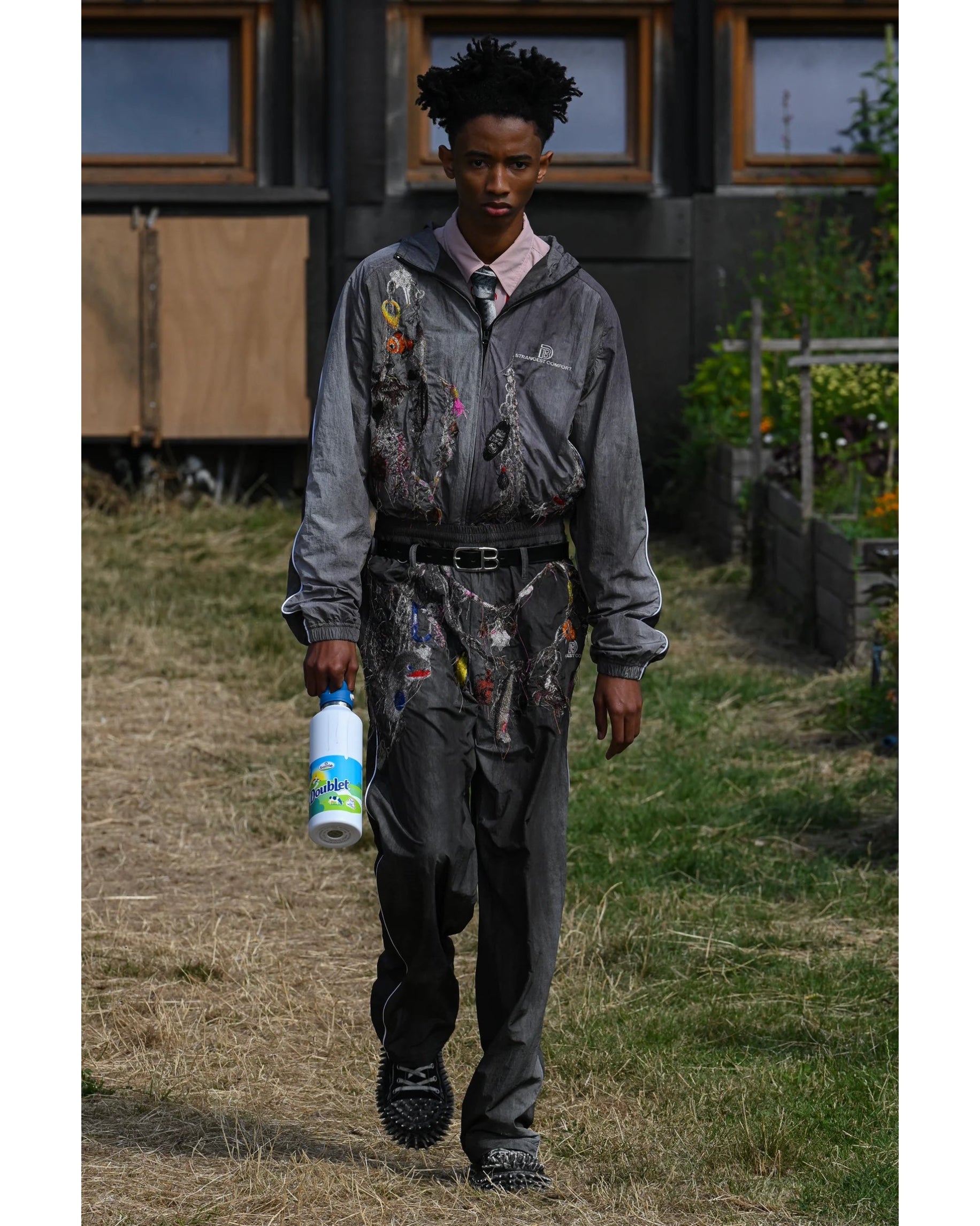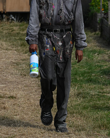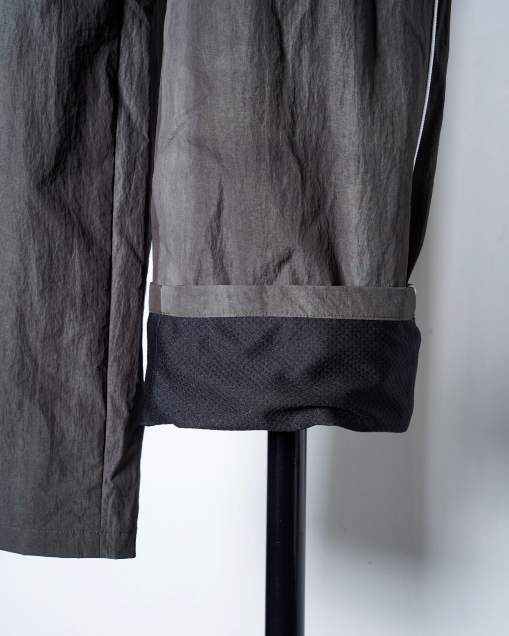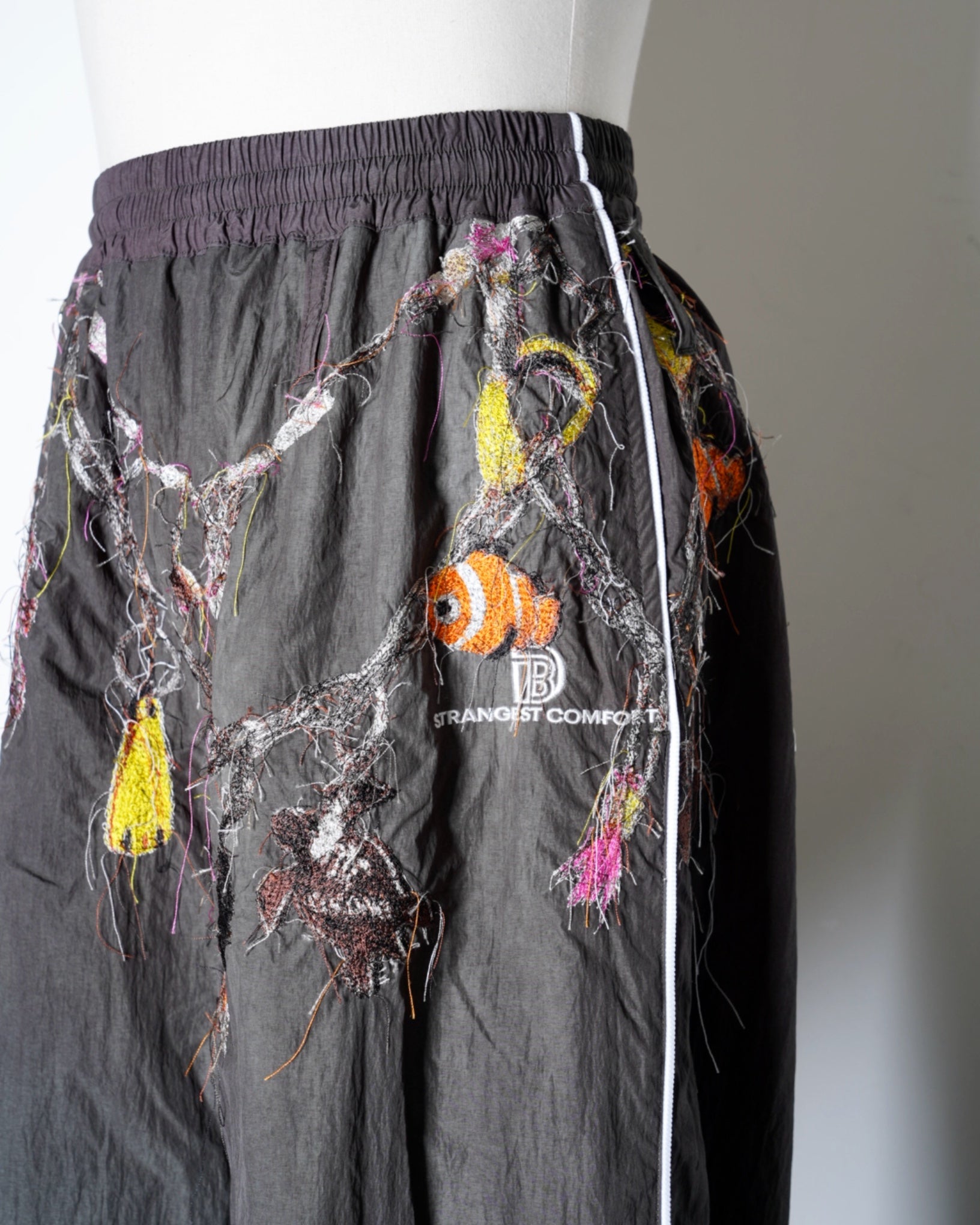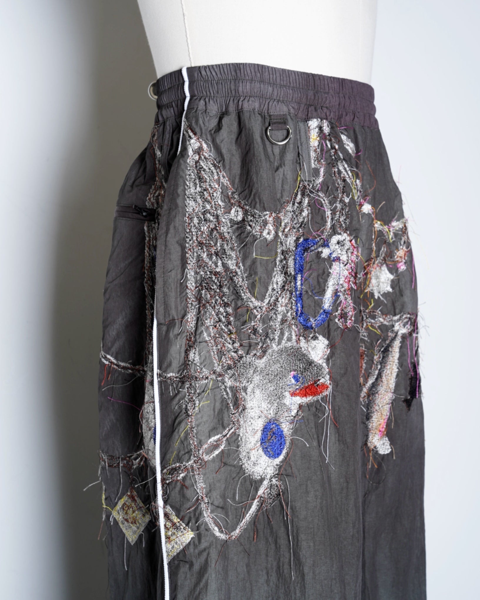 ・スプレーでムラ染め加工を施したナイロン素材のトラックパンツ。ポケットまわりには、魚やルアーなどのチャームを連ねたチェーンをリアルな刺繍であしらい、立体的な存在感を添えています。ジャケットとのセットアップも可能な一本です。