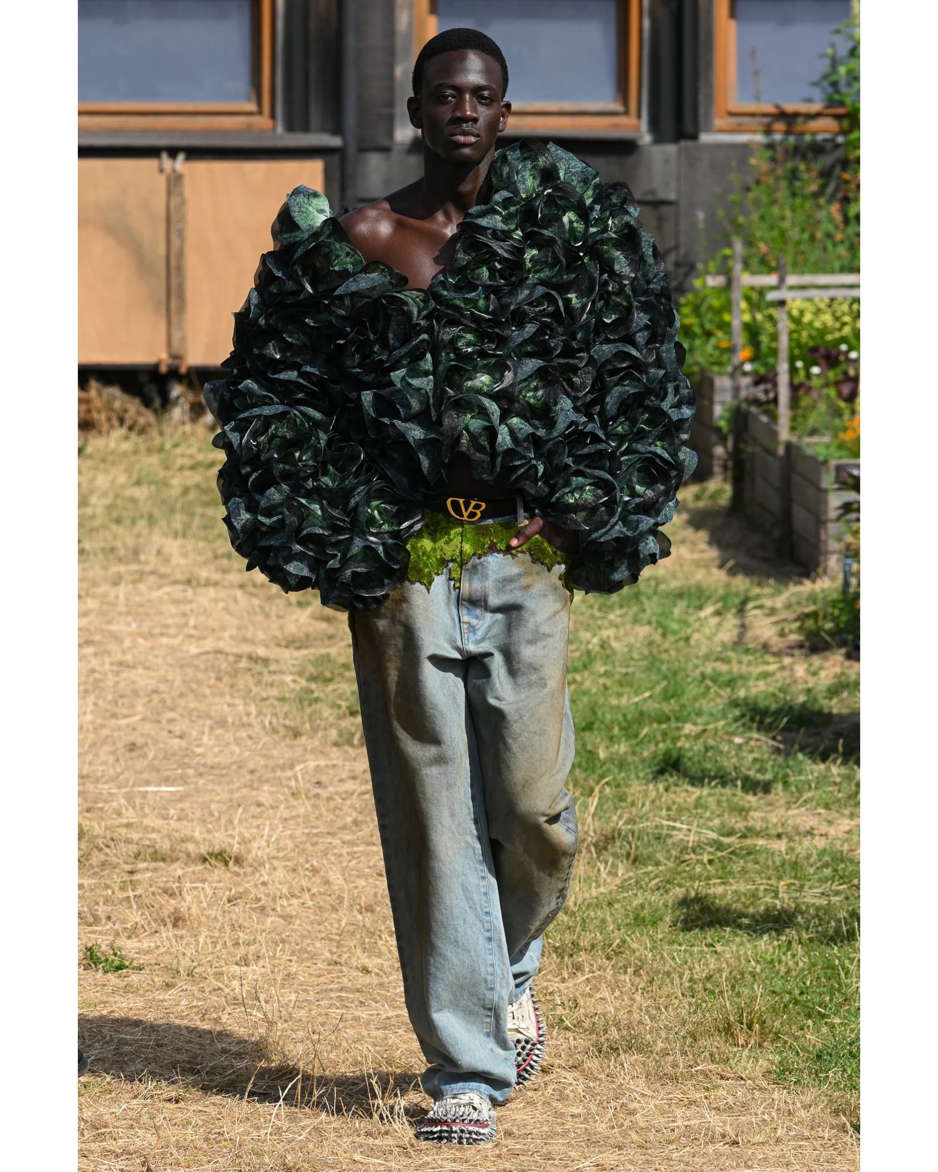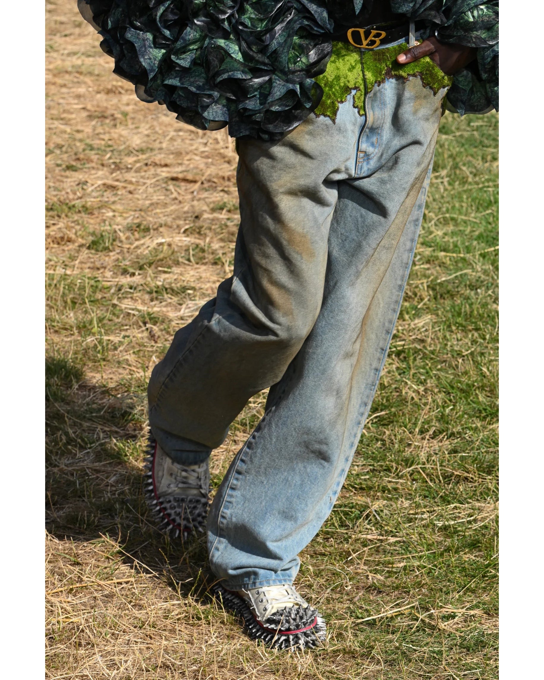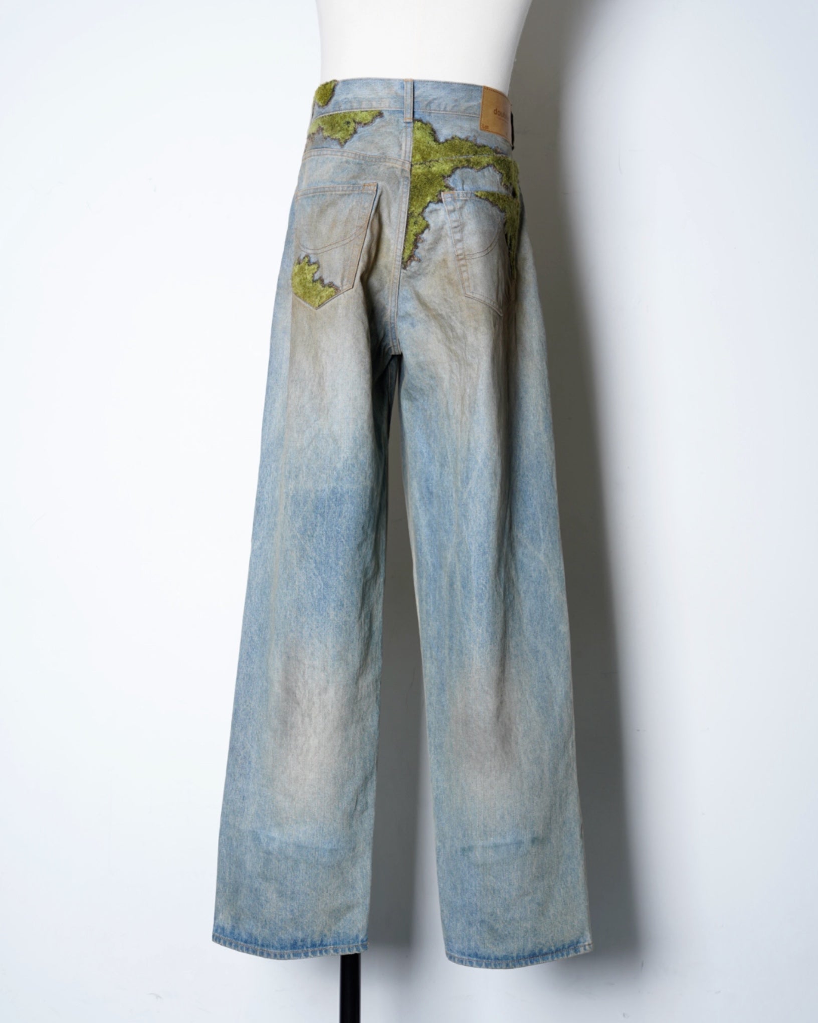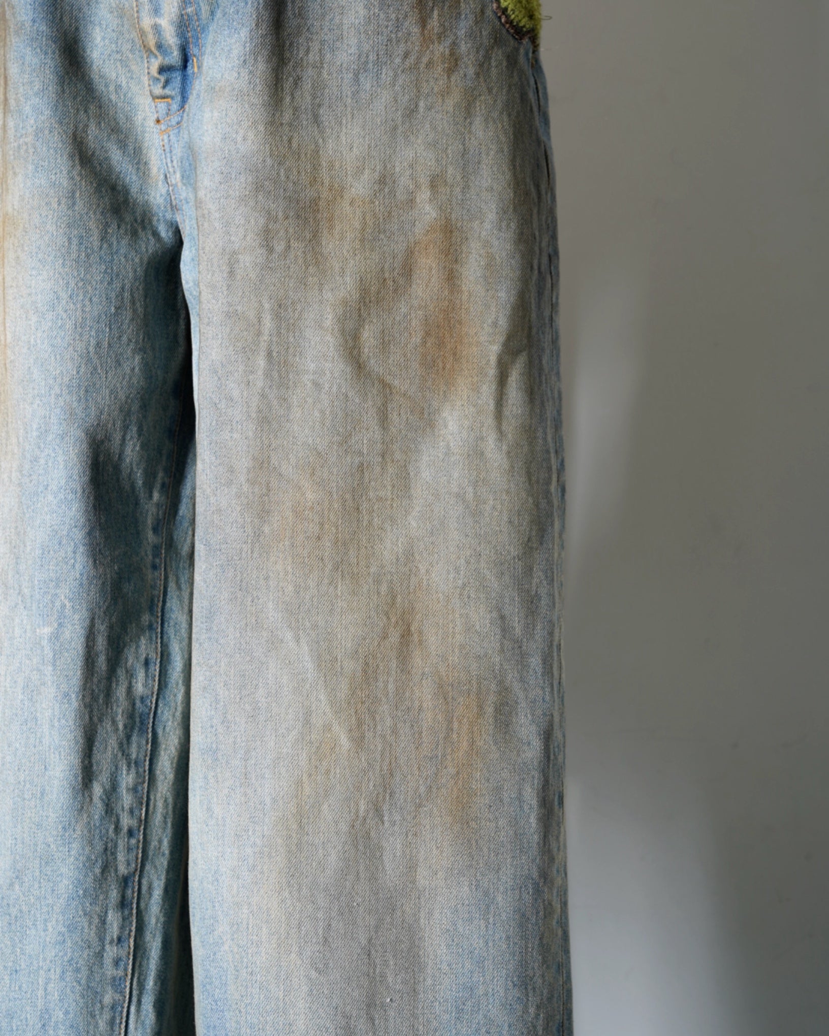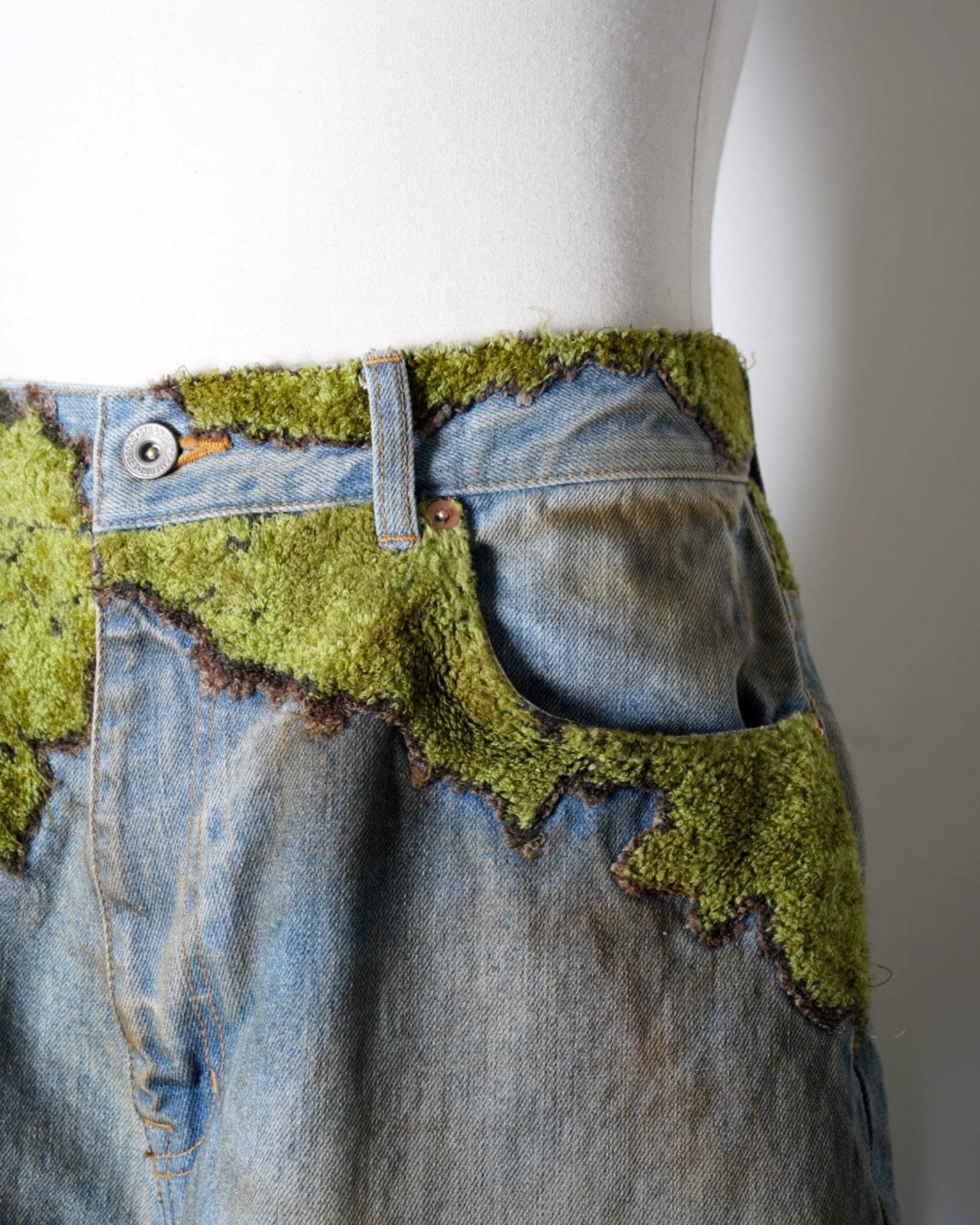 ・ユーズド加工を施したデニムに、苔のような立体刺繍を施したパンツ。ウエストやポケットまわりに自然と苔が生えたような表情を加え、まるで森に放置された作業着のような佇まいに仕上げています。