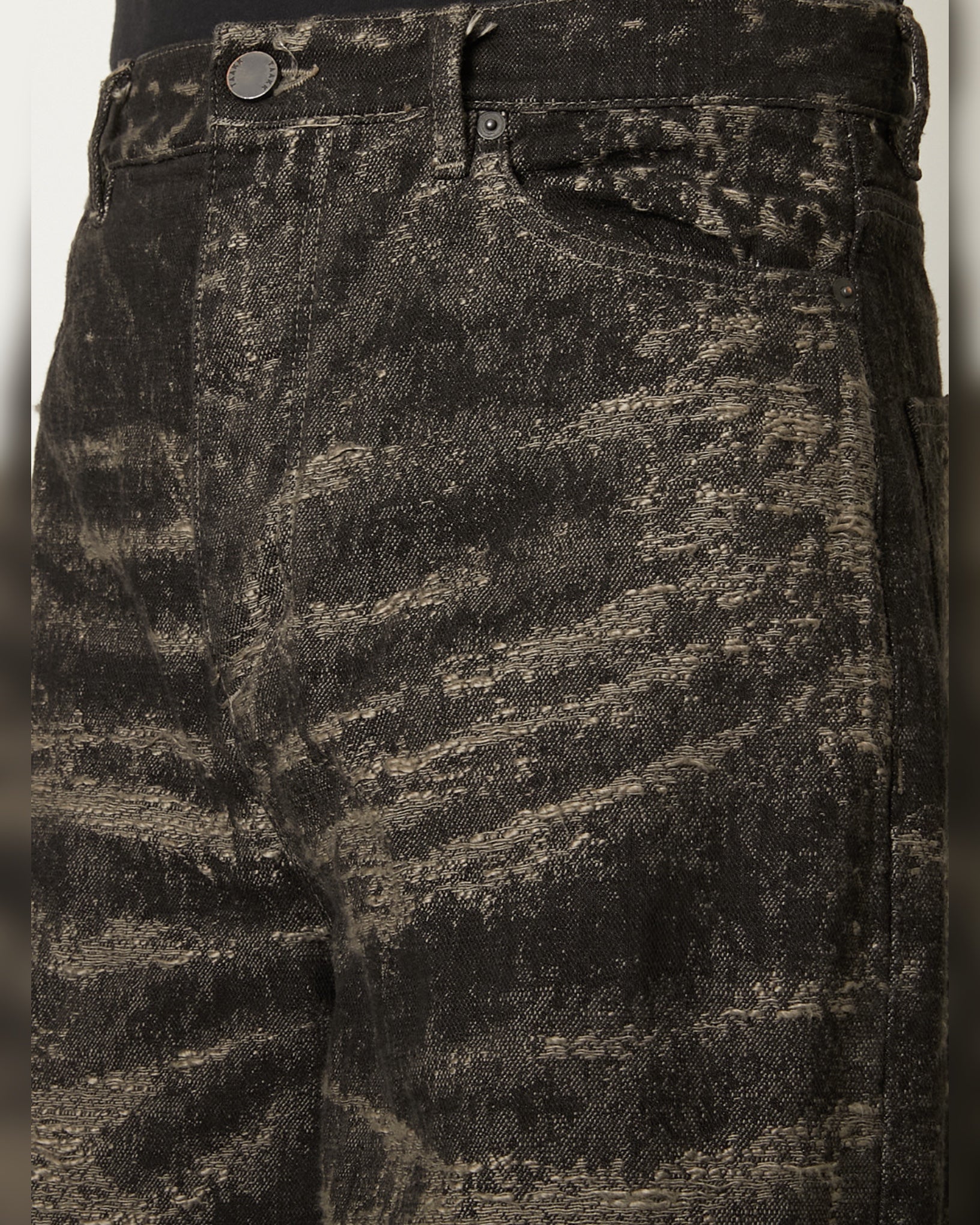デニムのジャガード織で縦落ちや経年変化の表情を表現した素材に、さらに加工を加えることで奥行きを強調。織組織と後加工が重なり合い、立体感と深みのあるデニム表情を生み出しています。