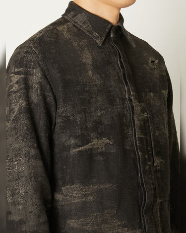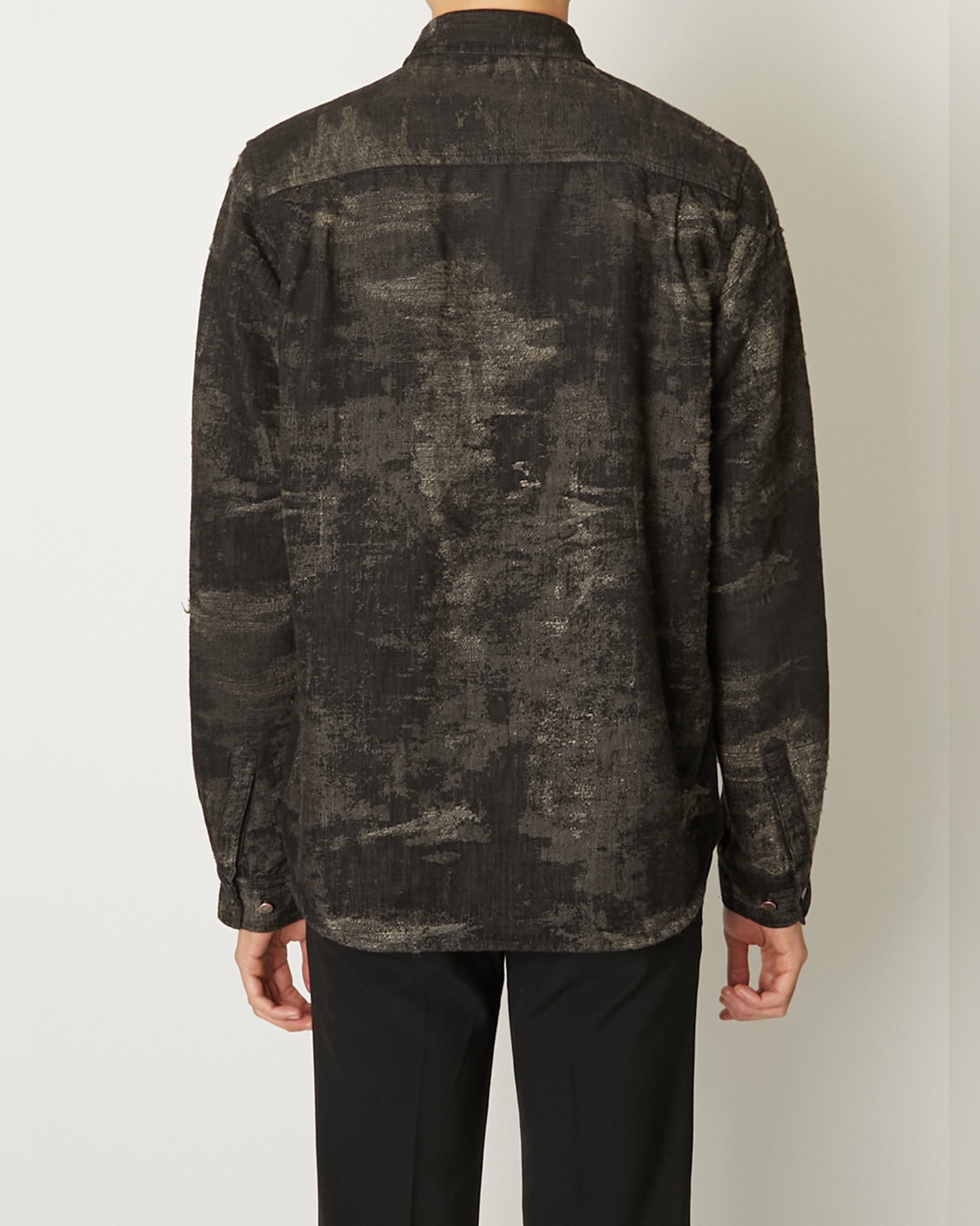 デニムのジャガード織で縦落ちや経年変化の表情を表現した素材に、さらに加工を加えることで奥行きを強調。織組織と後加工が重なり合い、立体感と深みのあるデニム表情を生み出しています。