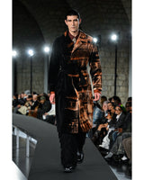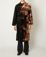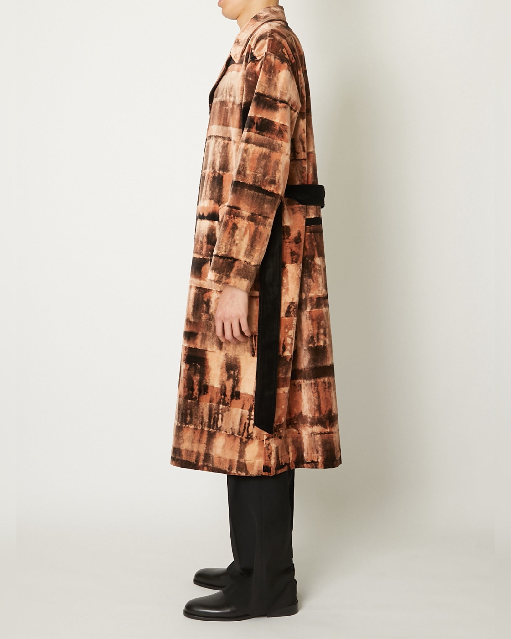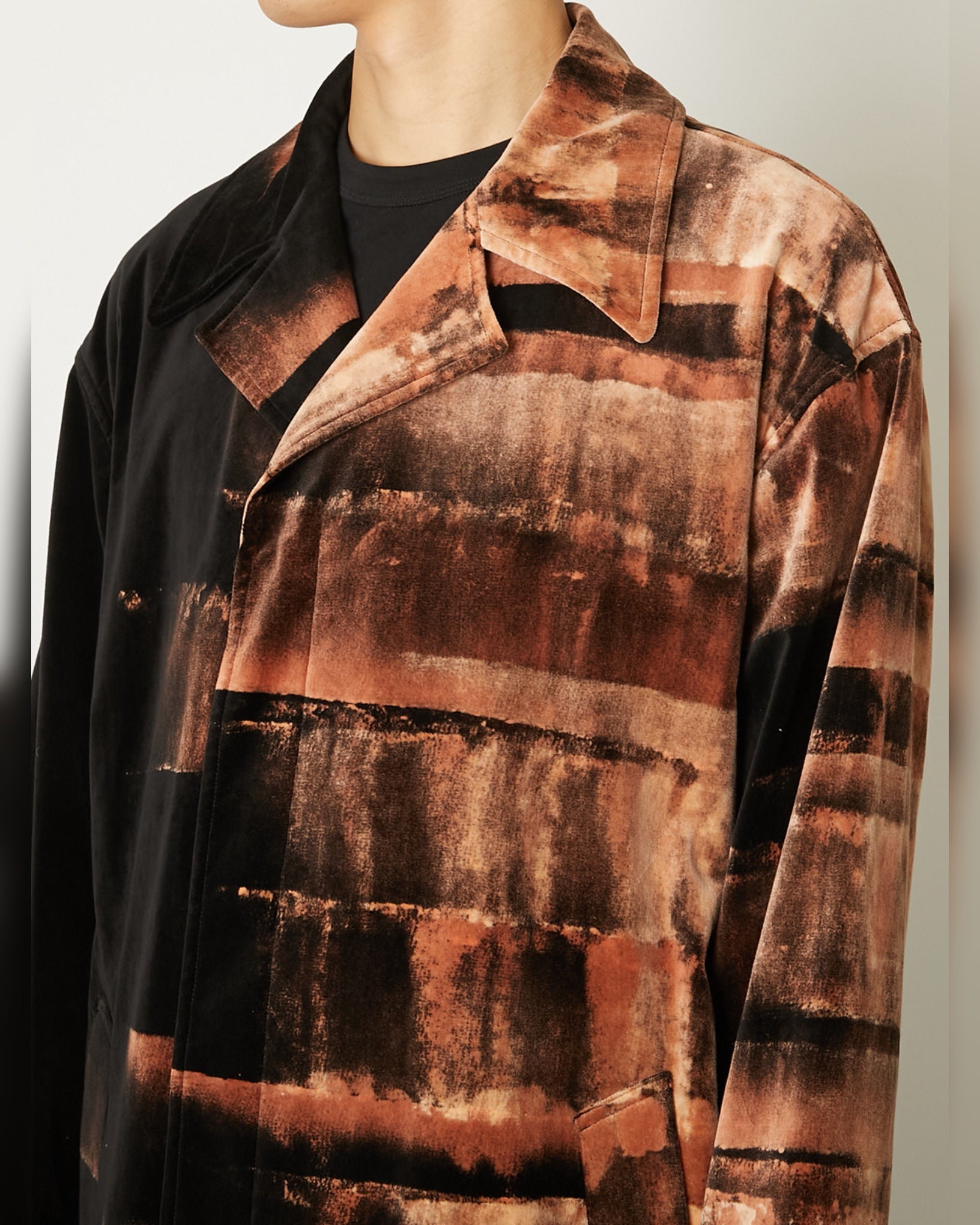 別珍素材に壁塗り用ローラースポンジでブリーチを施した単仕立てのコート。手作業ならではの濃淡やムラが一点ごとに異なる表情を生み、季節を限定せず長い期間着用できる軽やかさも備えている。